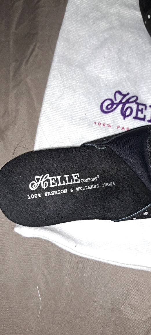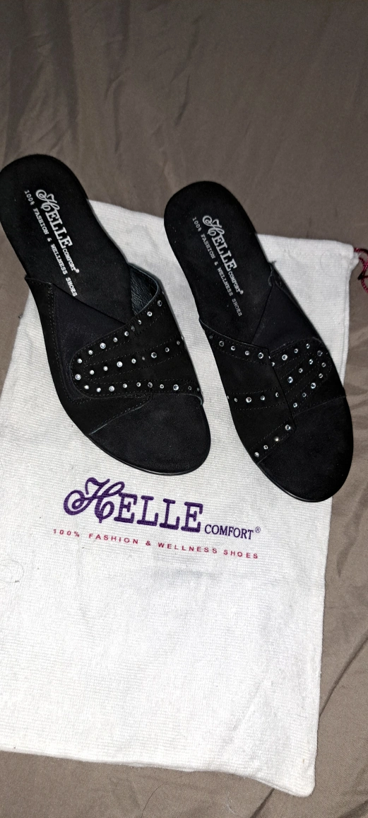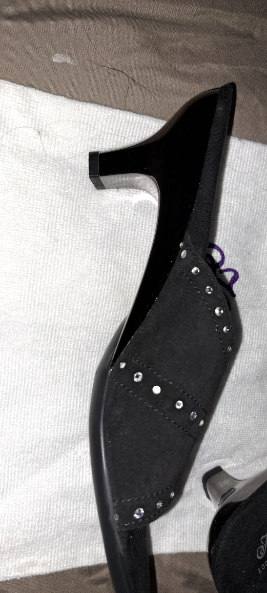 accentuate your evening party with this pair of Helle shoes almost like brand new very clean no smudges used only once in a 16th bday party ๐ black suede cloth with velcro and multi stud stones I can't wear heels anymore cash only pick up only true to size 7.5 box and shoe bag included original price in Danforth $113