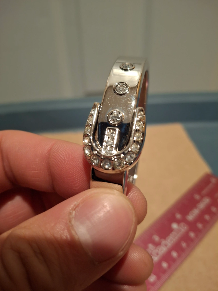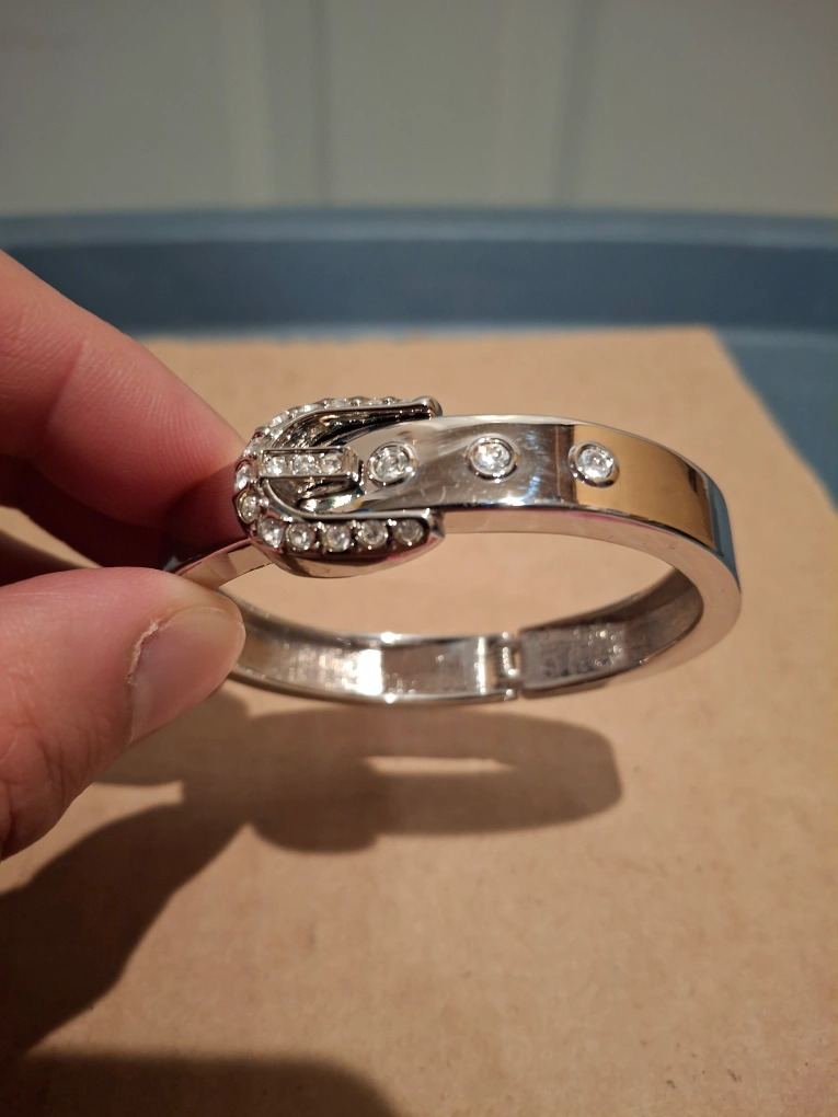 This is a silver bangle bracelet with a buckle-style clasp. It has clear rhinestones around the buckle and on the band.