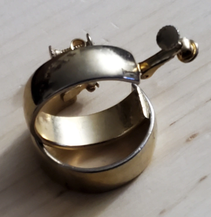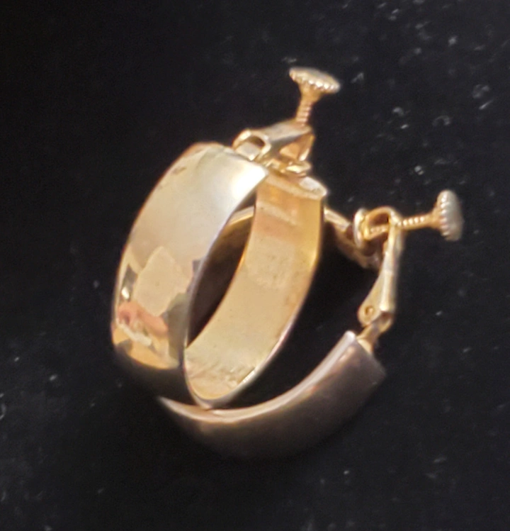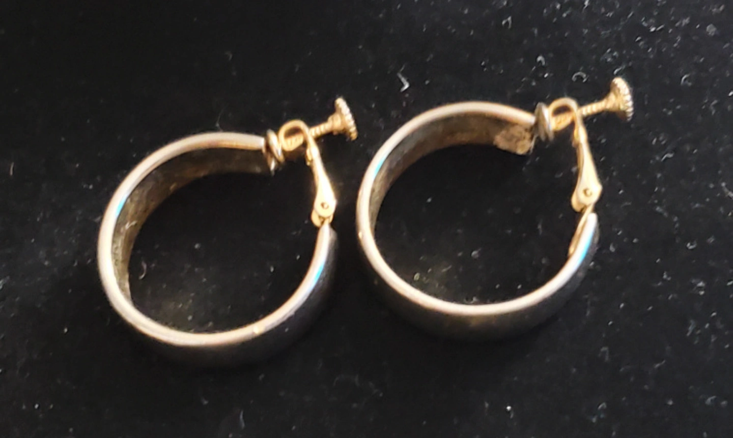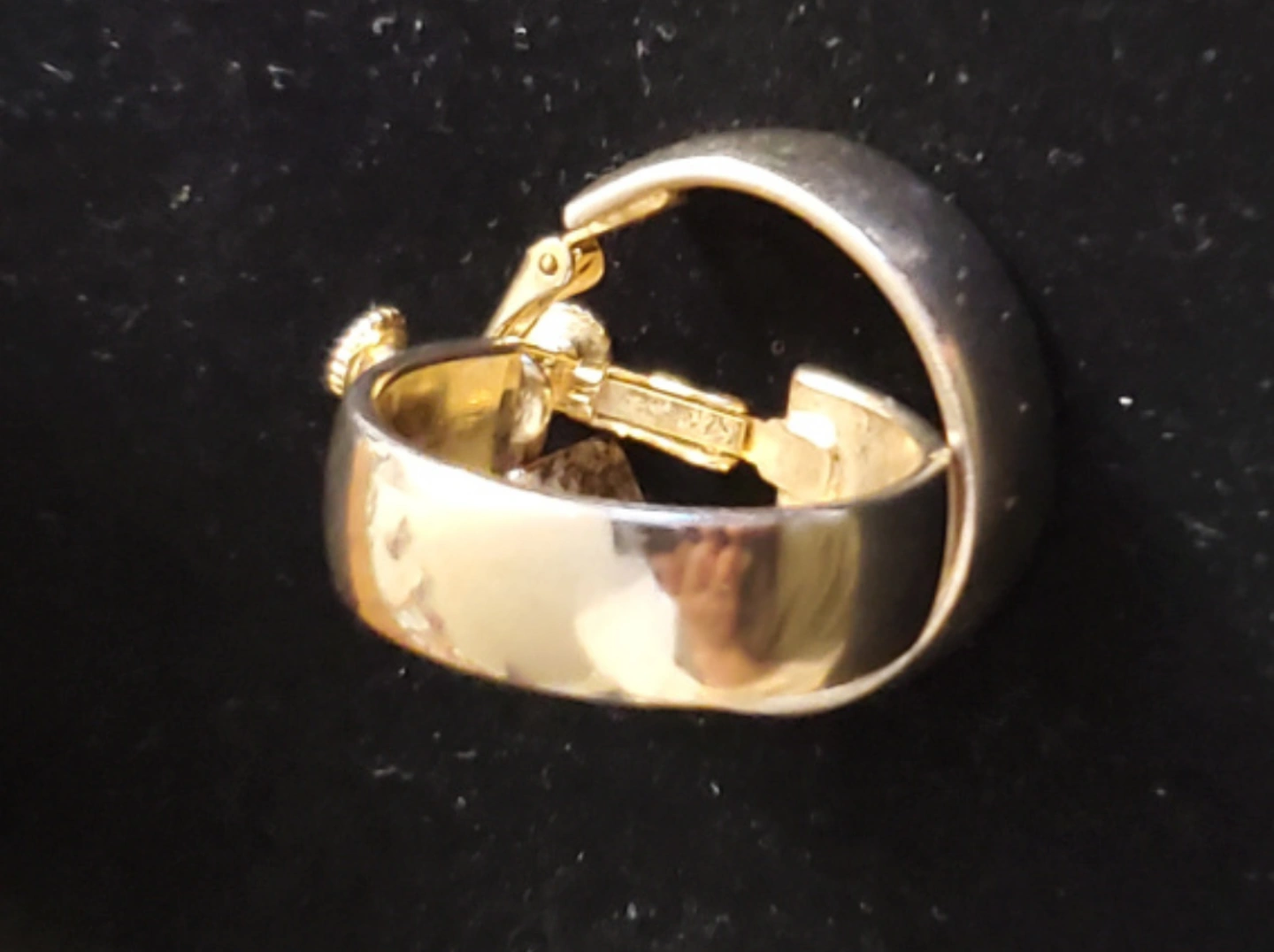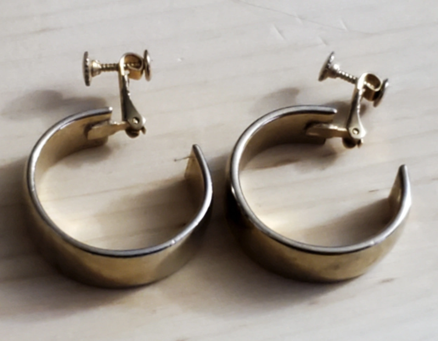 Mid century vintage. Pair of gold plated clip on earrings. The earrings are a wide hoop design. These would look great with a dressy outfit.