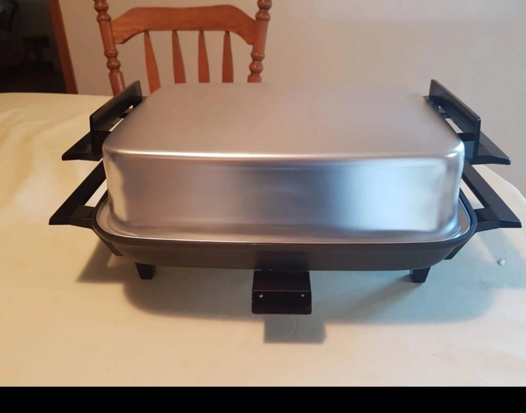 Can be used for baking, grilling, roasting, frying, and warming, Comes in its original book with an instruction book. Includes serving tray and wooden carving board. Cones from a smoke & pet free home. Pick-up is Whitby