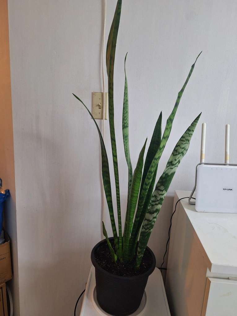 This is a large Snake Plant in a black plastic pot. It is approximately 40 inches tall. It has been well cared for and is in good health. It is a great plant for beginners. It is very low maintenance and can tolerate a variety of light conditions.