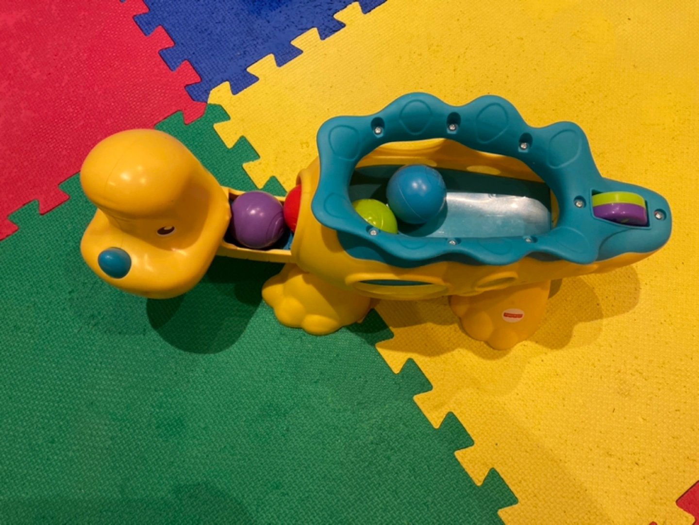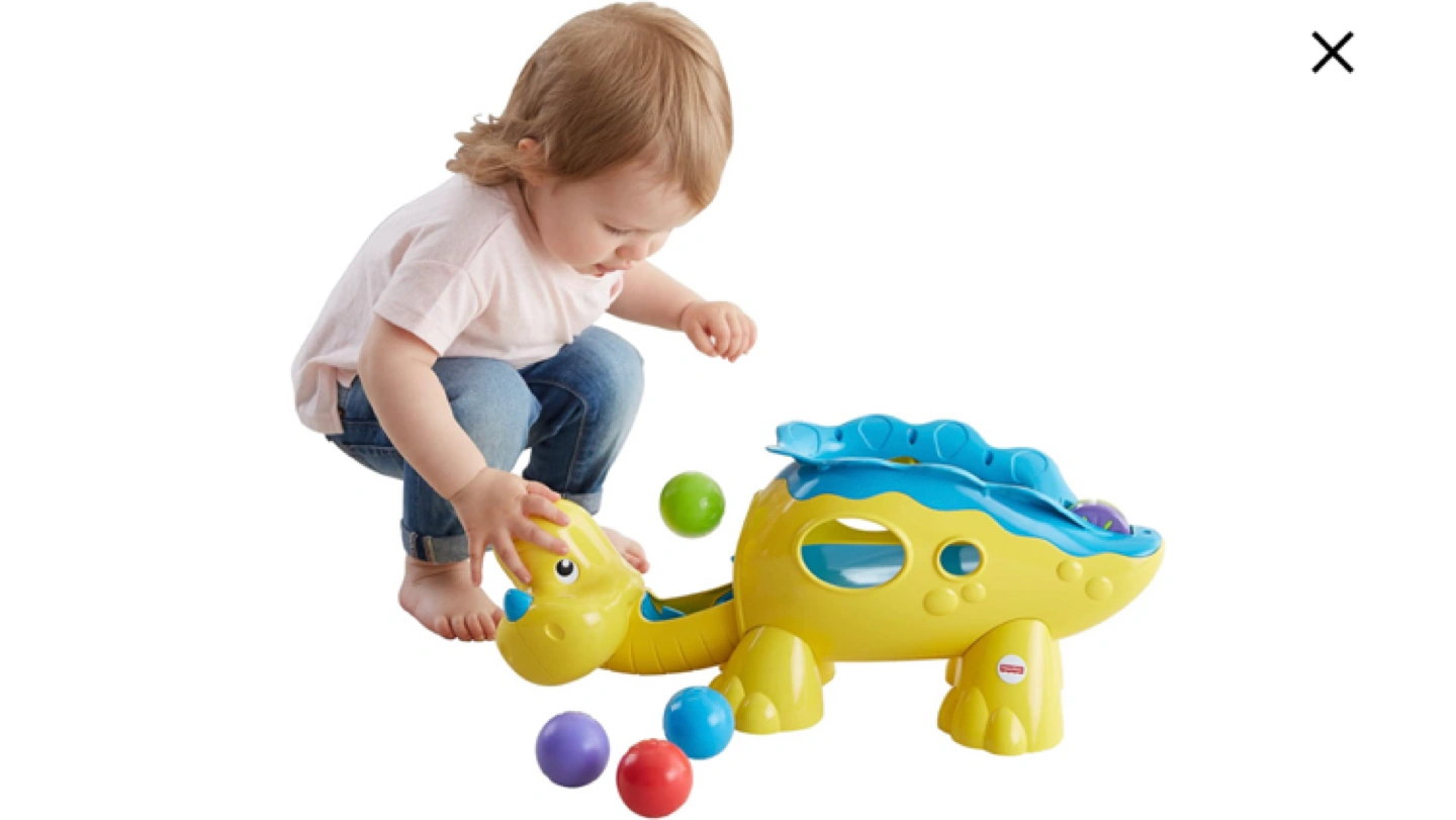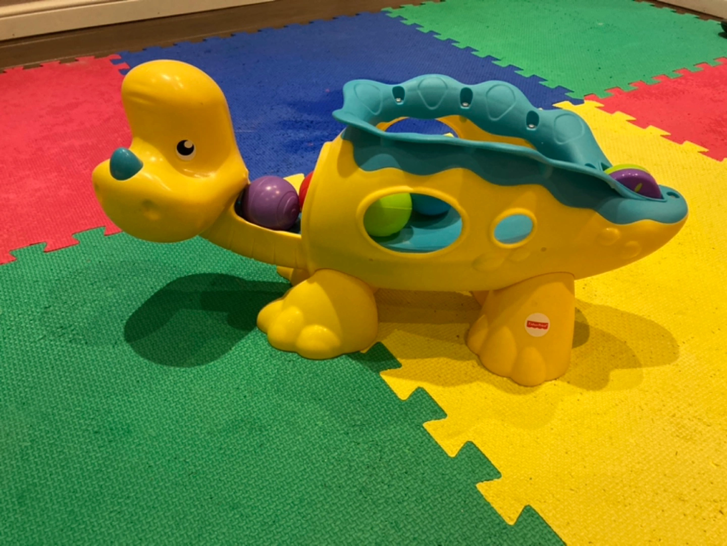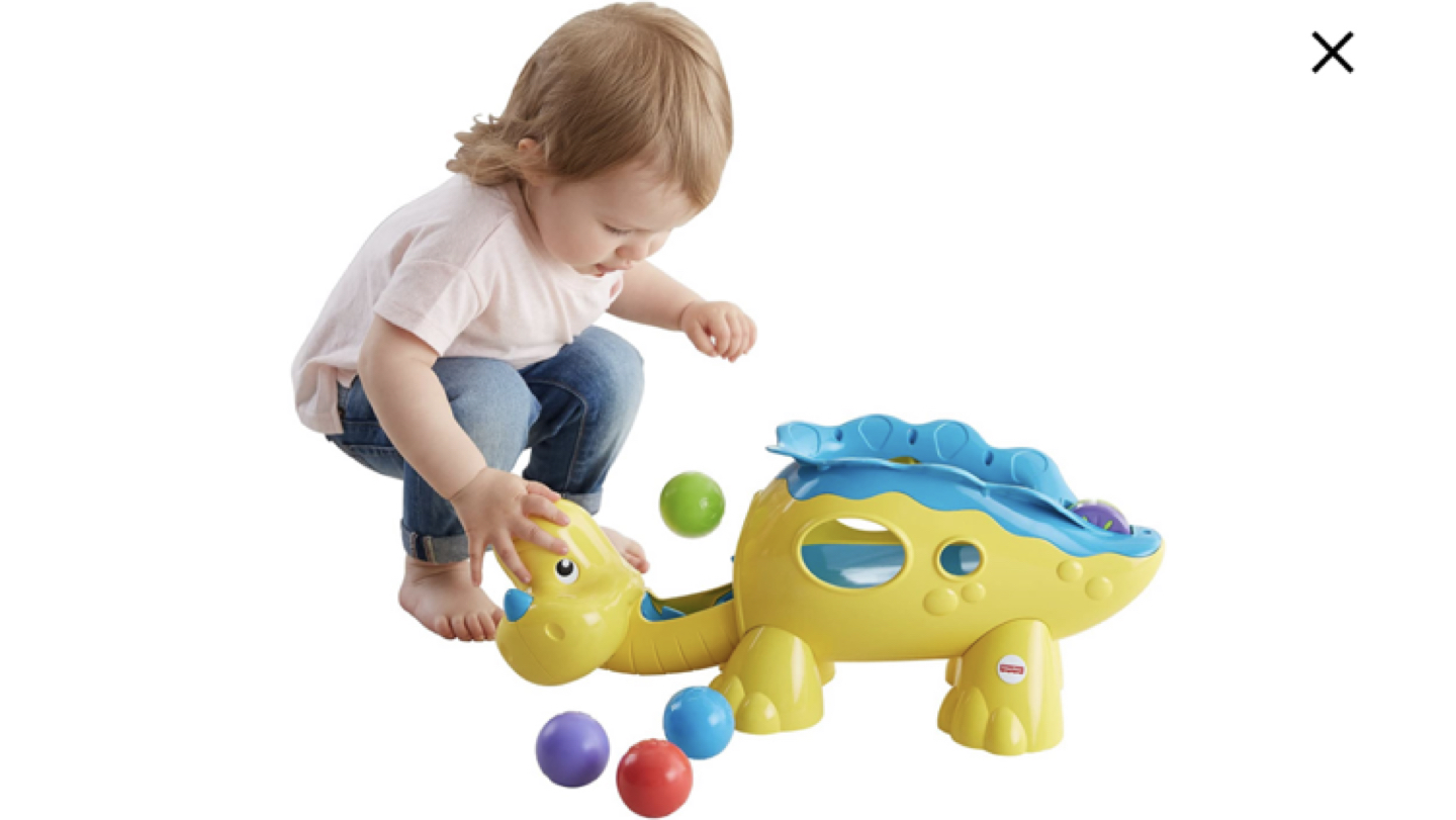 Features ● Push the dino’s head down to pop the balls up and over, into his belly ● Watch the balls roll down into his belly, ready to be launched again! ● Engages your little one in push, pop & roll play that can last all day! ● Spinner on tail for added fun ● Includes 4 colorful balls