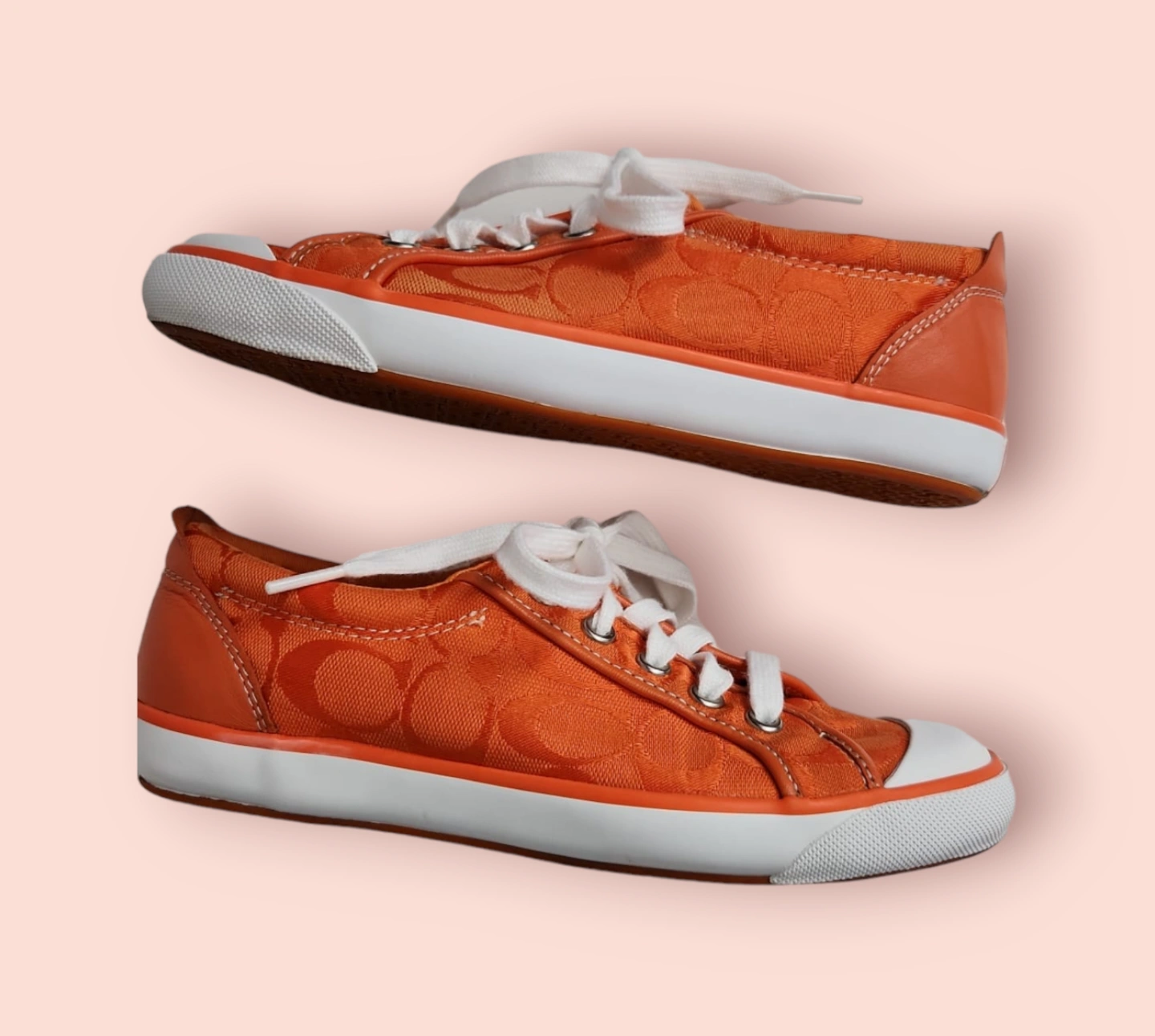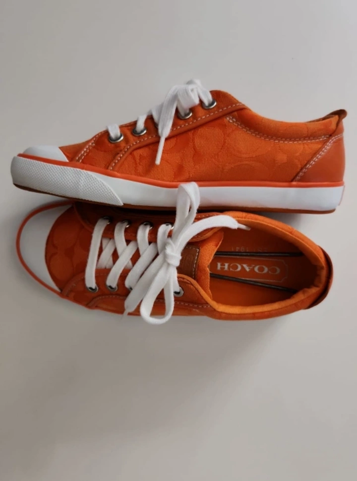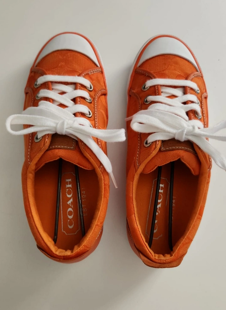 Orange canvas Coach sneakers with white laces and orange soles.
