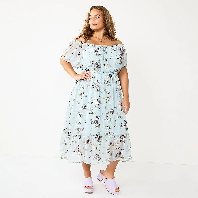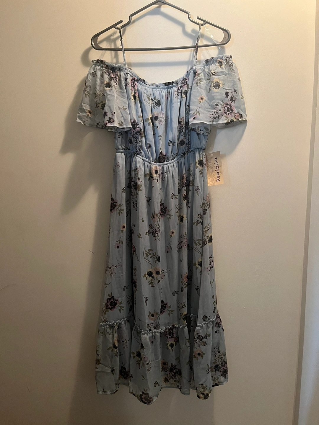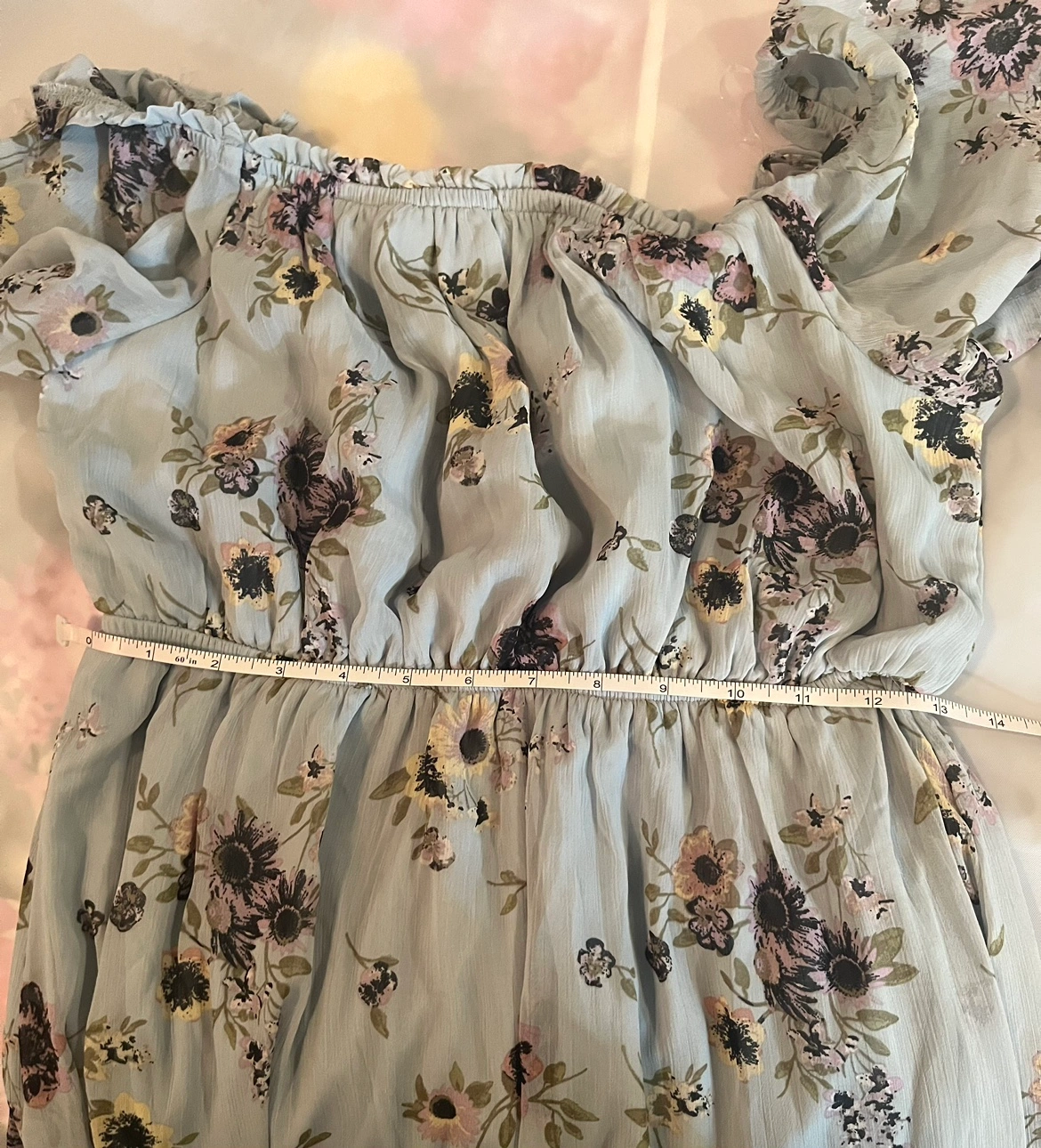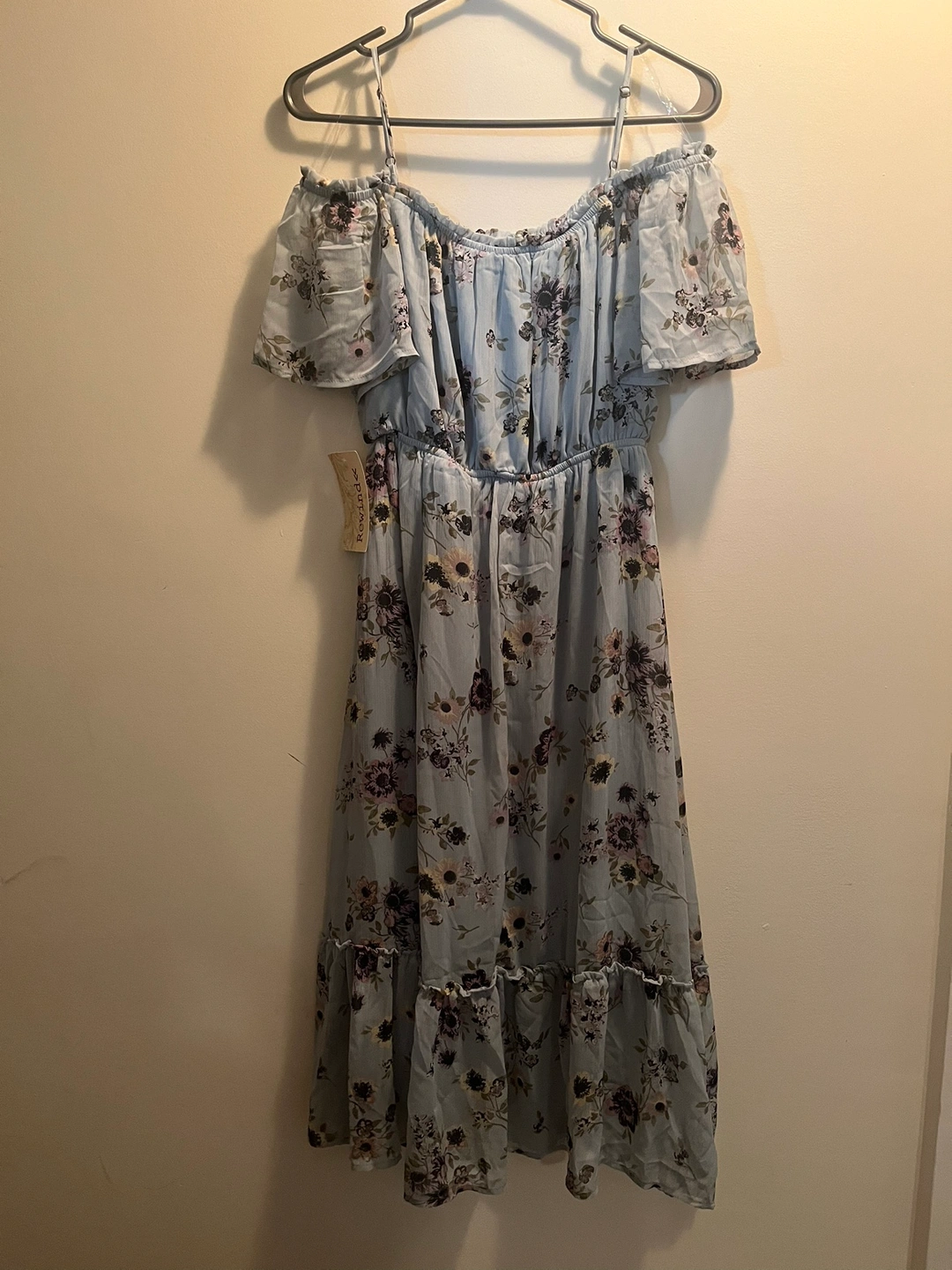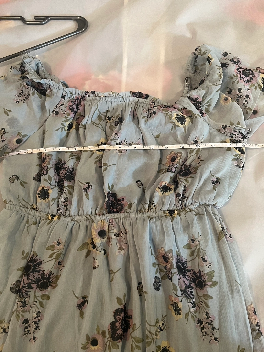 Brand new Pickup Brampton or downtown Toronto Measurements are pictured laid flat Approximately 21” Ptp WITH STRETCH! The black dress is just to show how it would look from the back and in video form, actual blue dress as pictured Taken from the website: FEATURES A-line silhouette Yoryu chiffon construction Tiered hem No closure - pullover styling Cold-shoulder sleeves Short sleeves Fully lined Off-the-shoulder neckline FIT & SIZING 48 1/2-in. length from shoulder to hem Midi length hits below the knee Elastic waistband FABRIC & CARE Body & lining: polyester Machine wash delicate