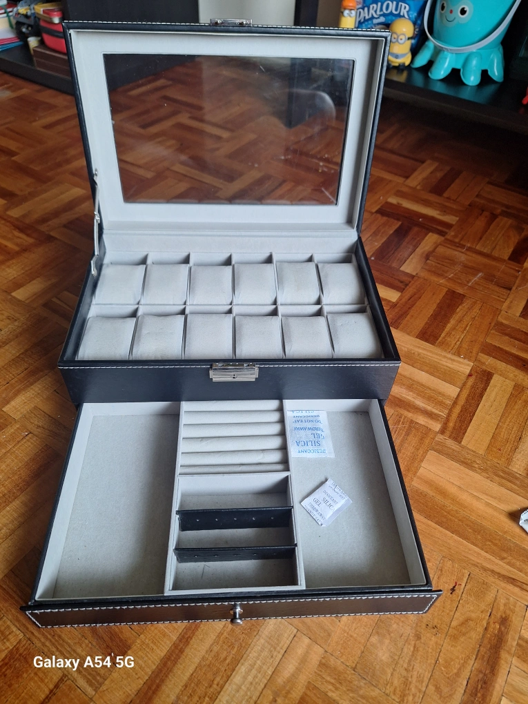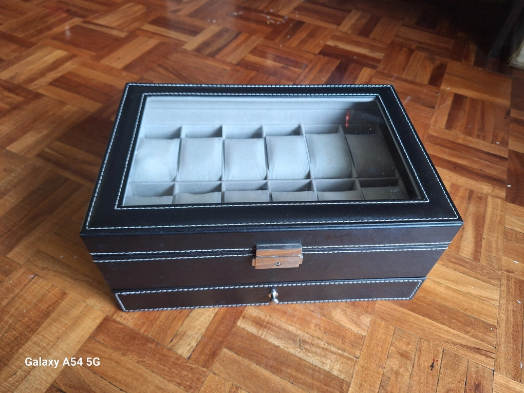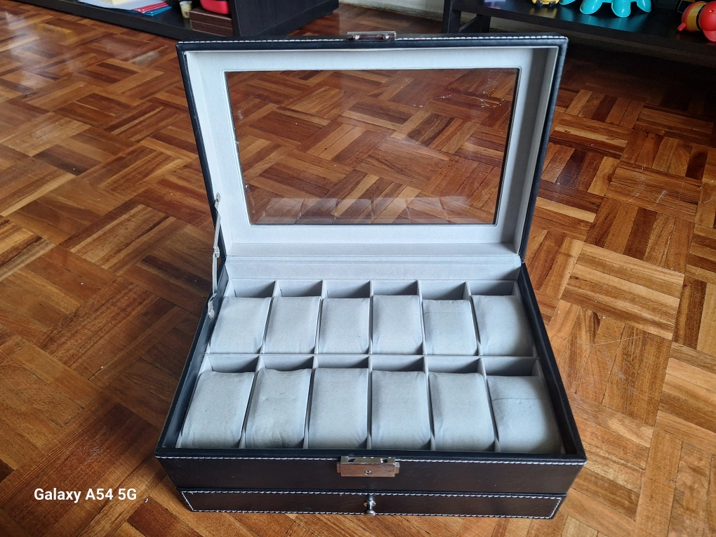 This is a watch box that has been used very gently, and that can hold up to 12 watches. It features a glass top and a lock and a key. It also has a pull-out drawer to store other accessories.