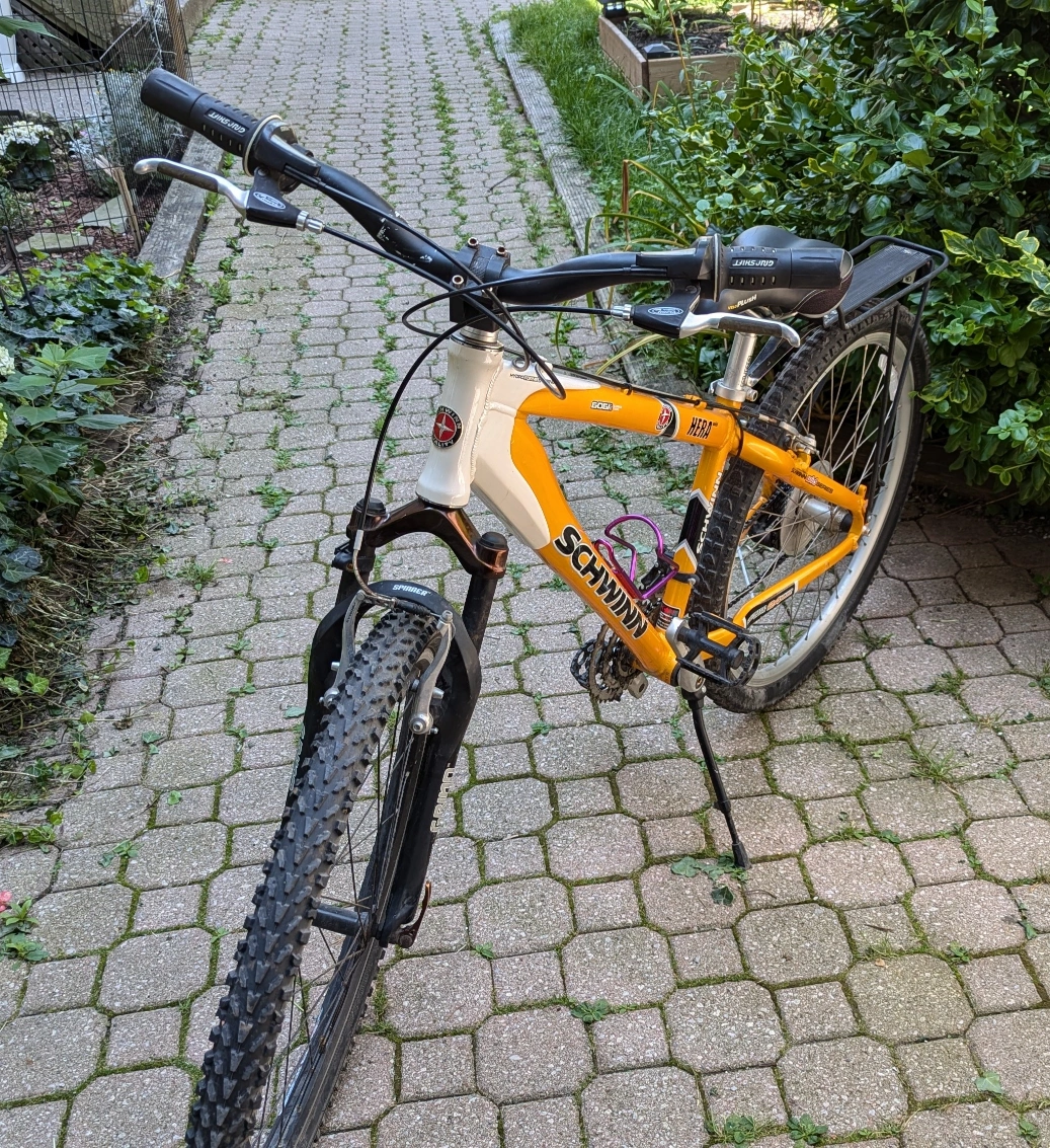 Schwinn Yellow and white mountain bike with front suspension. The bike has a rear rack. 15" Frame. Good Condition.