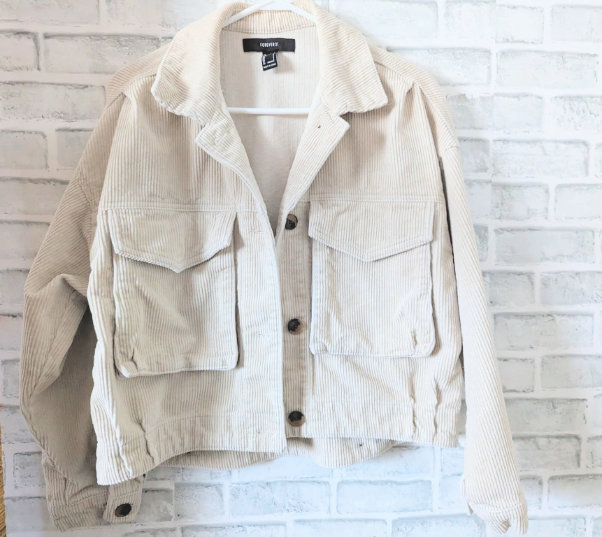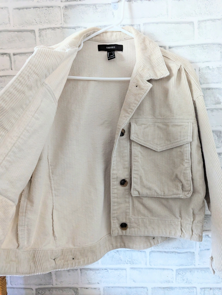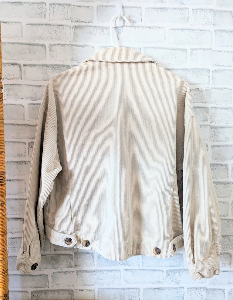 Cream coloured corduroy jacket with two large pockets on the front. Great corduroy texture, with a vintage-modern look. Button up closure. Fixed Price