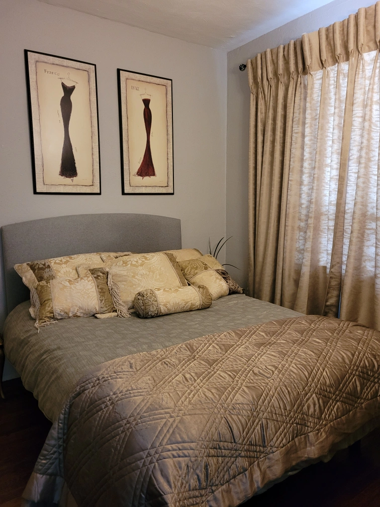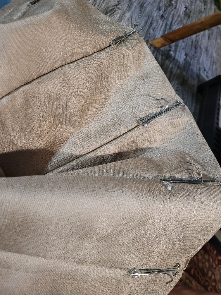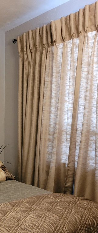 A set of 4 panes of 92 inches long curtains. the lighting doesn't do justice, it is a beautiful golden colour. Hooks are stitched on, see photo. It used to be in the Paris themed room in my airbnb that I no longer have. We got many compliments on it. pick up in Westwood or delivery for an extra fee