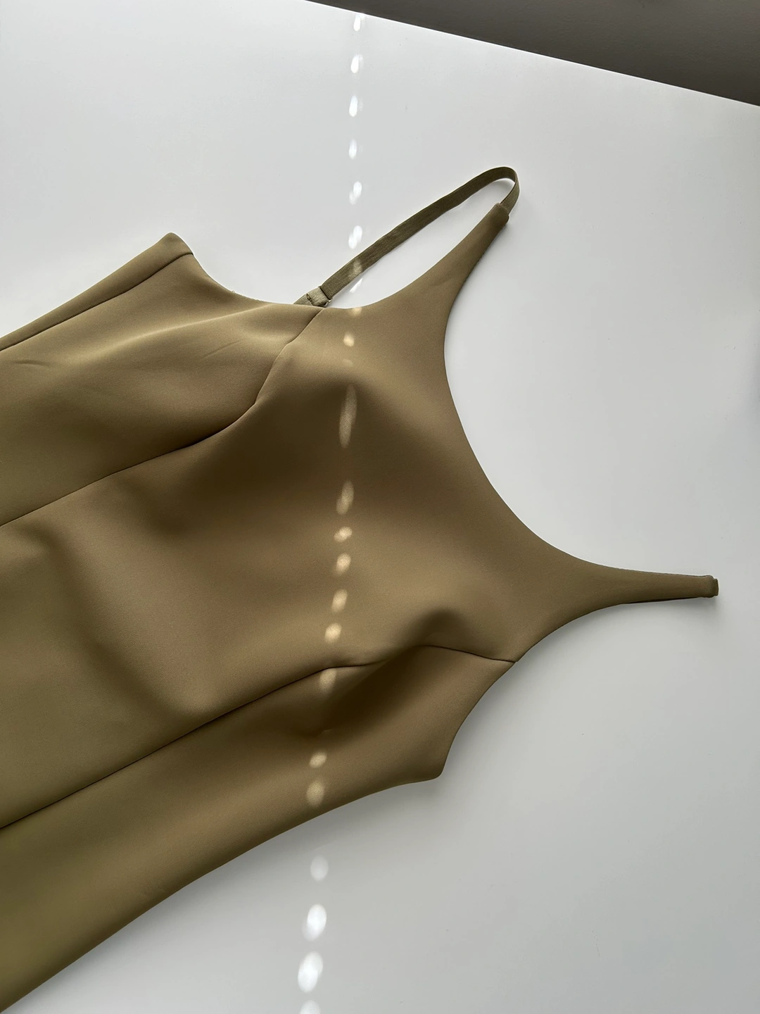 New, never worn Snug around the body, nice thick fabric Color is like forest/moss green Adjustable straps, zipper in the back Bit too small for me that’s why selling Sold originally for around $150