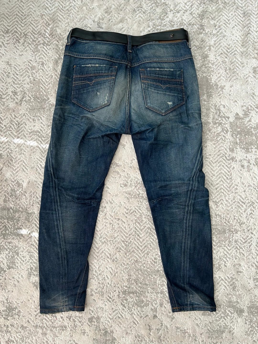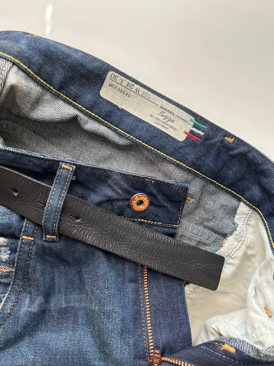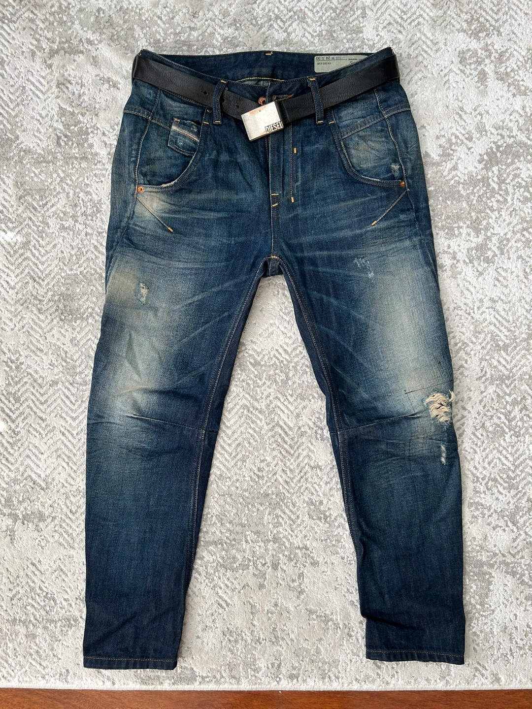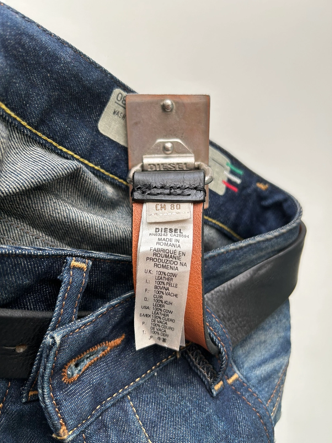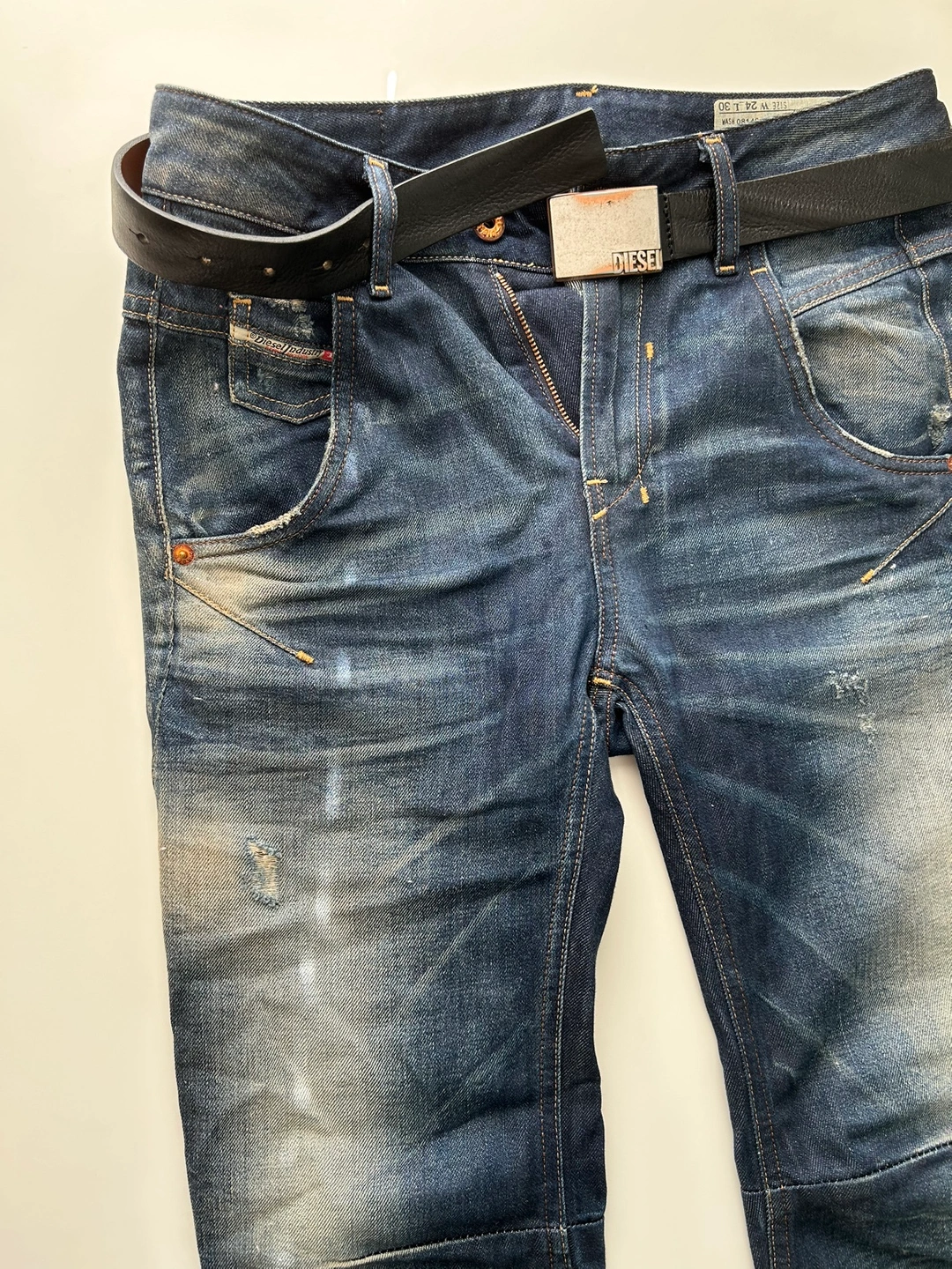 Bought from Diesel store for around $400 total Worn 2-3 times. No longer can fit into them They are interesting boyfriend style, baggy on top and slim at the bottom Selling jeans: 120$ Selling genuine cow leather belt : $80 Or both for $130 Jeans are relaxed boyfriend low waist Faiza W 24 L30 Belt CM 80 (XS-S)