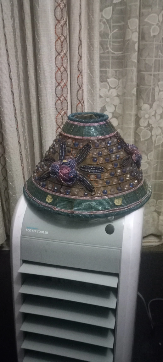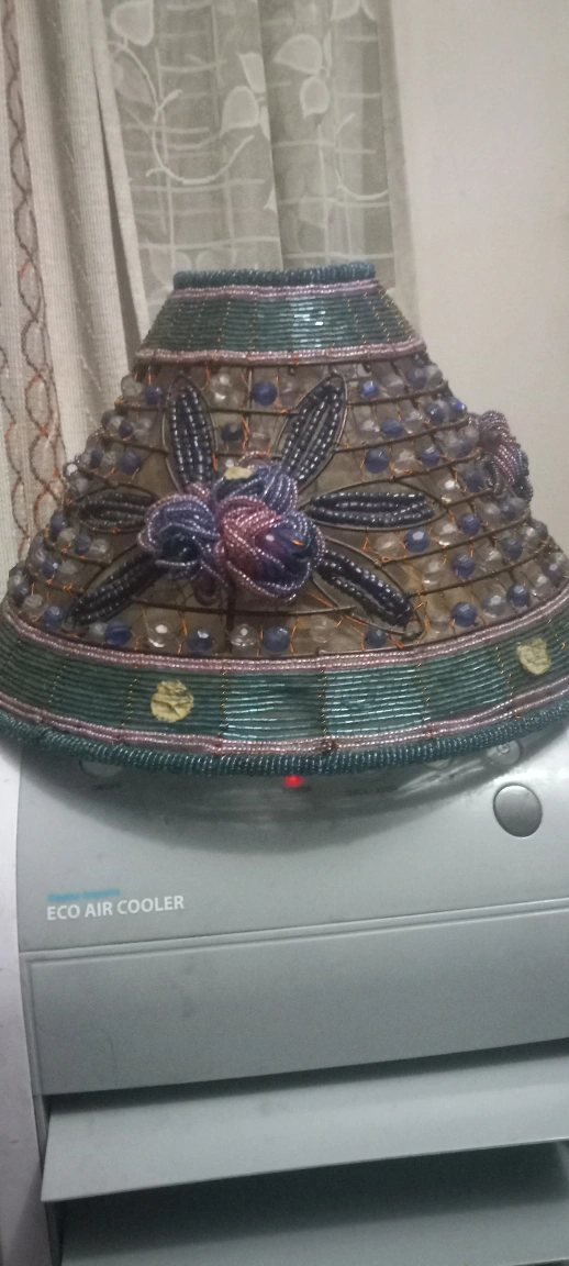 This lamp shade is beaded and features a floral design with blue, purple, and pink beads.