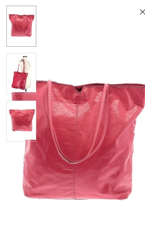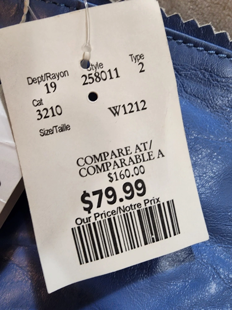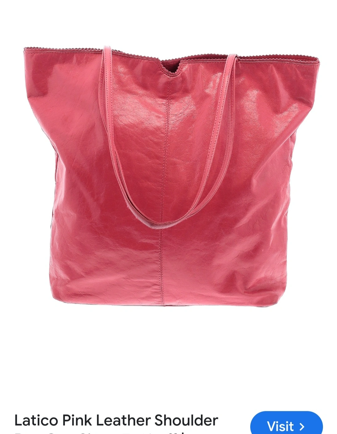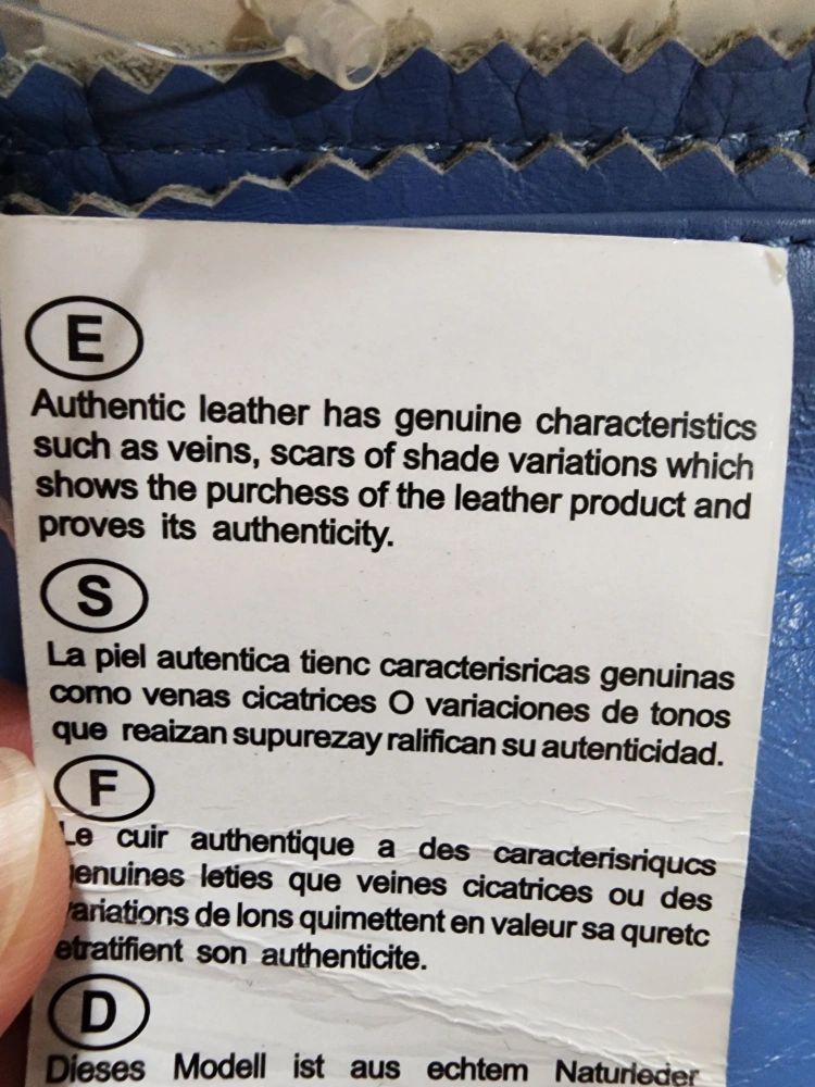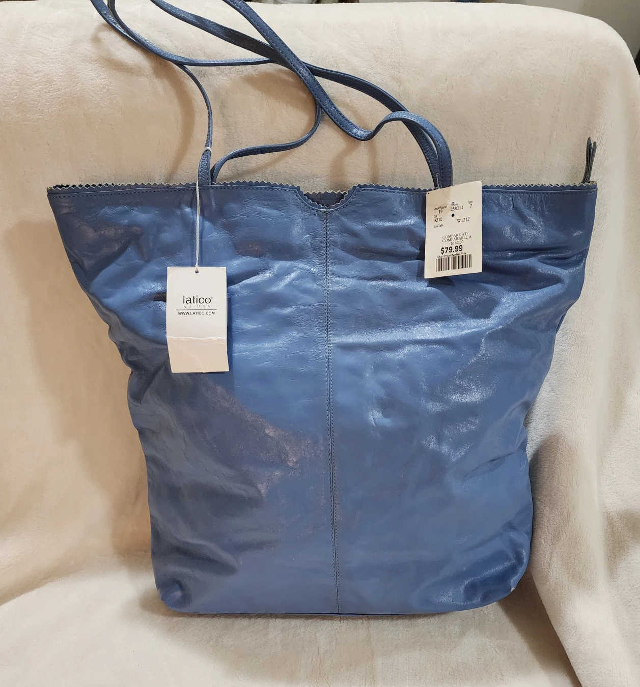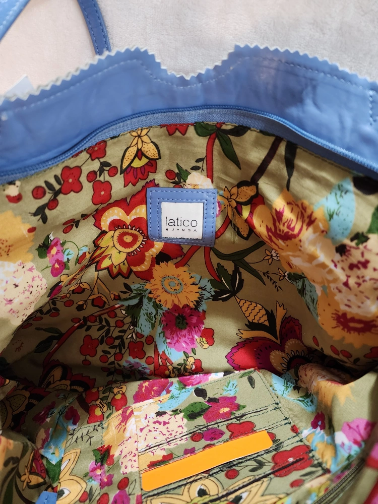 Blue genuine leather tote bag with a floral lining. The bag has a zip top closure and two handles. There is a small pocket on the inside of the bag. the picture of the pink purse is only for reference (same model)
