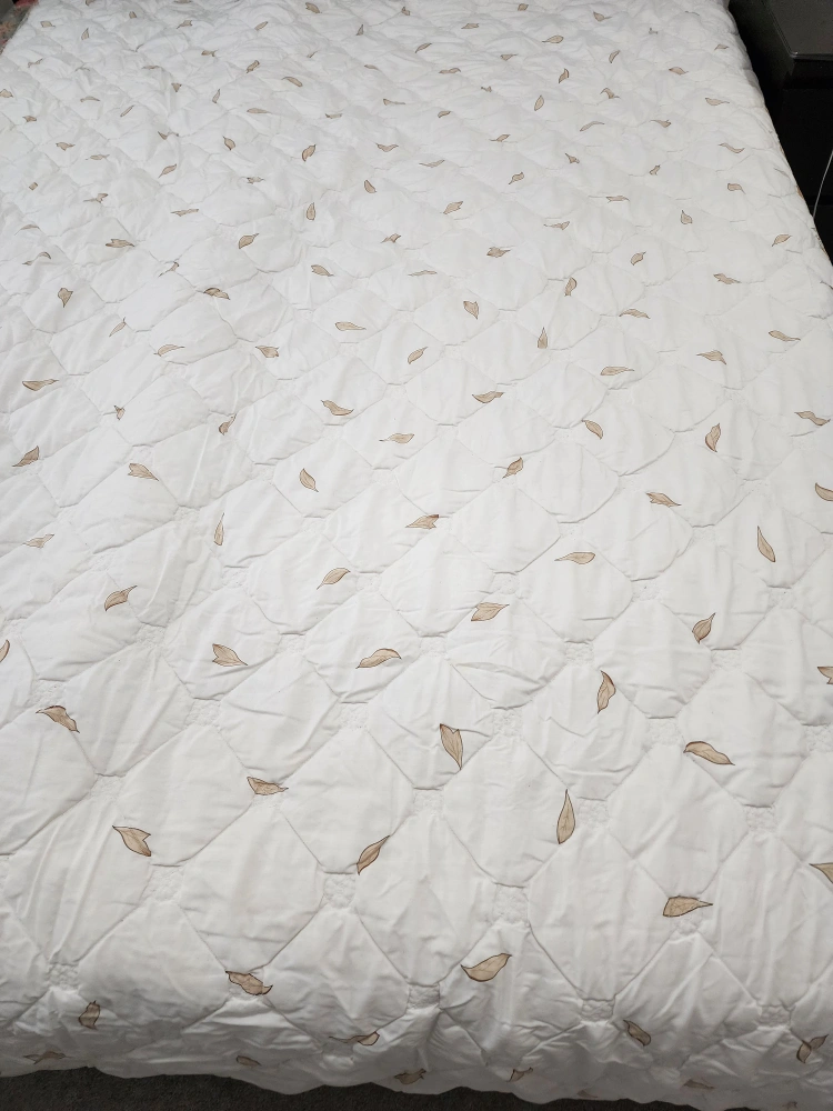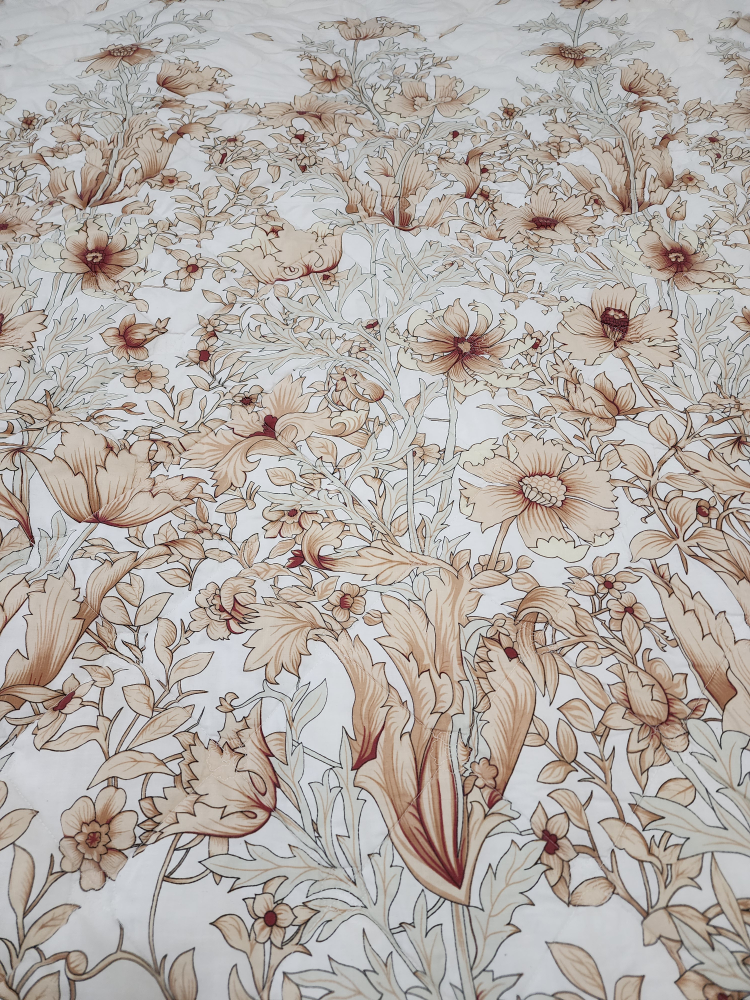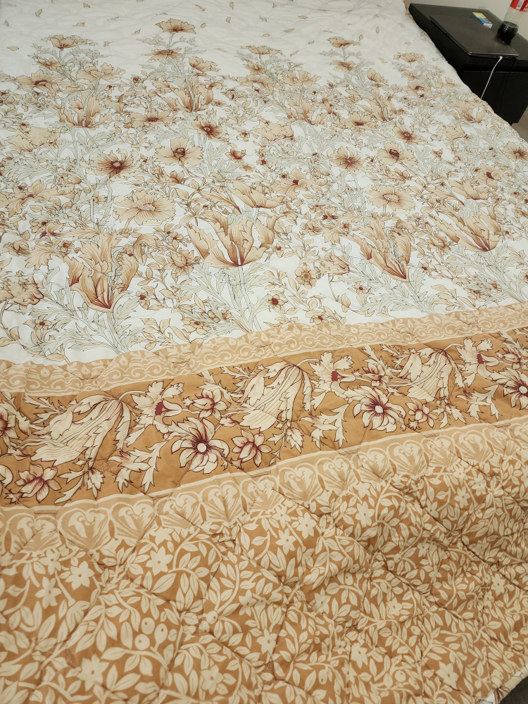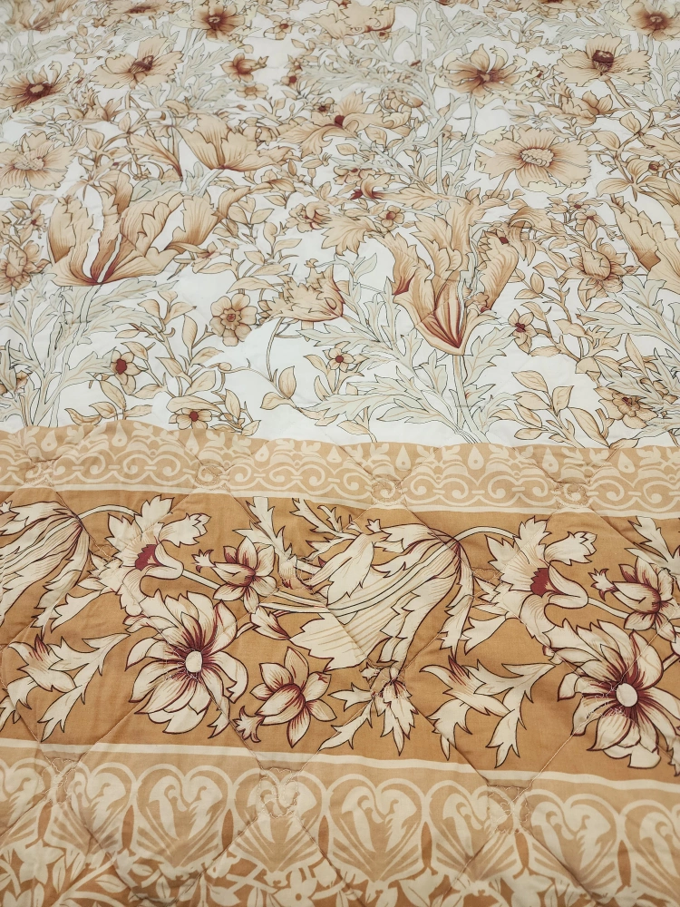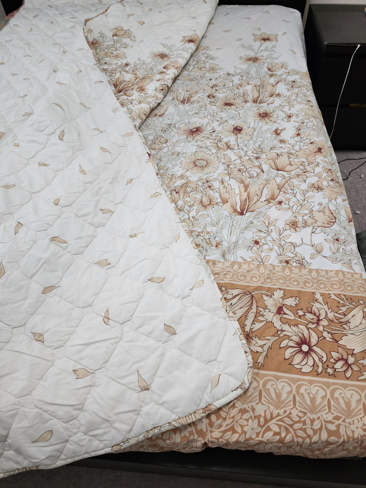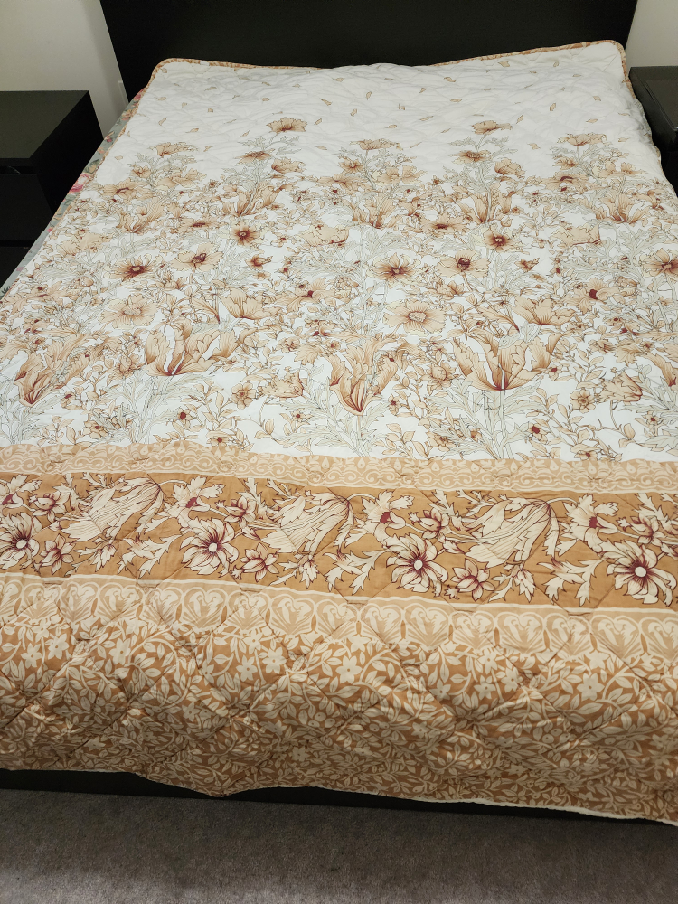 A double bedspread with matching fitted bed sheet featuring a floral pattern. It is quilted. it is reversible with different floral patterned sides. used but in good condition. washed, clean, and ready to use No smoking , non put home