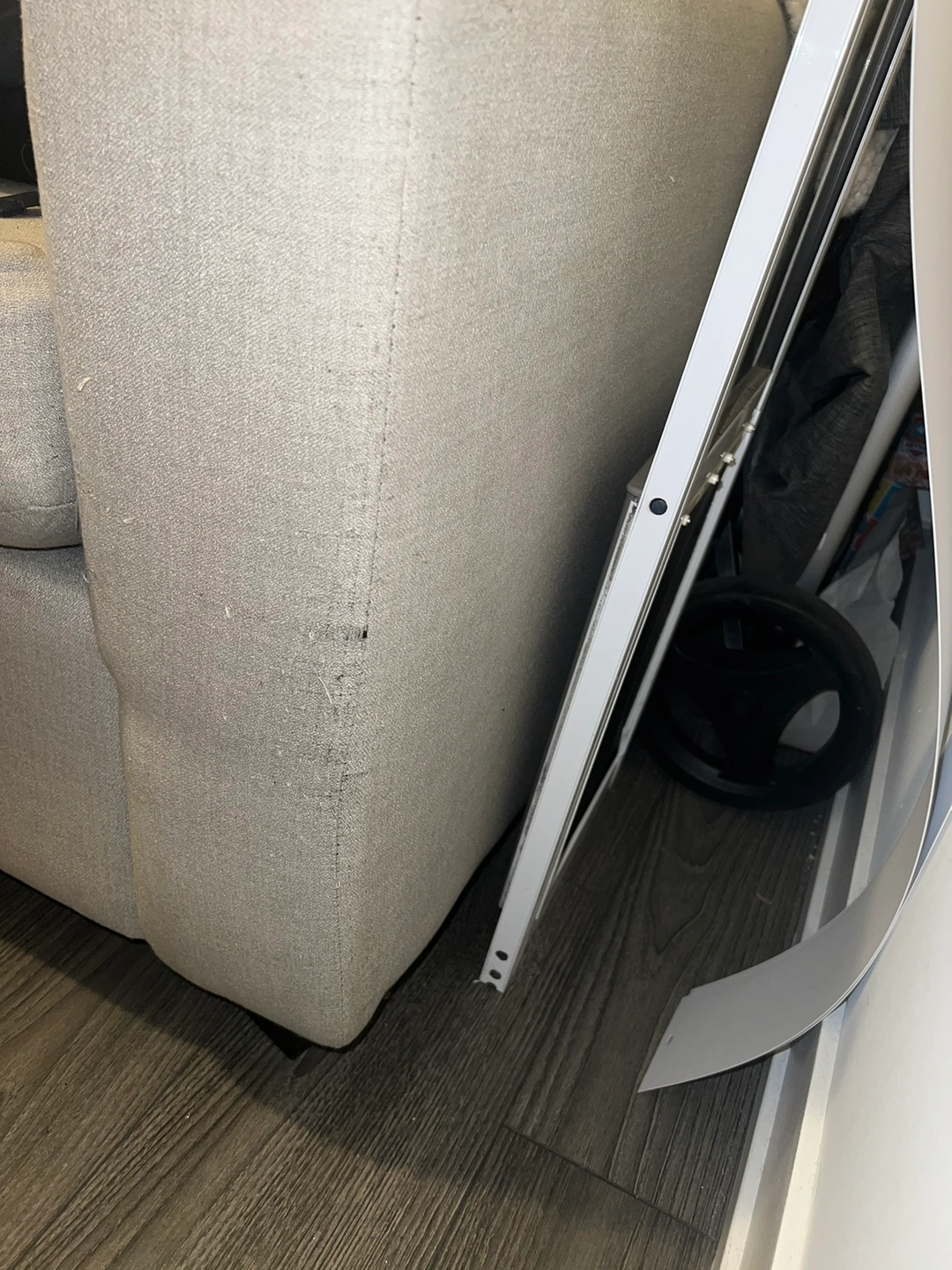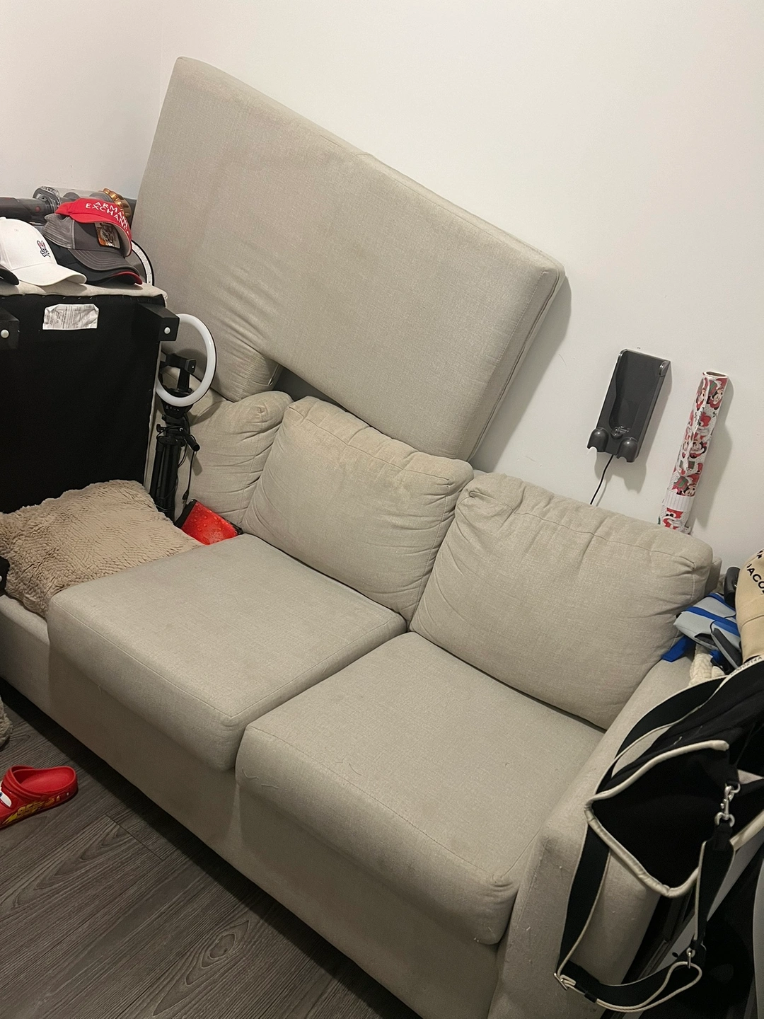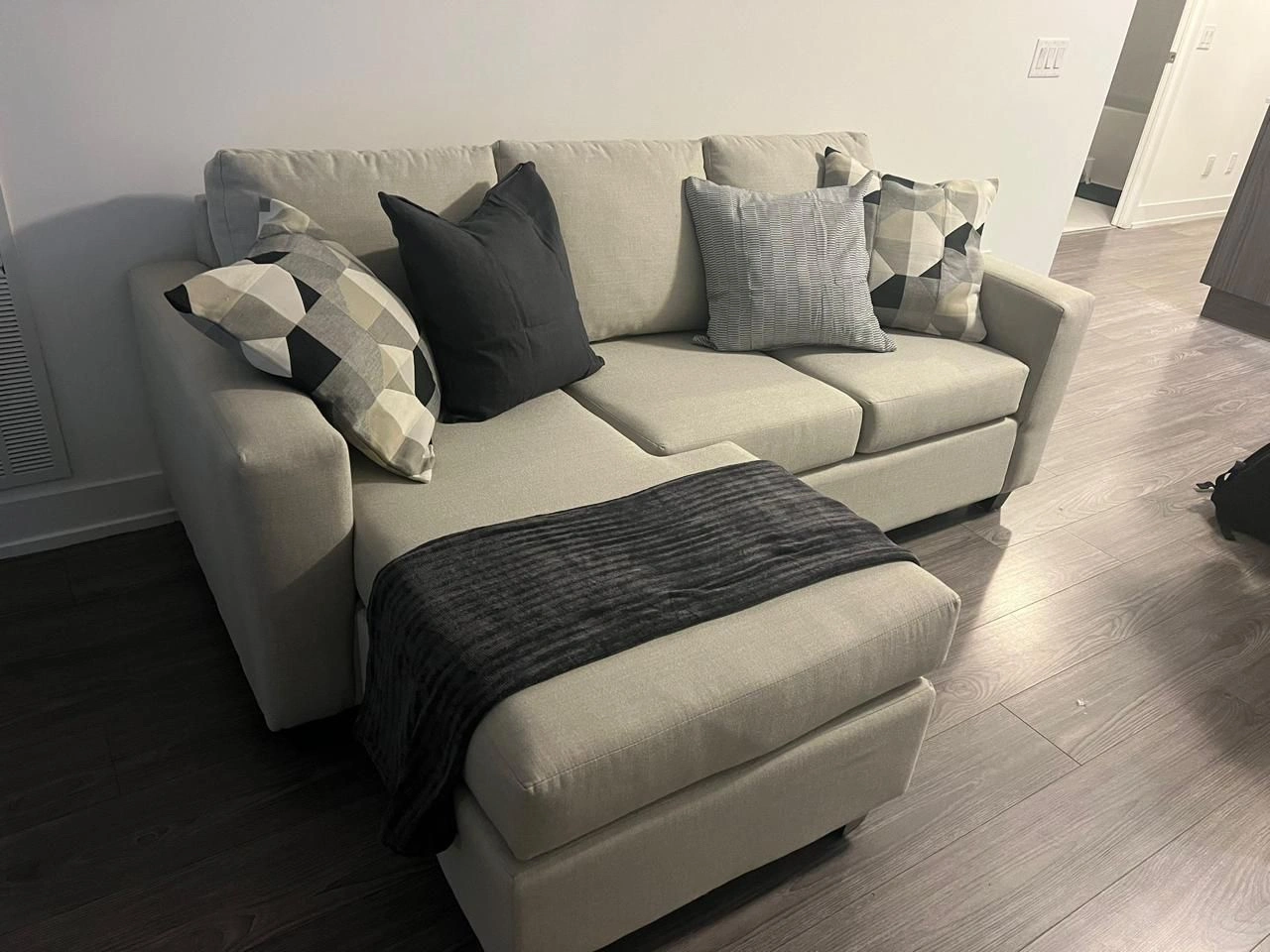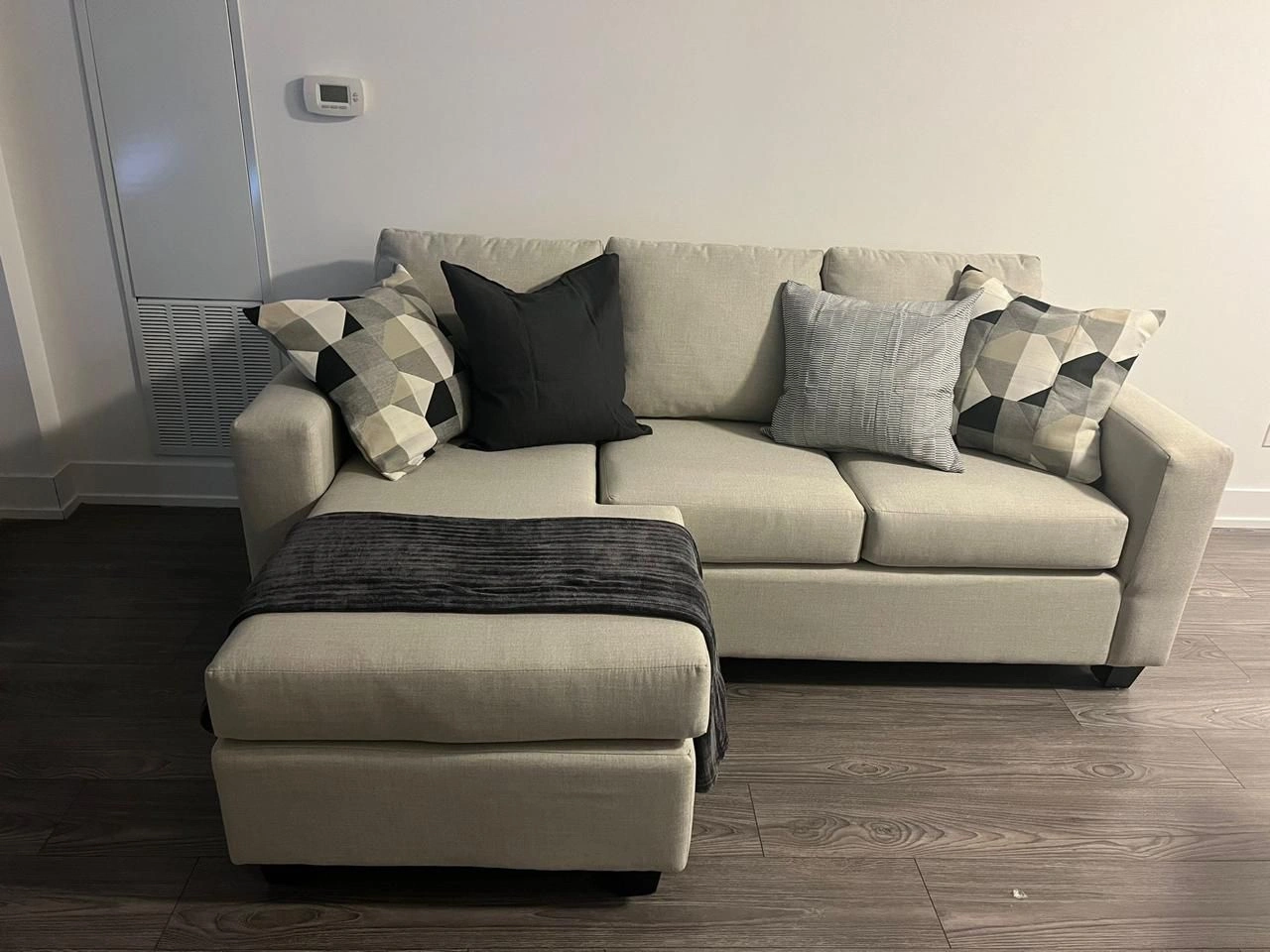 Bought it a couple of years ago in home sense. *Pillows and blanket DO NOT come with the sofa* It has some scratches and some stains but in good shape. The last picture shows an appropriate dimension of the sofa without the chaise! (Not the exact same one) Pick up only downtown