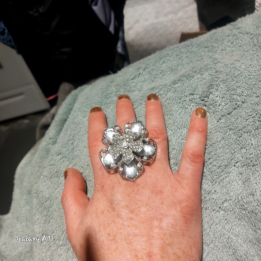 *WELL CARED FOR-LIKE NEW(AS IT'S BEEN MY FAVOURITE FOR A LONG TIME.(LOL....) *SILVER PLATED AND HAS NEVER LEFT ANY TARNISH MARKINGS ON ME). *SRETCH BAND TO FIT ANY FINGER SIZE.