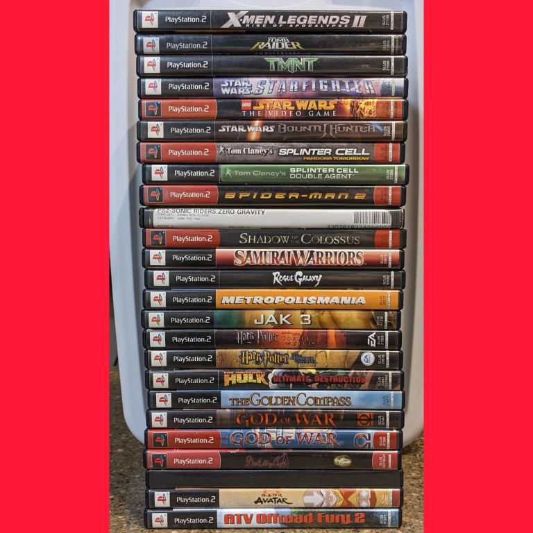 Collection of PS2 Video Games. Prices starting at $5 or buy them all at a discounted price of $195. Condition ranges from Good to Like New. Games: ATV Offroad Fury $5 Avatar the Last Airbender $10 Dead to Right II $10 Devil May Cry $15 God of War 1 $25 God of War 2 $25 The Golden Compass $10 The Incredible Hulk Ultimate Destruction $25 (Sold) Harry Potter and the Chamber of Secrets $20 Harry Potter and the Goblet of Fire $20 Jak 3 $10 Metropolismania $15 Rogue Galaxy $35 Samurai Warriors $25 Shadow of the Colossus $15 Sonic the Hedgehog Riders Zero Gravity $10 Spider-Man 2 $15 Tom Clancy Splinter Cell Double Agent $10 Tom Clancy's Splinter Cell Pandora Tomorrow $10 Star Wars Bounty Hunter $20 (Sold) Star Wars Lego Star Wars the Video Game $10 Star Wars Starfighter $10 TMNT Teenage Mutant Ninja Turtles $10 Tomb Raider Lara Croft $10 (Sold) X-Men Legends 2 Rise of Apocalypse $20 (Sold)