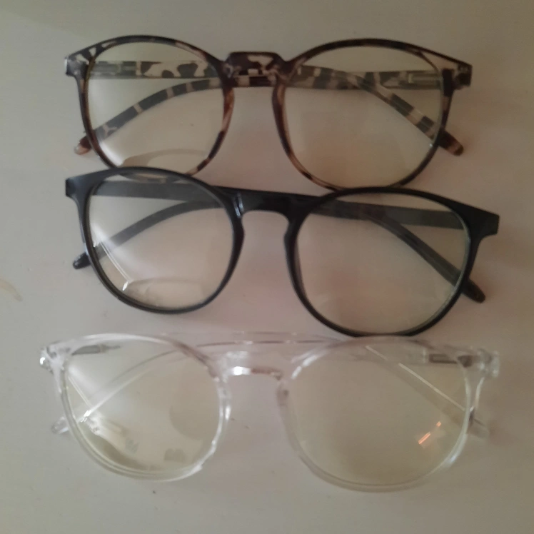 Three pairs of glasses, one brown, one black, and one clear. all blue light glasses. $5 for all 3