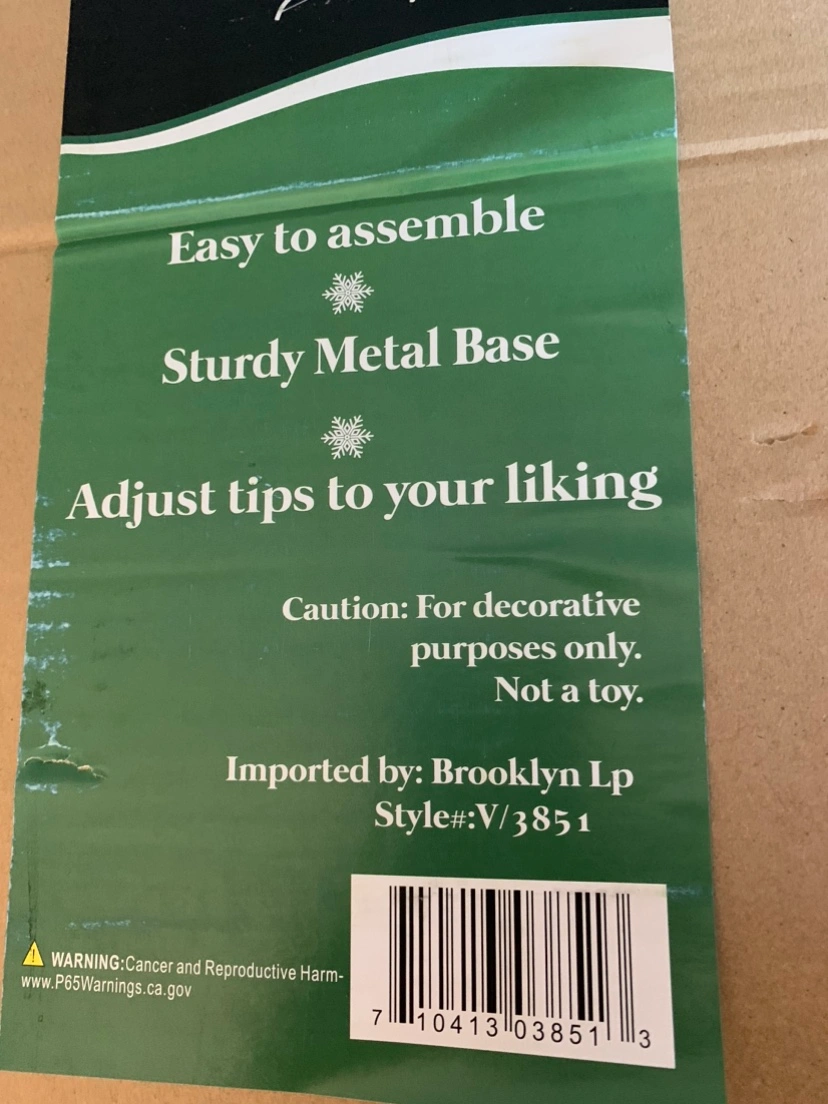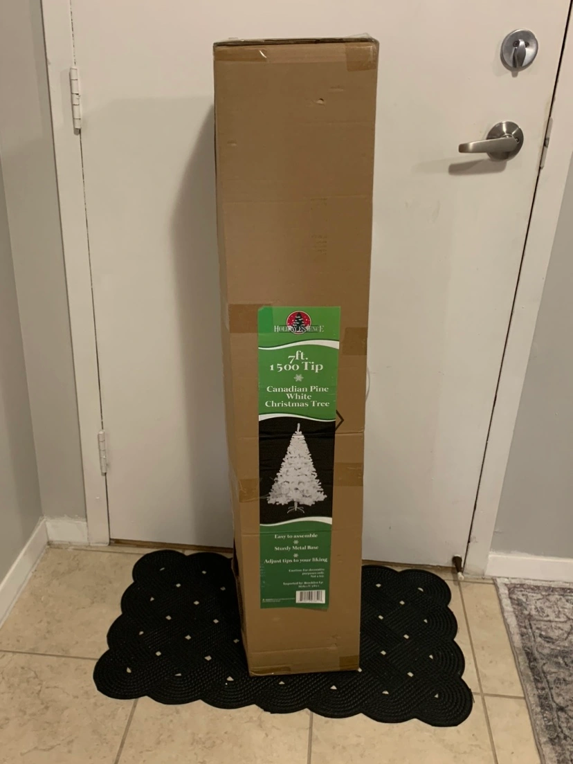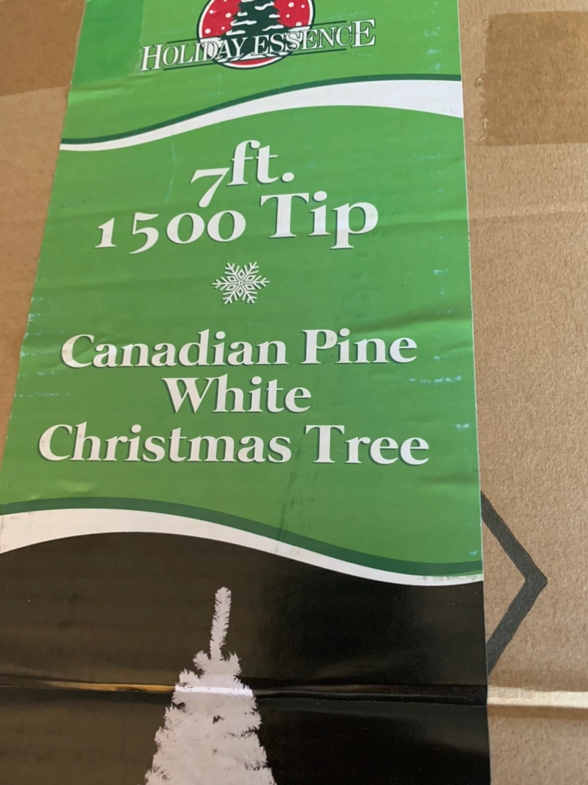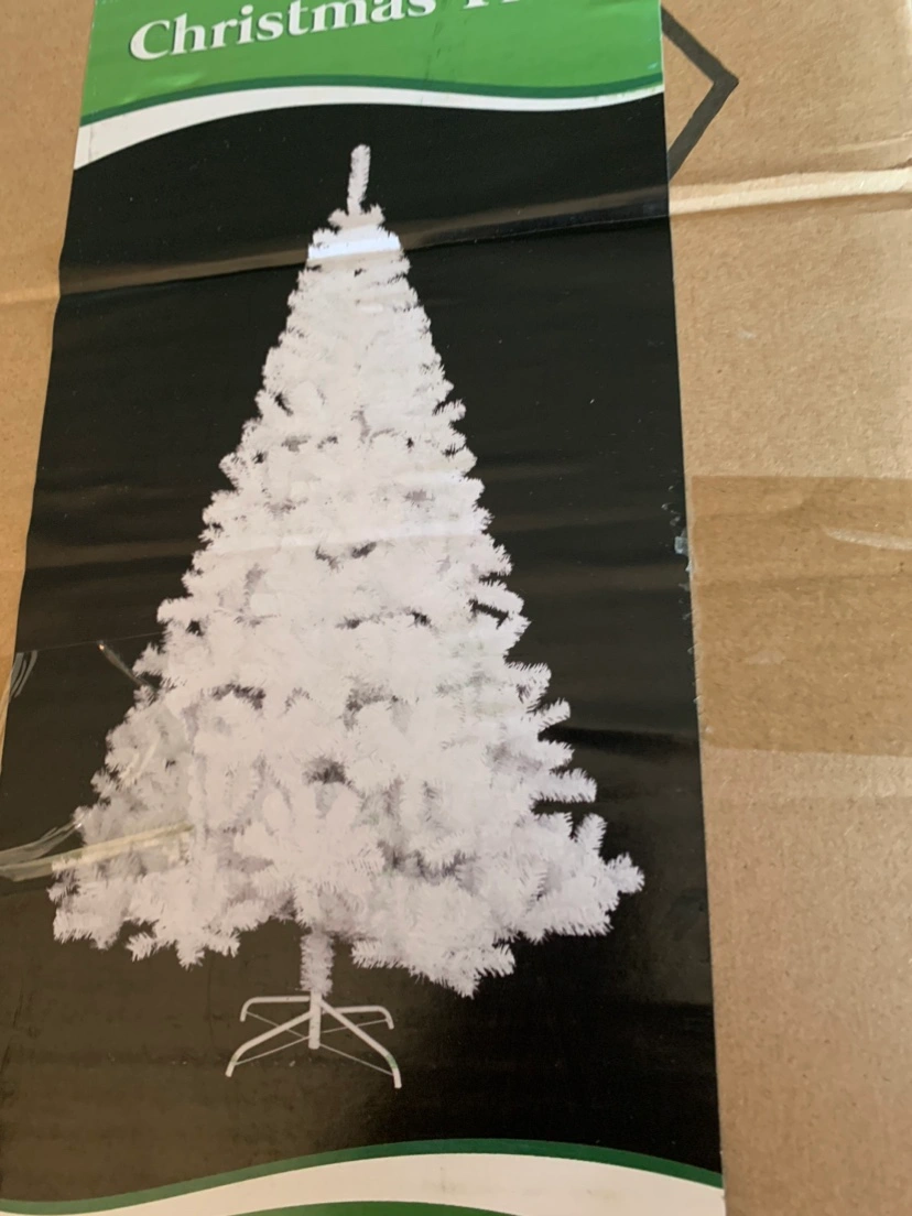 This 7-foot Christmas tree is in its original box. It is white and made to look like a Canadian pine. The tree comes with a metal base. It is easy to assemble. The tips are adjustable so you can create a full-bodied look.