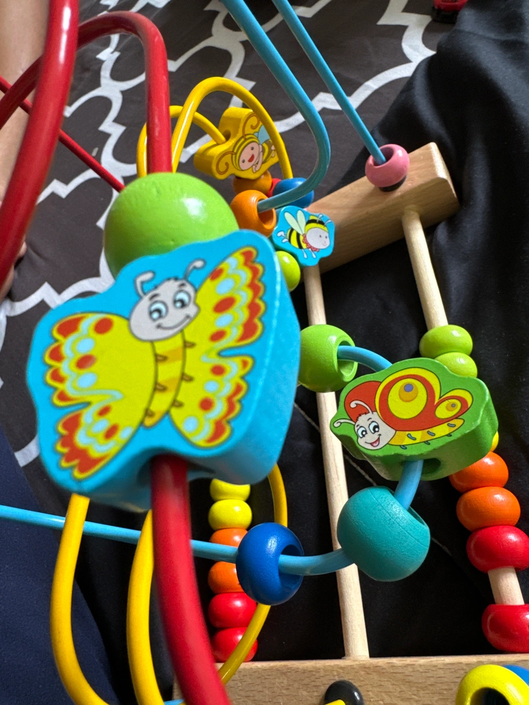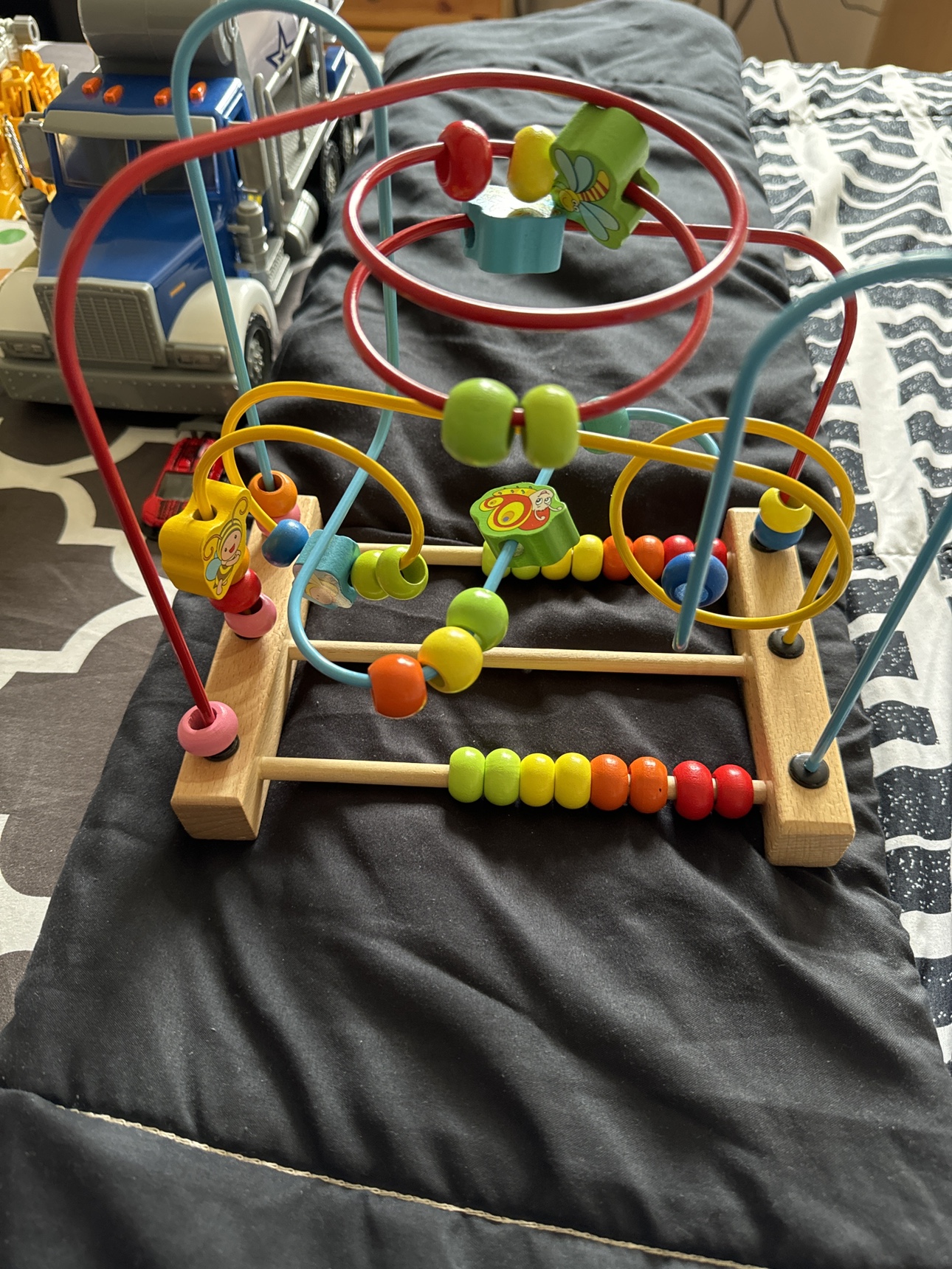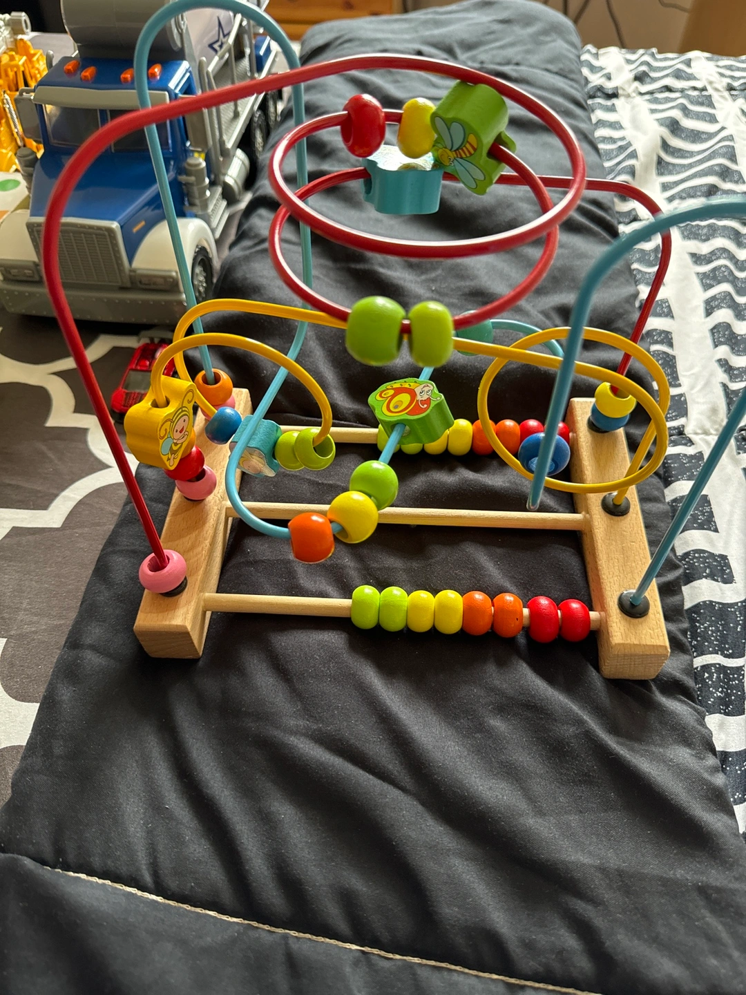 A wooden toy that helps children develop their fine motor skills. It features a maze with colourful beads that can be moved around. There is also a section with wooden dowels and beads that can be used for counting. Pickup near wanless and edenbrook L7A2K9