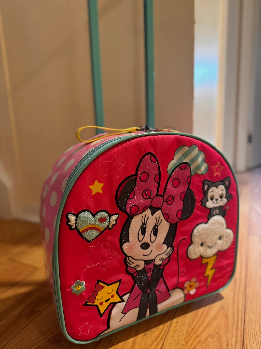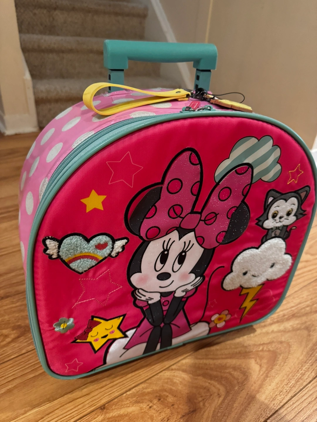 Has handle that can extend as well. Size is about 16”x16”x6”. Very cute luggage and in great conditions.