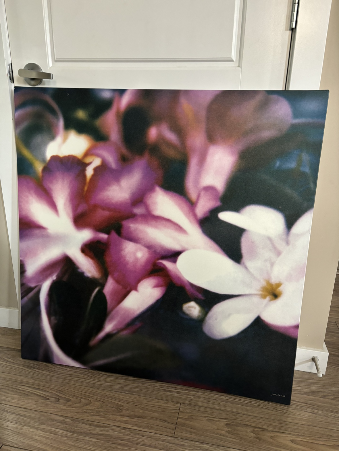 Large canvas wall art with a purple floral print. It is stretched over a wood frame and ready to hang with a keyhole hook in the back. Would look great in a living room, bedroom or dining room. I have a ton of decor items I’m downsizing so if this isn’t your style, I have several other items I’m selling! Located in Ellerslie, cash only.