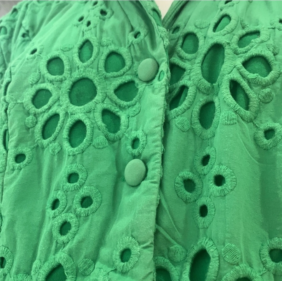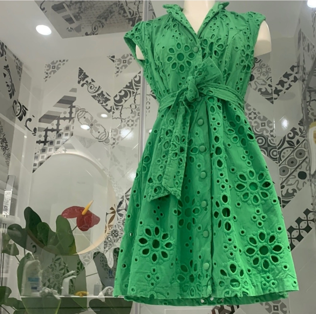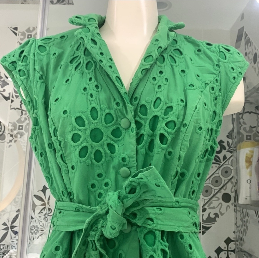Beautiful green colour. 💚 In amazing condition Oversized eyelets 100% cotton Belted Cap sleeves Has pockets! Fully lined Length: 34" Pit to pit: 16" Waist laying flat: 14" 🏷 cottagecore | picnic | coquette |
