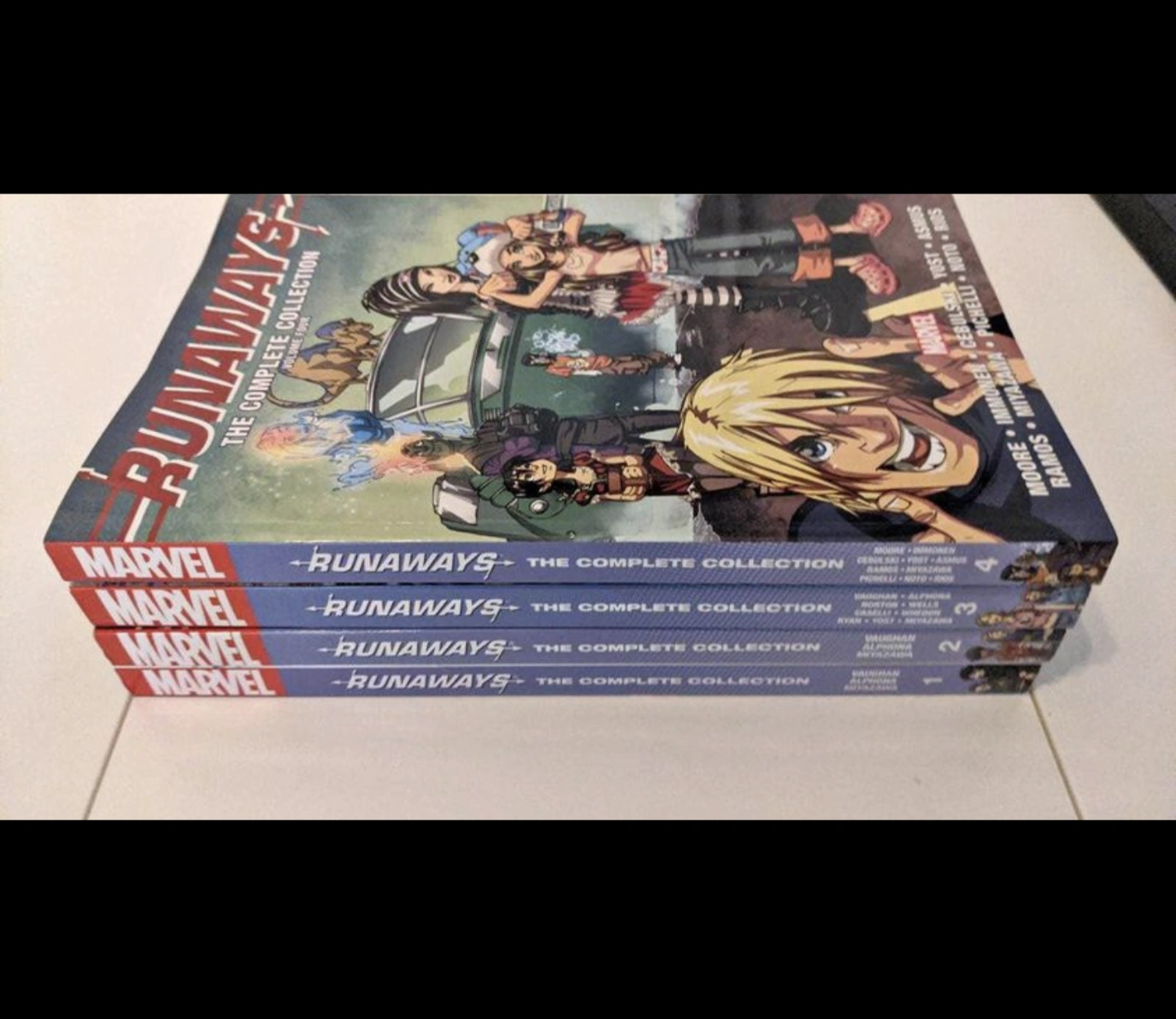 Runaways Complete Collection TPB's Vol 1-4 Graphic Novels Marvel Comics Comic Book "They were six normal teenagers linked only by their wealthy parents’ annual business meeting…until a chance discovery revealed the shocking truth: their parents are the secret criminal society known as the Pride! For years, the Pride controlled of Los Angeles’ criminal activity, ruling the city with an iron fist…and now, with their true natures exposed, the Pride will take any measures necessary to protect their organization — even if it means taking out their own children! Now on the run from their villainous parents, Nico, Chase, Karolina, Gertrude, Molly and Alex have only each other to rely on. And they must not only survive on their own, but also somehow take down their own powerful parents…before it’s too late! Brian K. Vaughan and Adrian Alphona craft a thoroughly modern take on the conventional “teen-team” comic!"