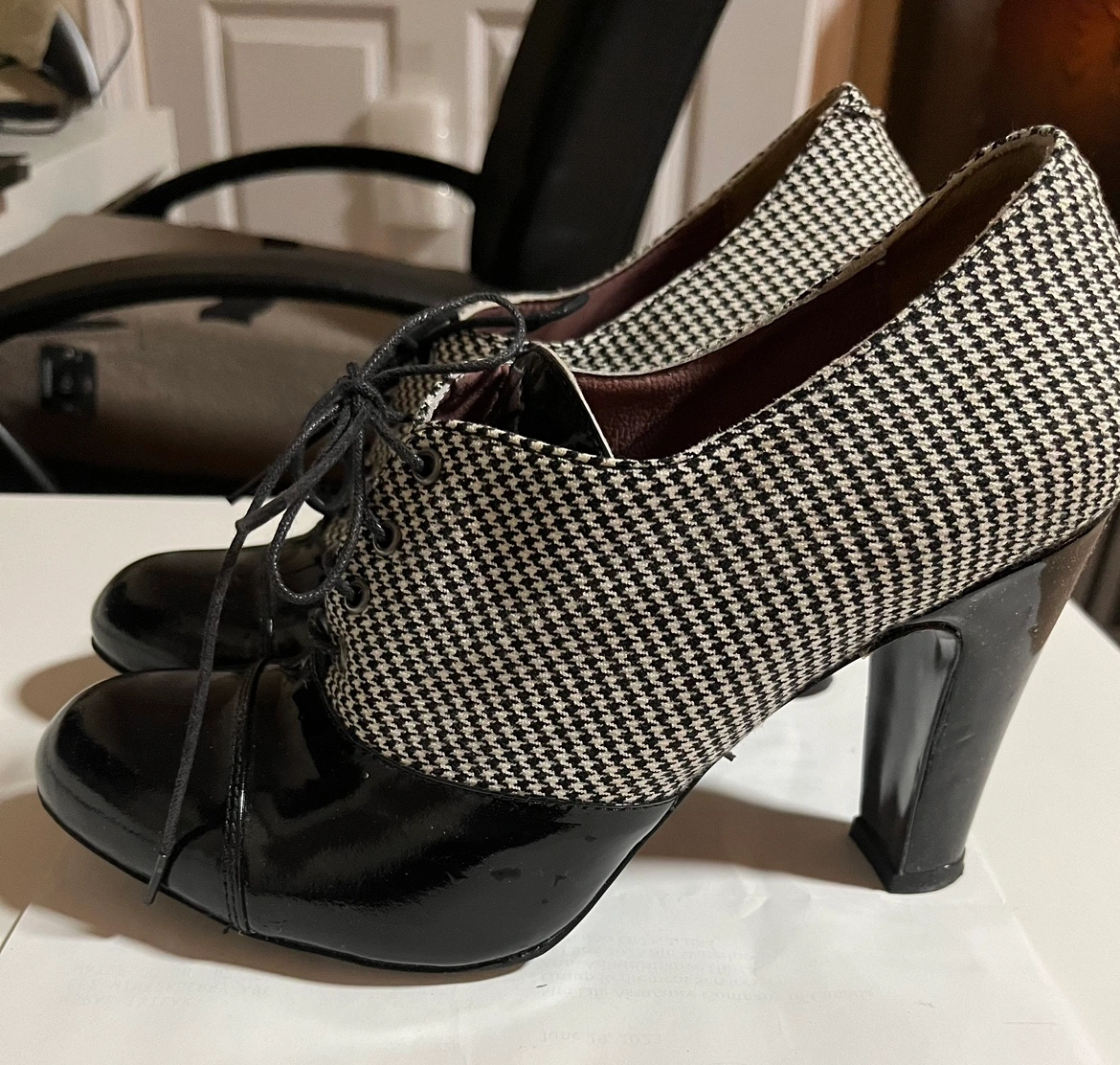These are black and white checkered heels with a black patent leather toe. They have a lace-up front and a chunky heel.
