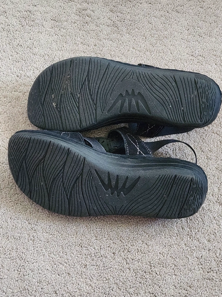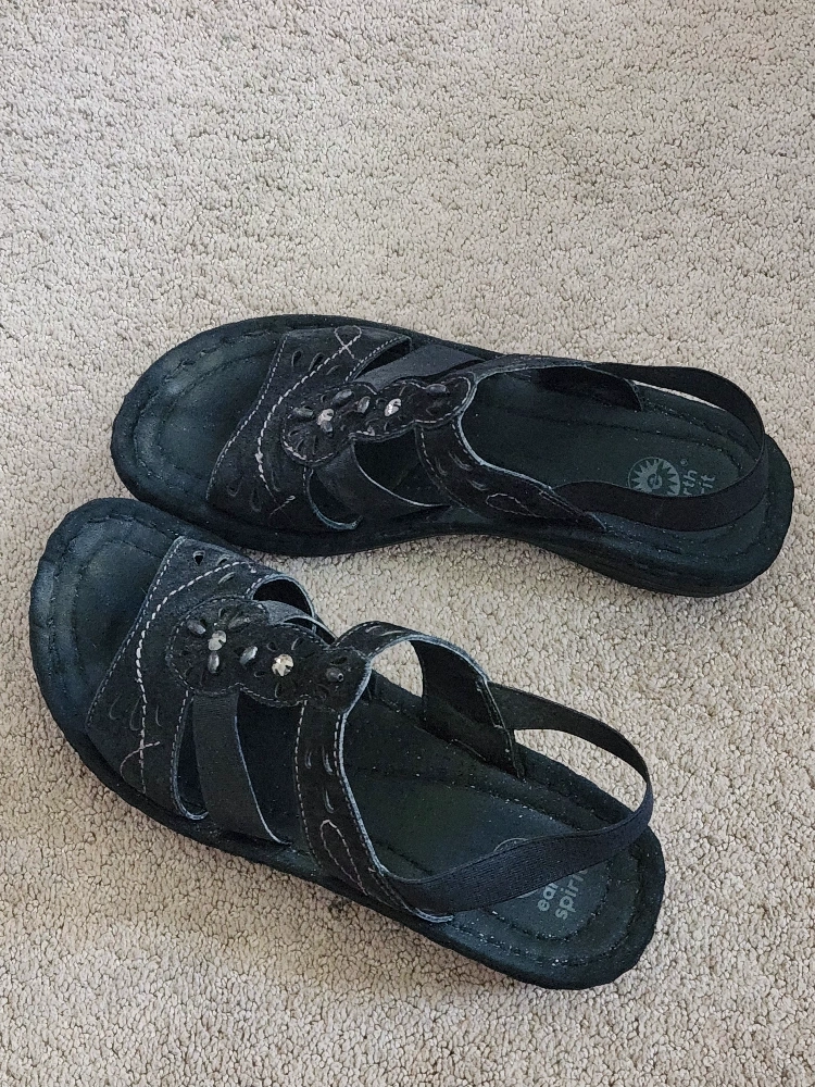 Black Sandals with decorative stitching and embellishments. Sandal features a back strap and an adjustable ankle strap. Sandal has a slight platform and a cushioned insole.