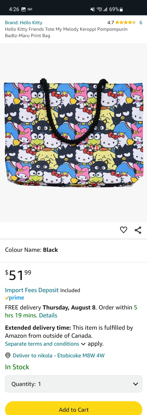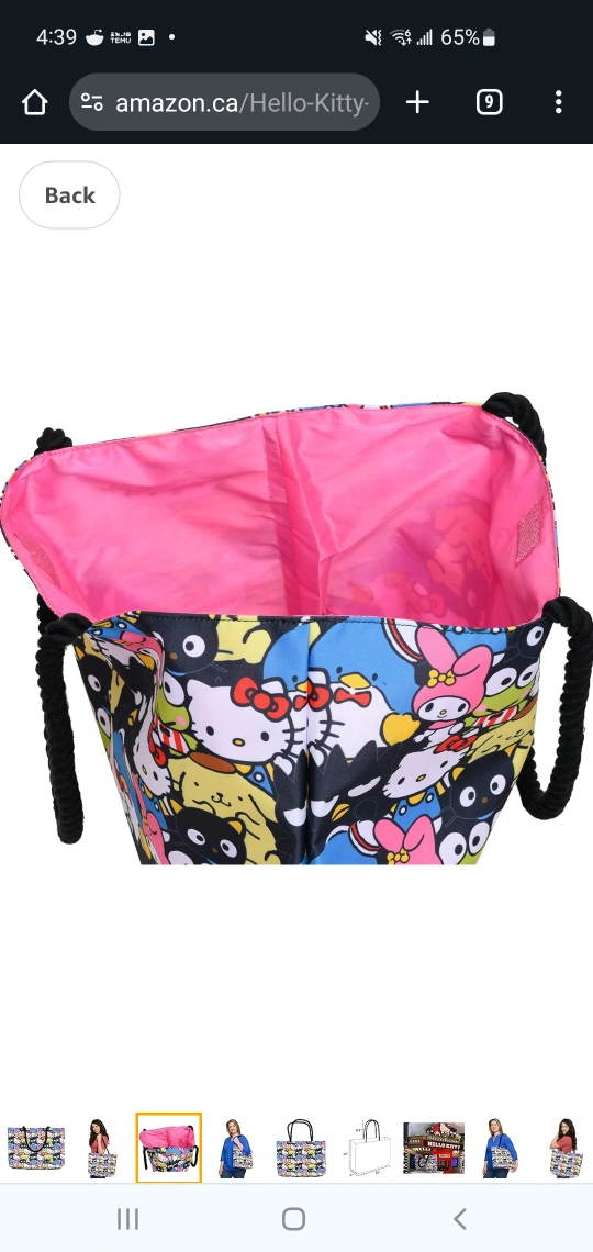 offical Hello Kitty and friends Badtz-Maru print tote bag with black rope handles. retail price on Amazon.ca is $52 plus tax nd import fee's is 60$ retail value. selling for 10 cash for pickup. good for shopping going to the beach or events. standout and enjoy the good compliments you'll get aswell. much love everyone or for trade for anime dvds I collect anime feel free to message me