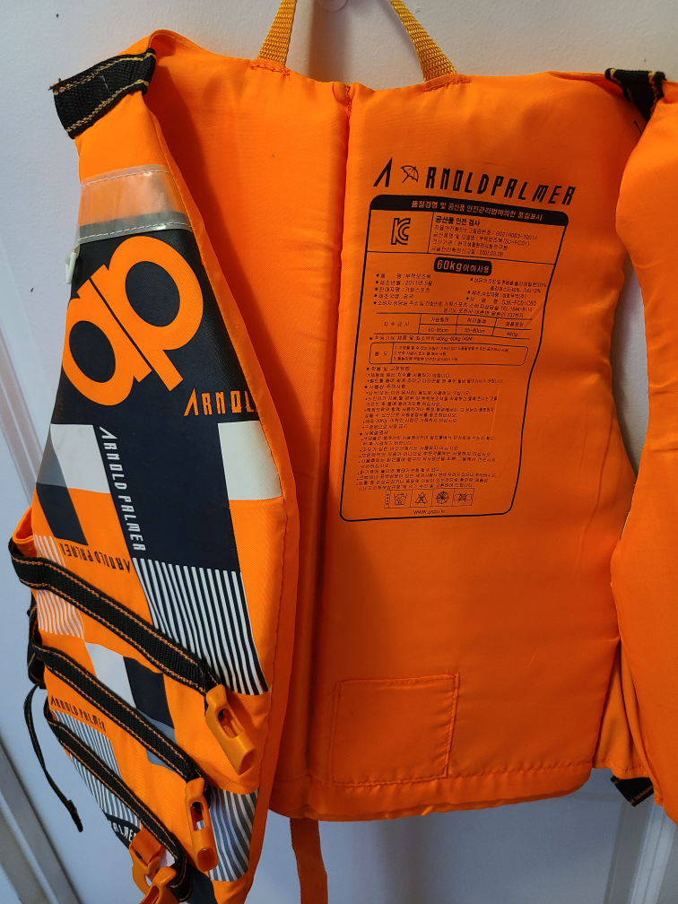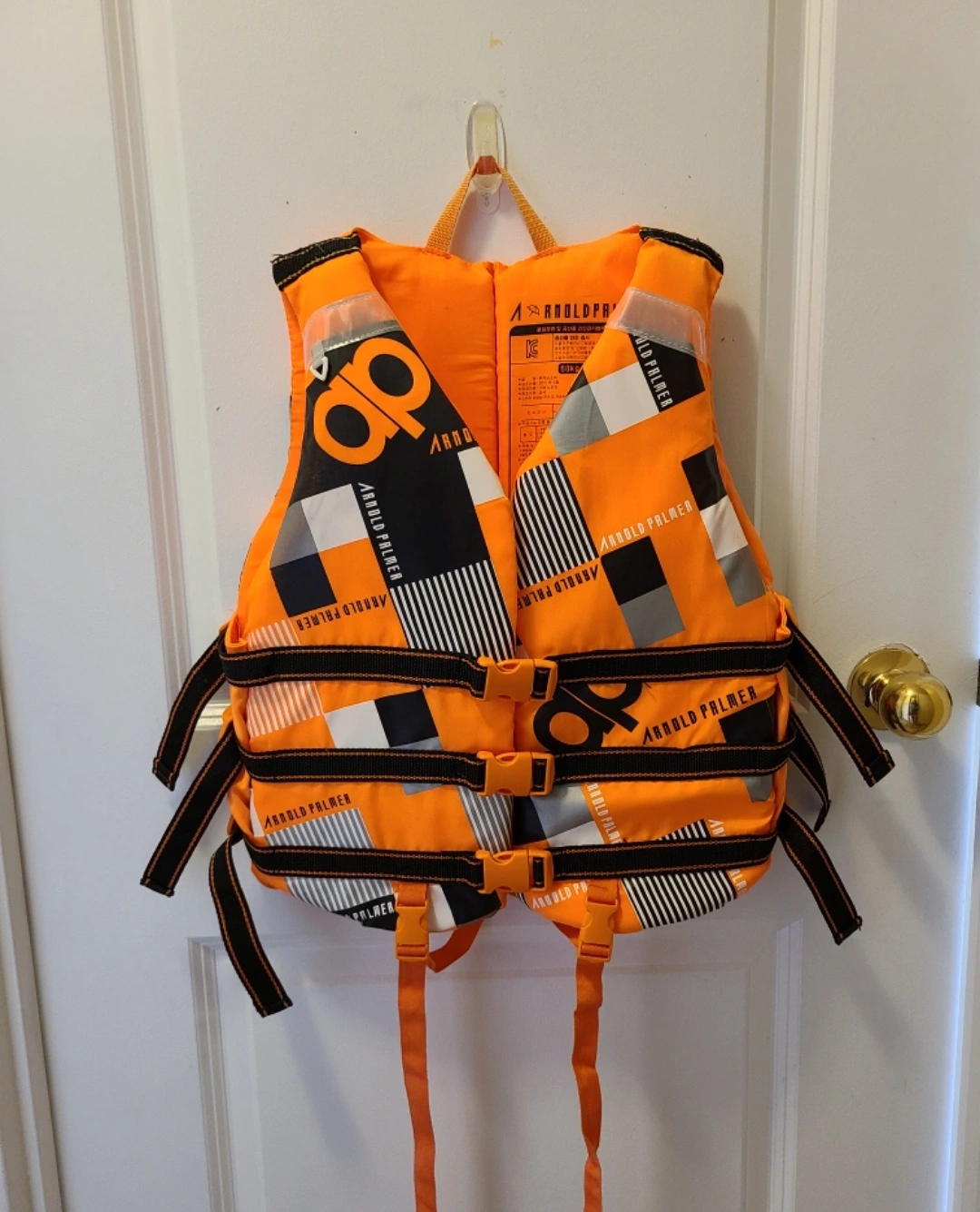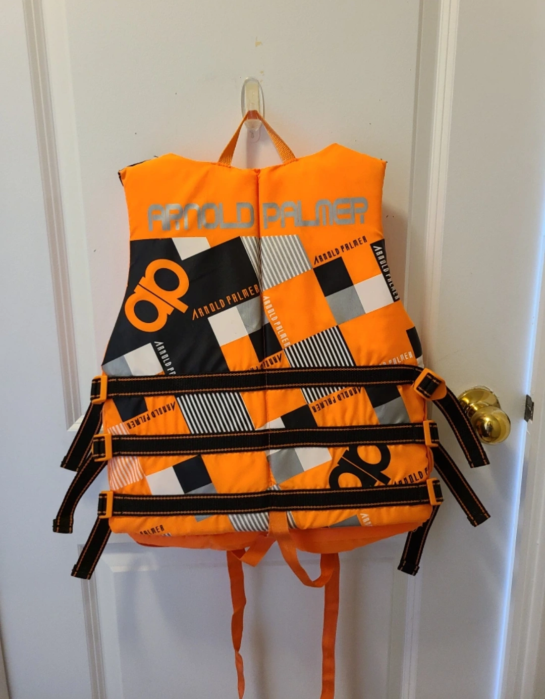 Orange and black life jacket with adjustable straps. For 40~60kg (Must be 60kg or under) Size: Chest 60-85cm Waist 55-80cm Pick up only.