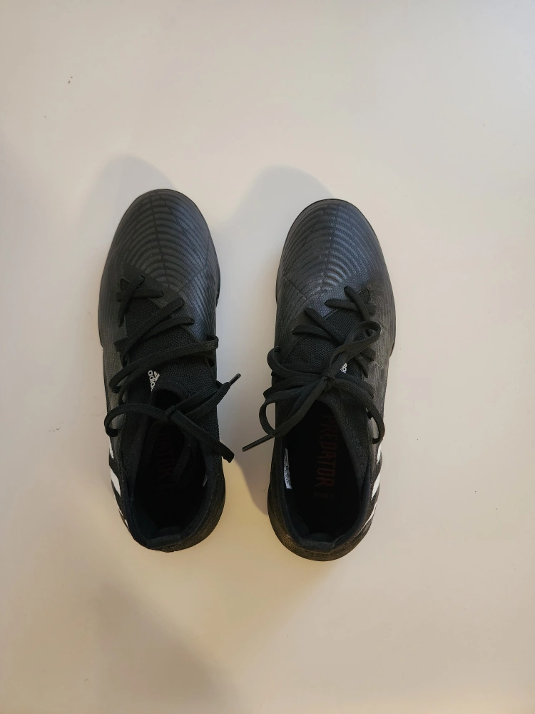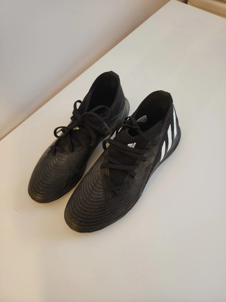 These are black Adidas Predator 19.3 indoor soccer shoes. size 7 in women's, which is also size 5.5 in kids purchase price for $70 and reselling for $25 because I don't play indoor soccer anymore. I have only worn these once