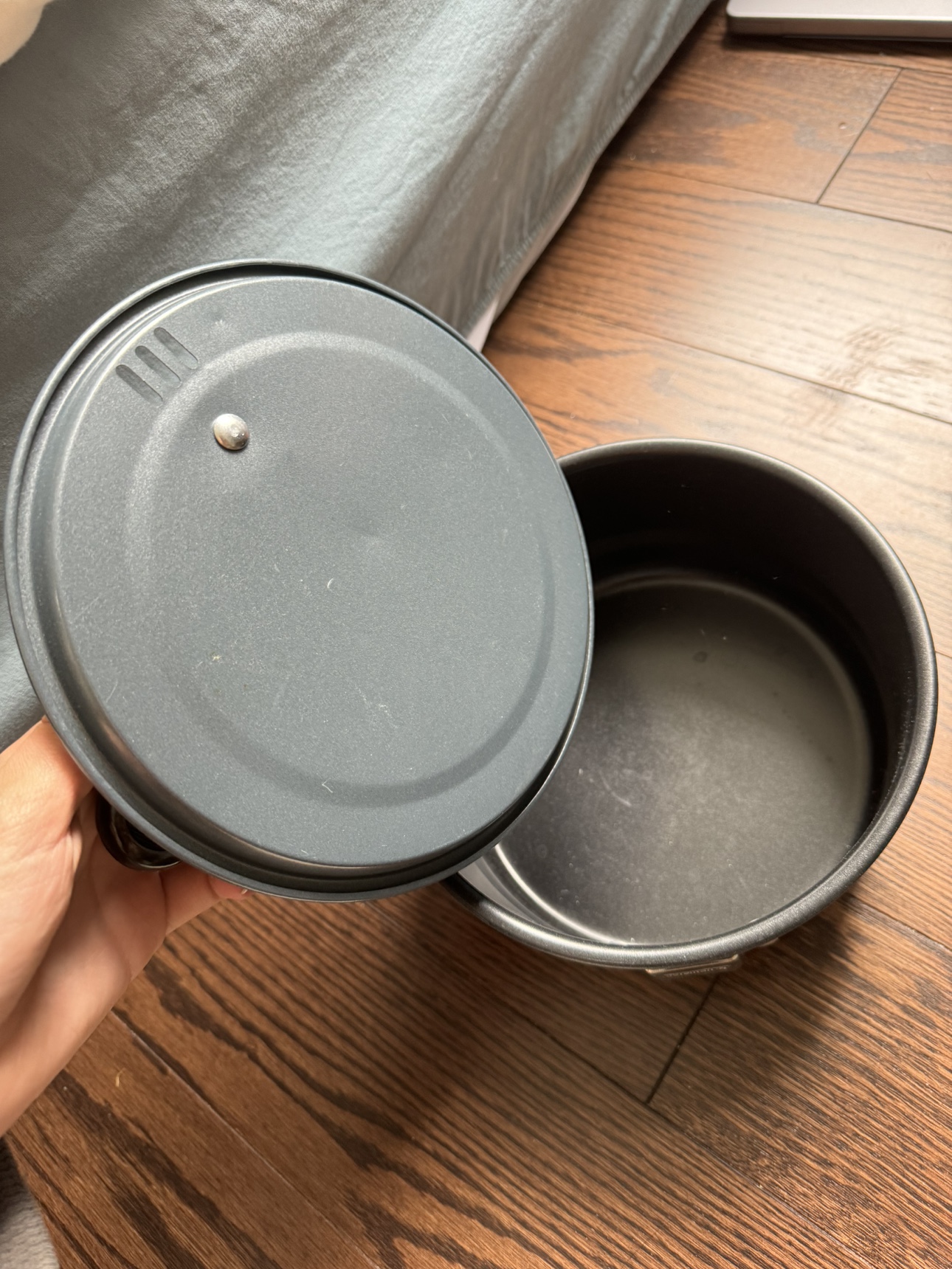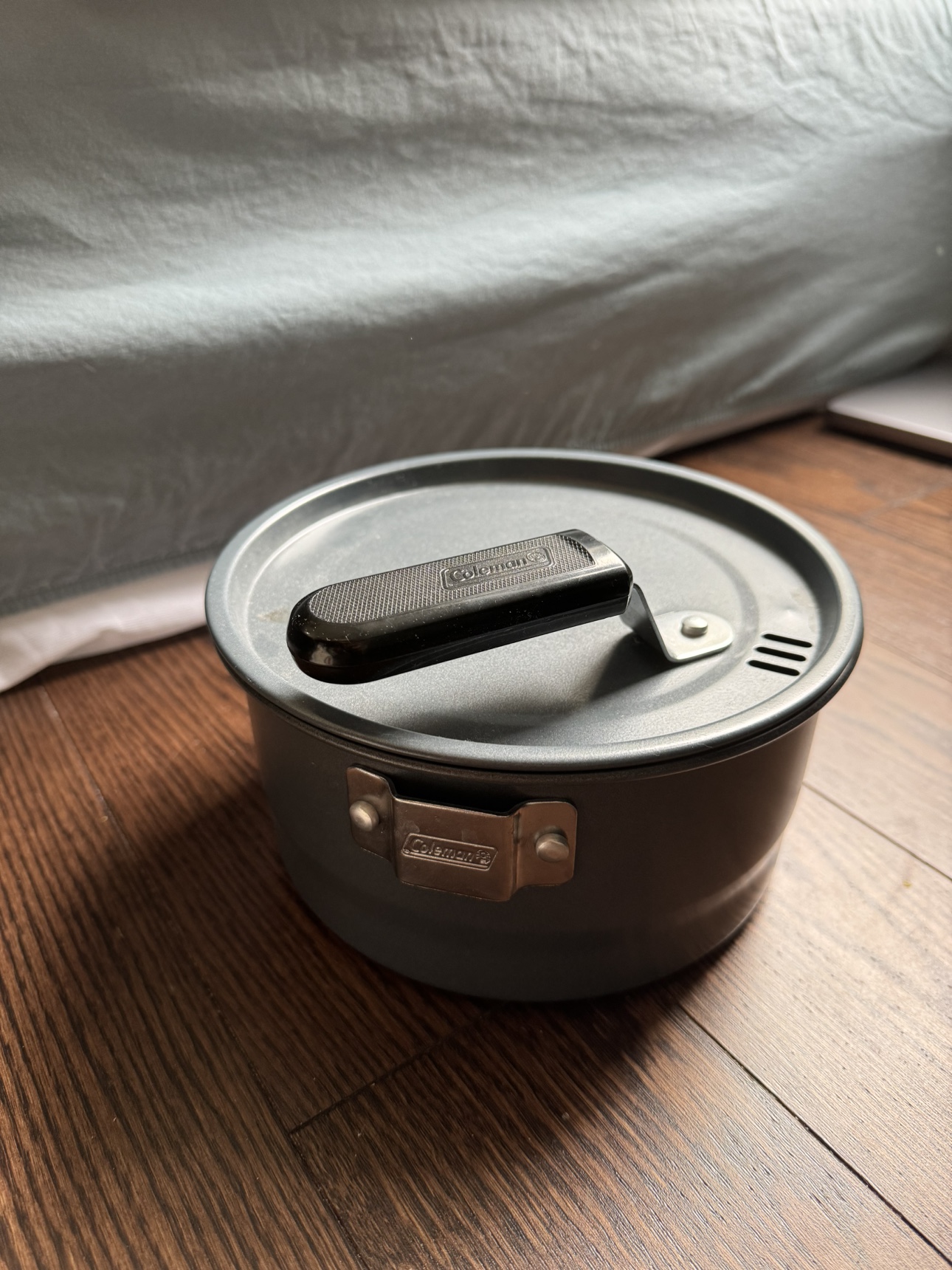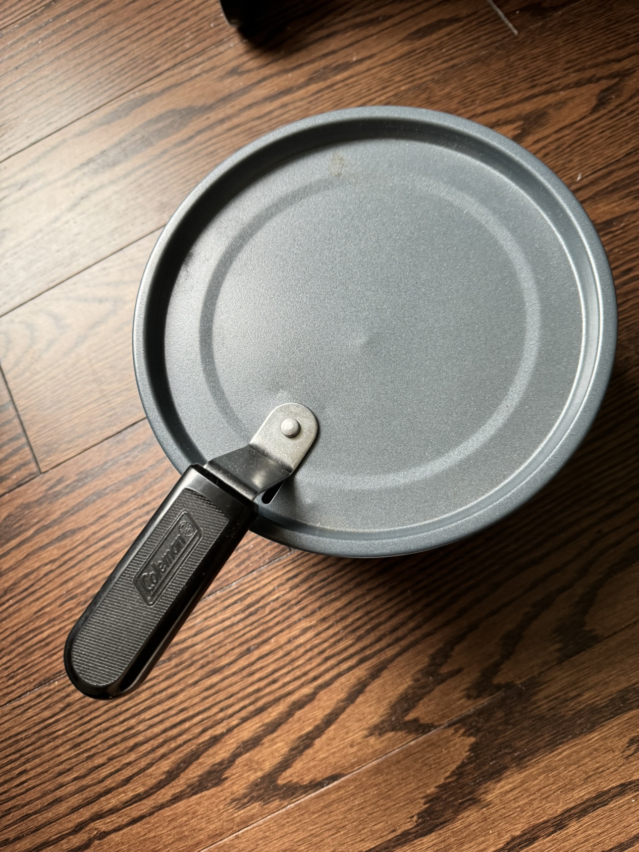 Camping pot with a handle that’s turning to save space on your next camping trip. Great condition.