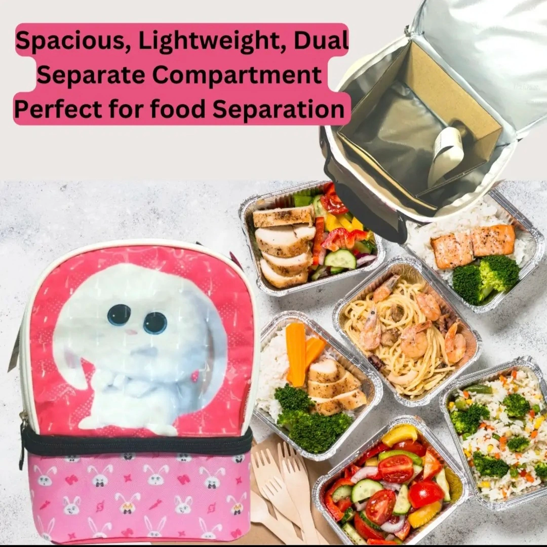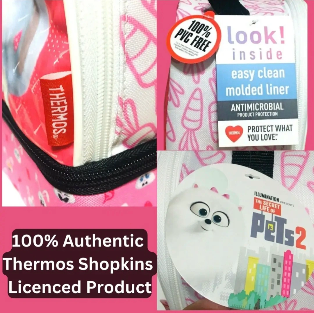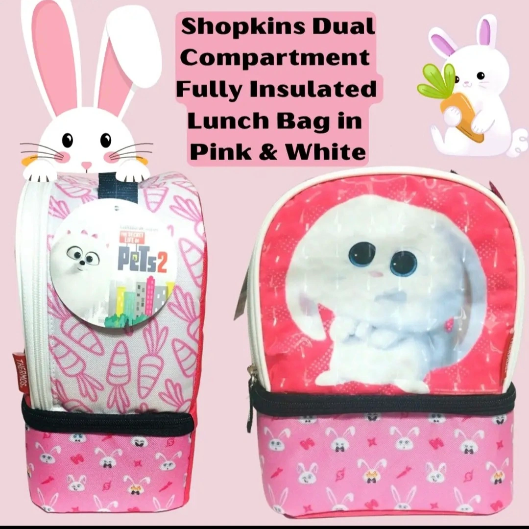 A pink and white dual compartment lunch bag featuring a large image of a white bunny on the front with a small Shopkins logo. The lunch bag has a white zipper and a black trim. The other side of the bag has a pink background with white bunny, carrot and bow tie patterns. The lunch bag is fully insulated.