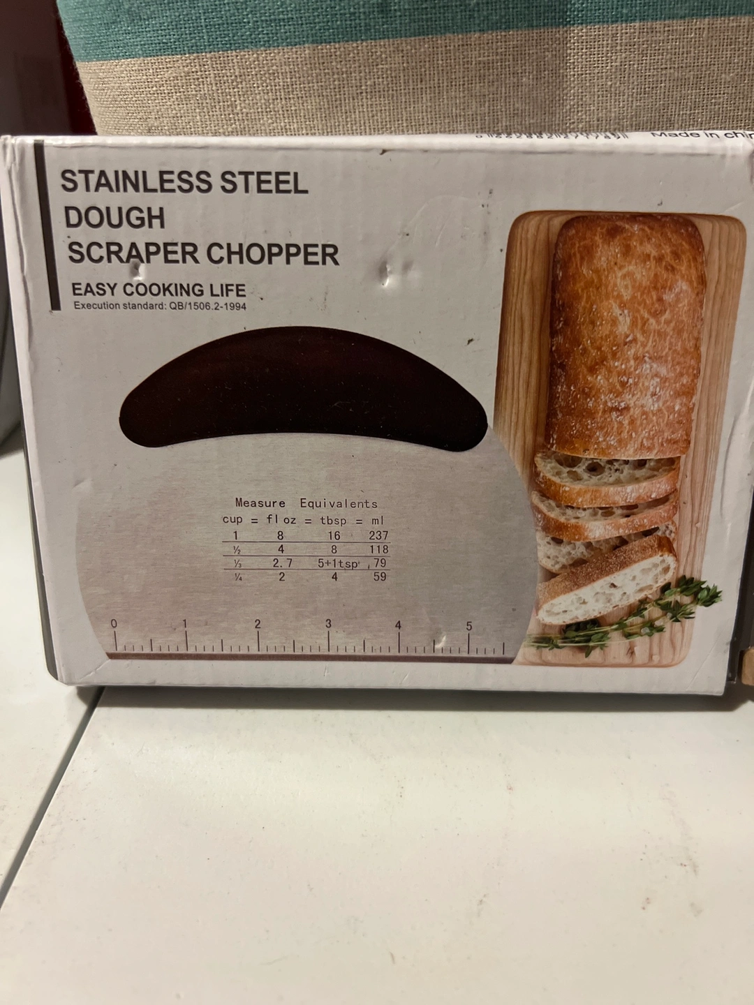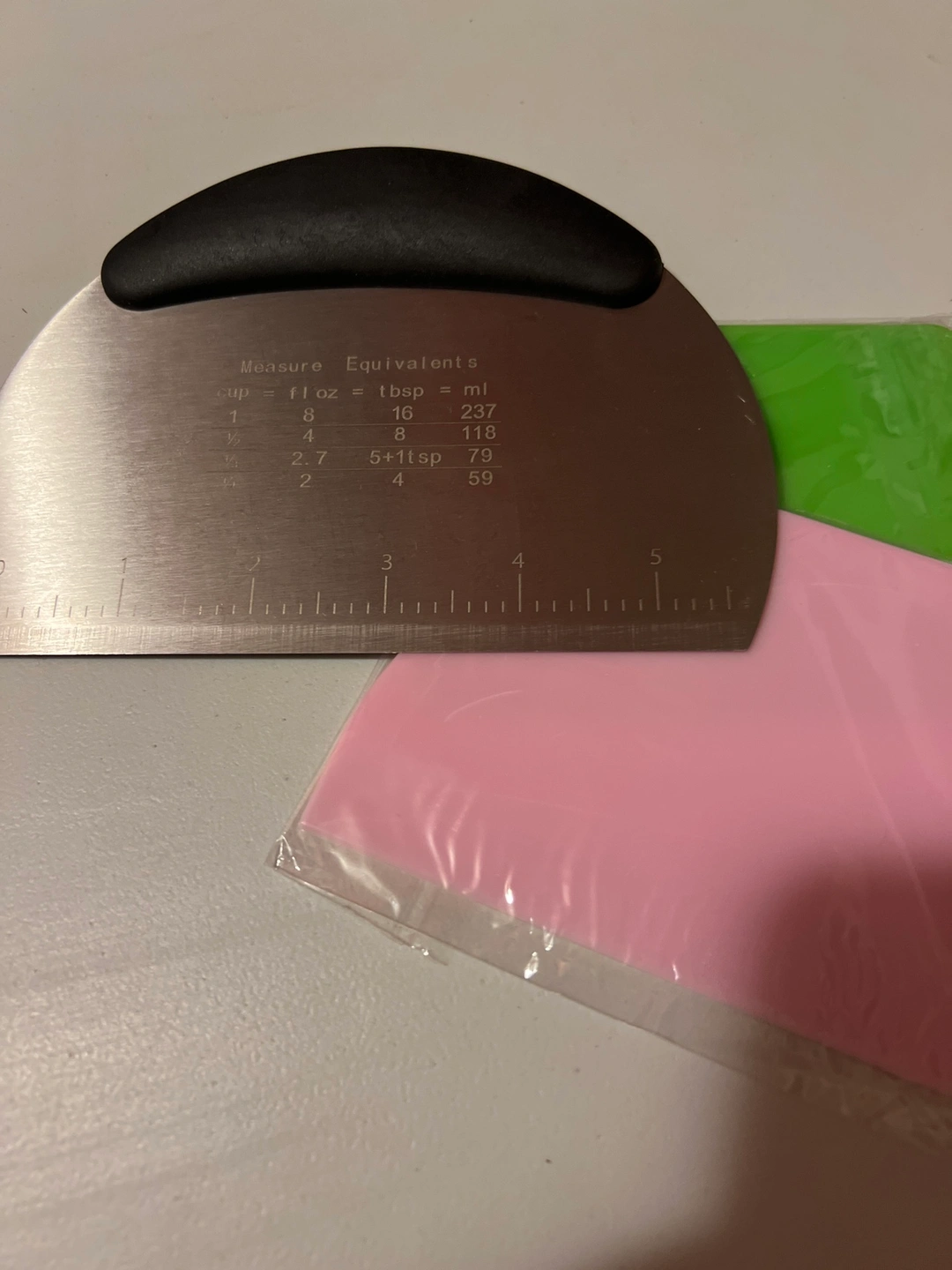 Stainless steel dough scraper comes with two additional plastic scrapers with measurements on the item
