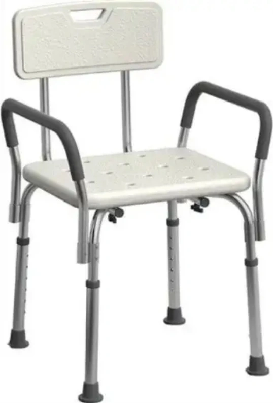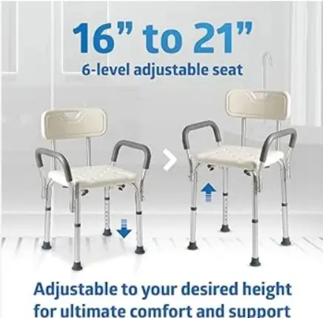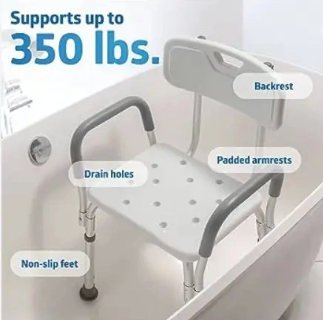 NEW Shower Chair Padded Armrests & Back Heavy Duty Slip Resistant Adjustable Height 350 lb SECURE BATH CHAIR: Provide safe and comfortable care with Medline Shower Chair Bath Seat with Padded Armrests and Back. Retail after tax $65 The slip-resistant soles help ensure the safety of elderly adults during bath time. DURABLE BATH BENCH: Enjoy our heavy-duty shower chair for years. It has a weight capacity of 350 lbs and is made of lightweight and rust-resistant Aluminum. ADJUSTABLE HEIGHT: For maximum convenience, we designed our shower seats to fit in most bathrooms. It has adjustable seat height with 1” increments to ensure that it is adaptable and can meet your needs. EASY TO ASSEMBLE: You don’t need any tools to assemble our shower seat for inside shower use. It comes with a step-by-step manual so you can set up your new shower chair for bathtub in no time. COMFORTABLE SHOWER SEAT: We designed our shower chair with arms and back to provide superior support and balance. It is the ultimate daily living accessory that provides comfortable showering for anyone.