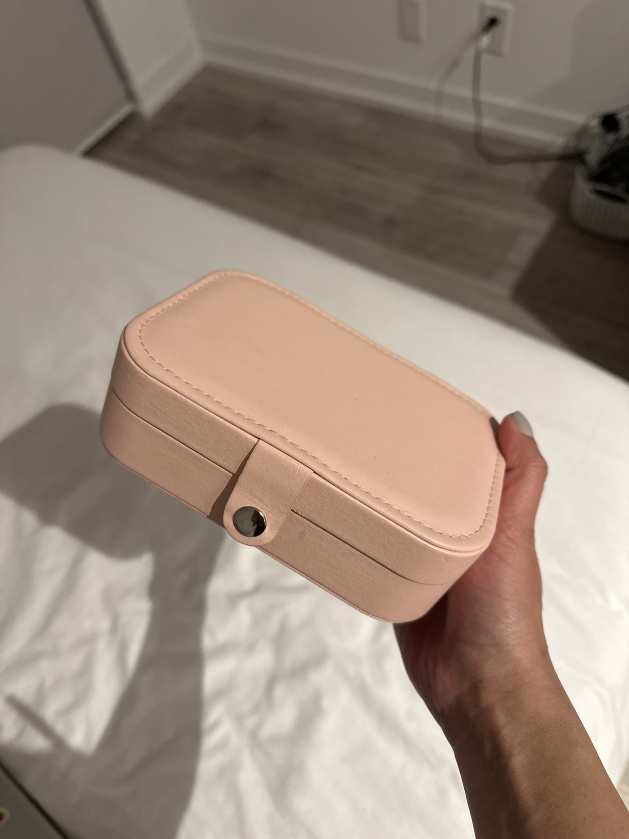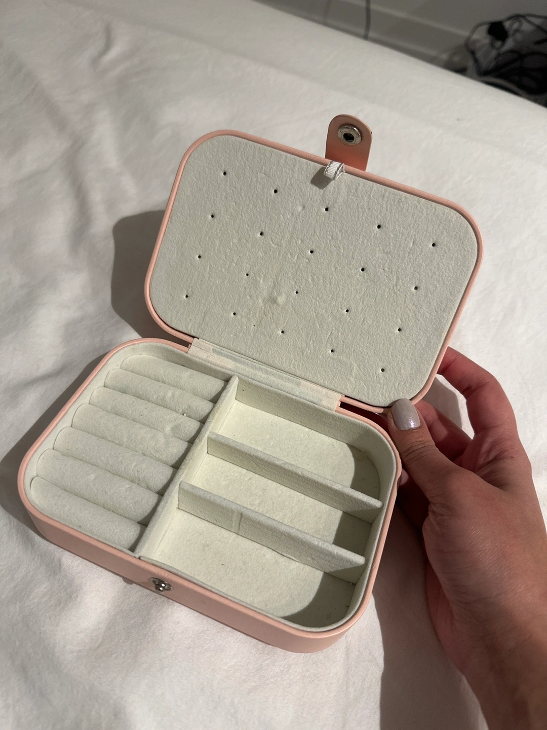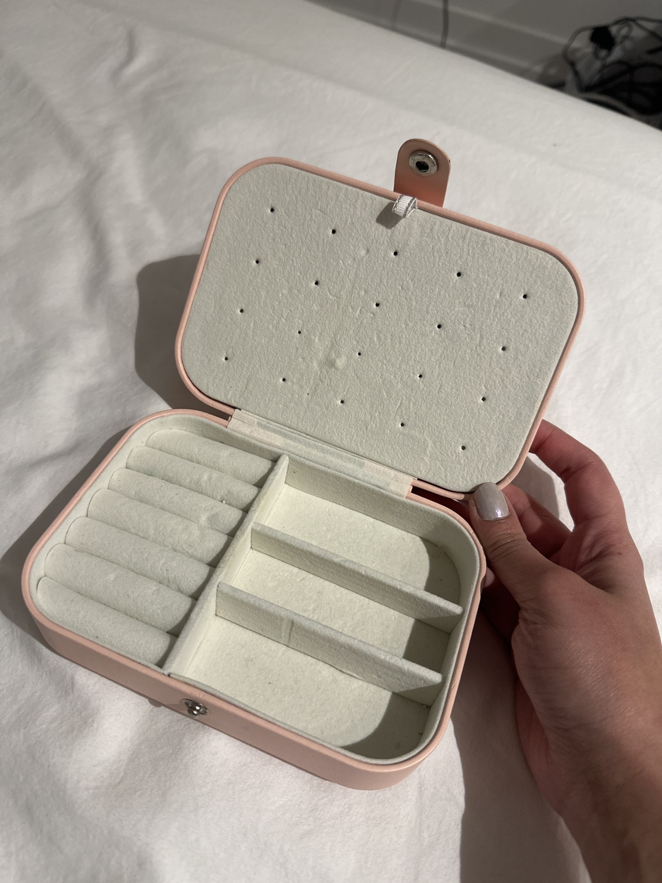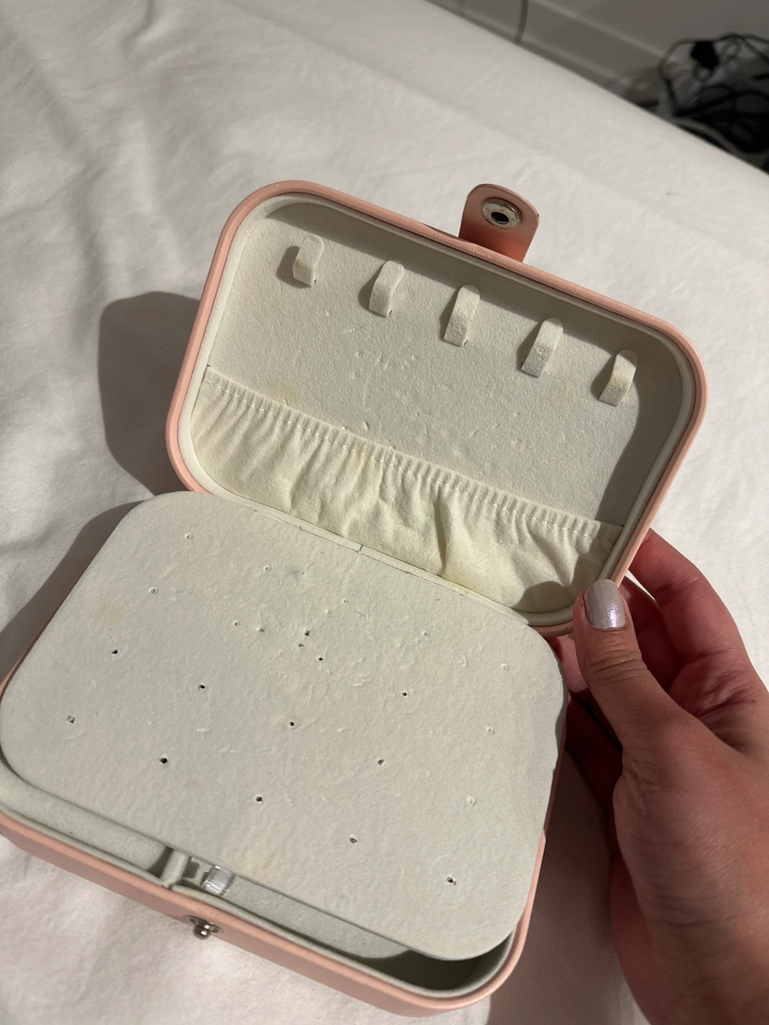This is a pink jewelry box. It has several compartments for rings, earrings, and other jewelry. Cash only.