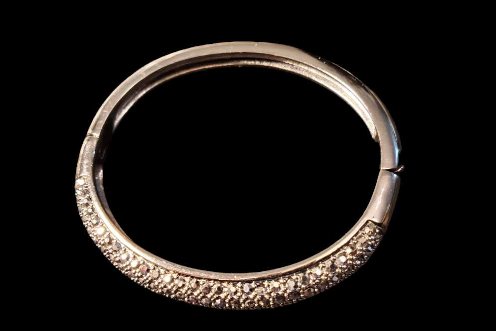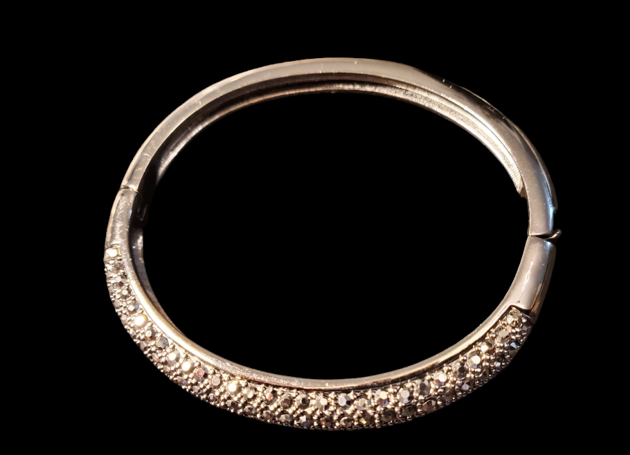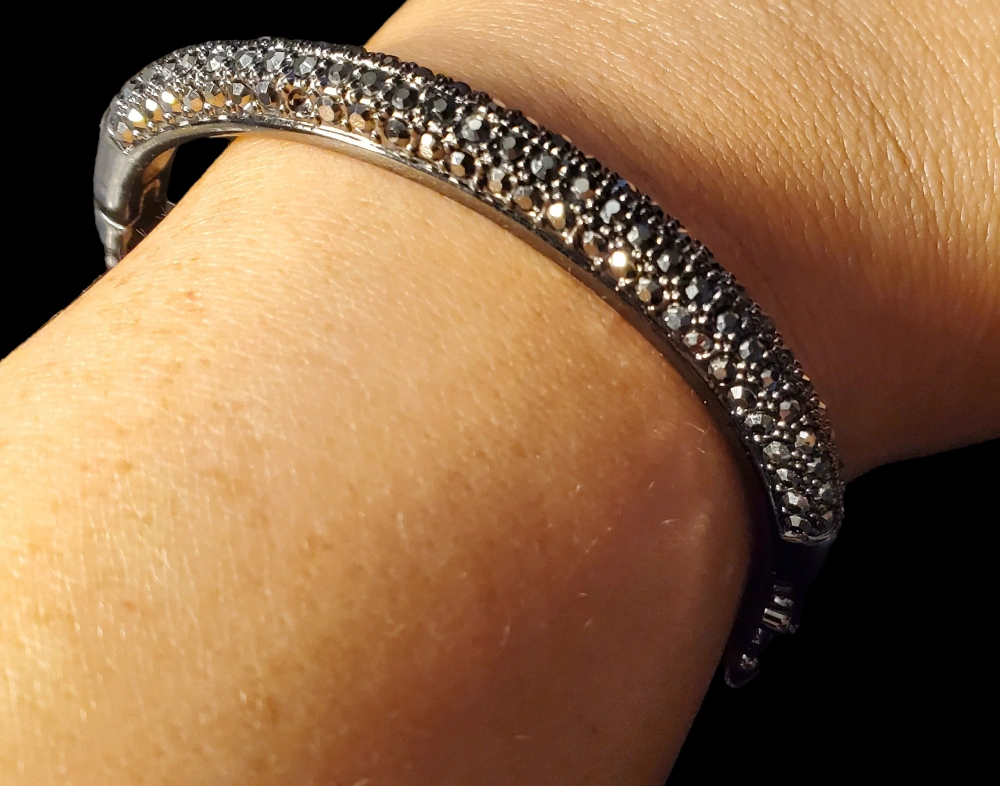 A beautiful Lia Sophia glitterati bangle bracelet with a row of rhinestones around the half band. Gun metal.