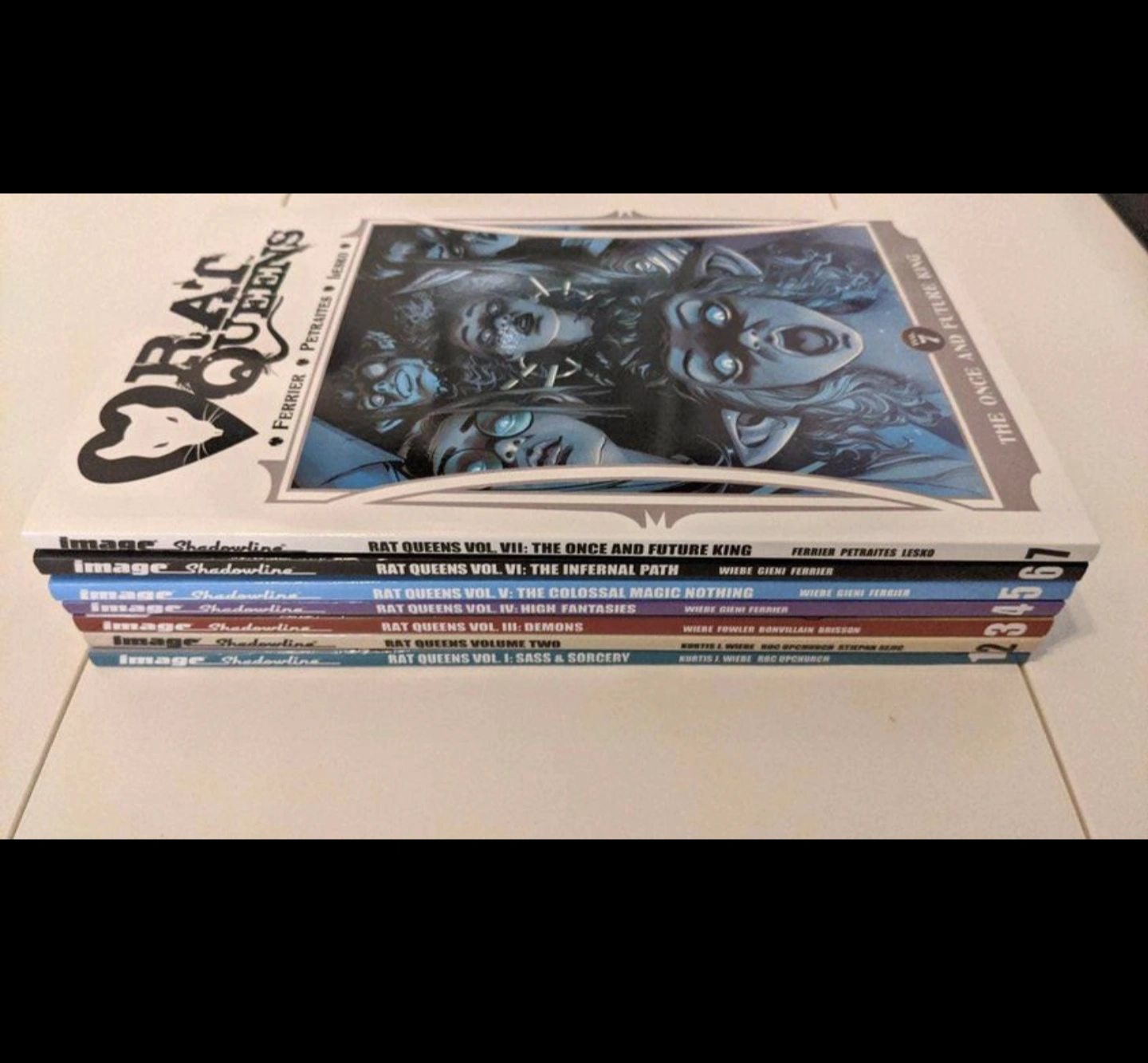 Rat Queens TPB Vol 1-7 Graphic Novel Comic Books "Who are the Rat Queens? A pack of booze-guzzling, death-dealing battle maidens-for-hire, and they're in the business of killing all god's creatures for profit. It's also a darkly comedic sass-and-sorcery series starring Hannah the Rockabilly Elven Mage, Violet the Hipster Dwarven Fighter, Dee the Atheist Human Cleric and Betty the Hippy Smidgen Thief. This modern spin on an old school genre is a violent monster-killing epic that is like Buffy meets Tank Girl in a Lord of the Rings world on crack!"