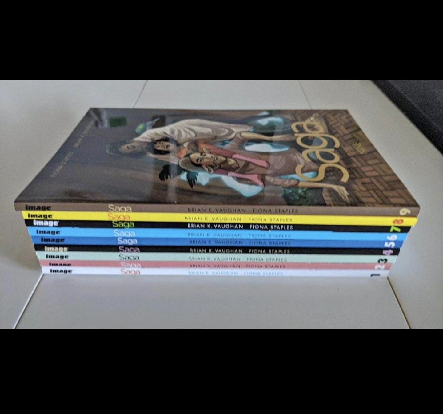Saga TPB's Vol 1-9 Graphic Novels Image Comics Comic Book Brian K Vaughan "Saga is an epic space opera/fantasy comic book series created by writer Brian K. Vaughan and artist Fiona Staples, published monthly by Image Comics. The series is heavily influenced by Star Wars, and based on ideas Vaughan conceived both as a child and as a parent. It depicts two lovers from long-warring extraterrestrial races, Alana and Marko, fleeing authorities from both sides of a galactic war as they struggle to care for their newborn daughter, Hazel, who occasionally narrates the series."