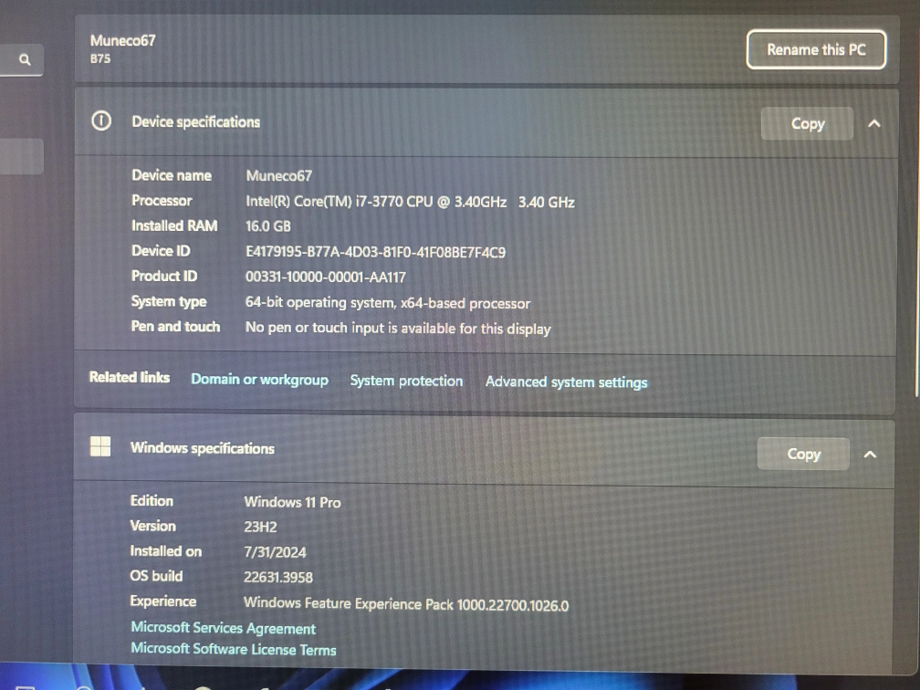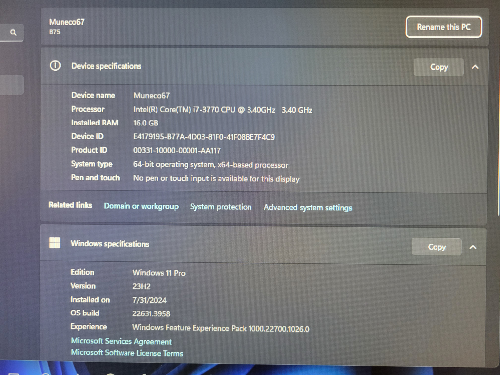 System pretty good i7 3770 3.4 mhz 4c/8t New cpu Cooler 21" inch HP monitor 1080p pretty good if you buy the this pc it's free the monitor Keyboard (wired) wireless mouse Memory 16gb skills Sniper 2x8 gb m.2 256gb + 240 ssd crucial store , I can add 1tb hdd free 4gb Asus RX550 in Amazon value $1,056 650w power supply Case Thermal Versa h17 black micro-atx, 3 fans very good cooling system, tell me if you want windows 10 or 11 pro price Firm Pick up only Cash or e-transfer price Firm
