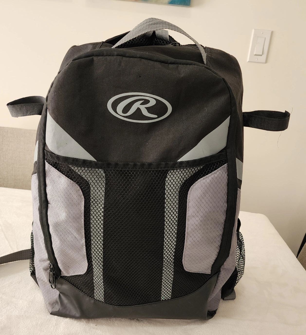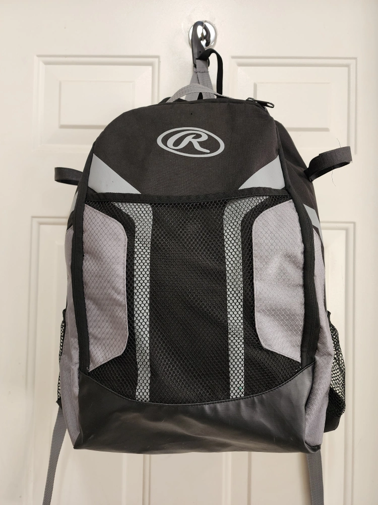Rawlings Black and grey baseball backpack with a mesh pocket and multiple storage compartments. Hods helmet, bats. great condition.