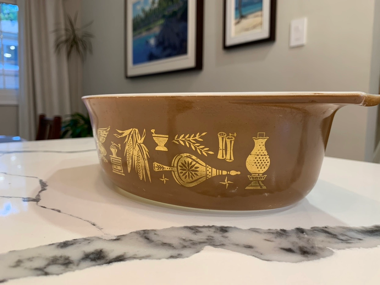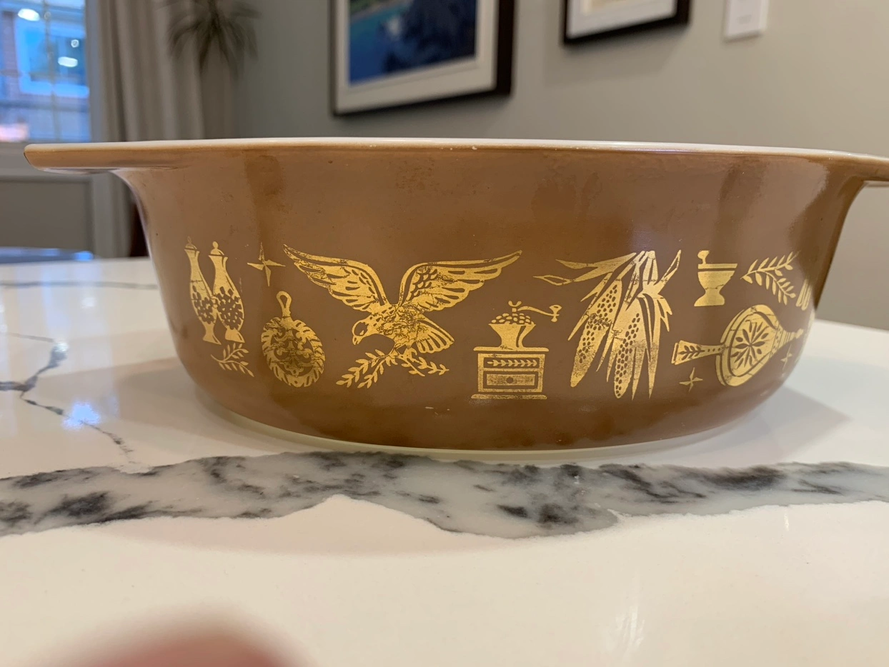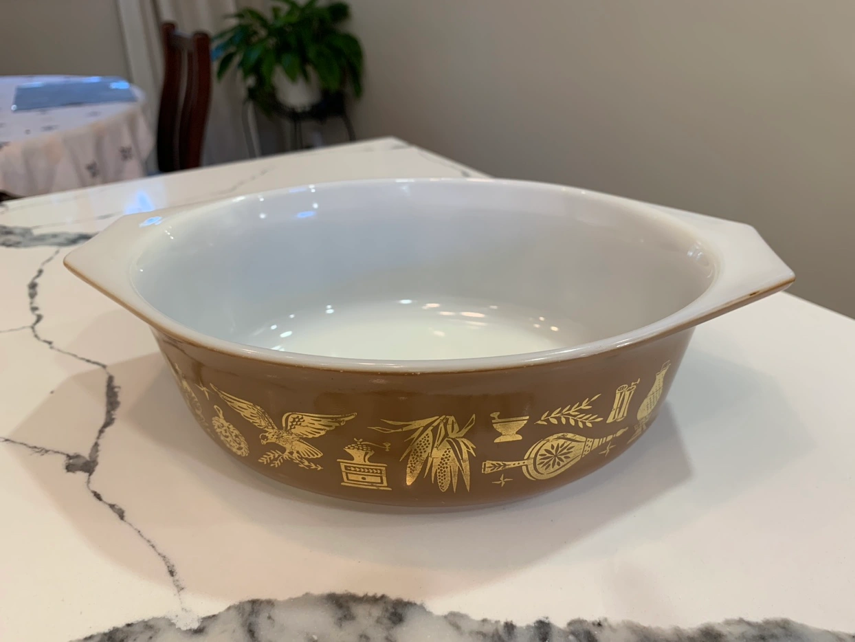 1960s brown Pyrex Early America series 1 1/2 quart casserole dish. A must for any collector. In very good condition with minor wear marks as shown in the photos. Gold early American designs including an eagle, coffee grinder, star, corn, mortar and pestle, and oil lamp. Pickup in Thornhill near Yonge Street and Royal Orchard Blvd. View my other listings for more vintage and unique finds.