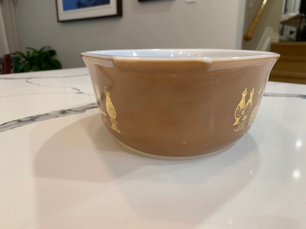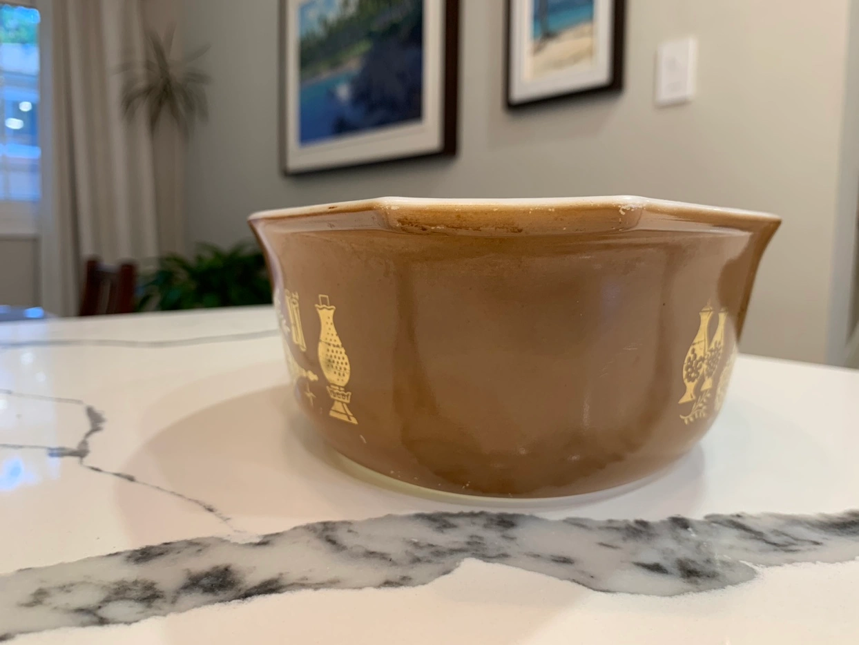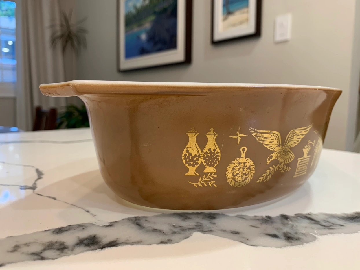 1960s brown Pyrex Early America series 1 1/2 quart casserole dish. A must for any collector. In very good condition with minor wear marks as shown in the photos. Gold early American designs including an eagle, coffee grinder, star, corn, mortar and pestle, and oil lamp. Pickup in Thornhill near Yonge Street and Royal Orchard Blvd. View my other listings for more vintage and unique finds.