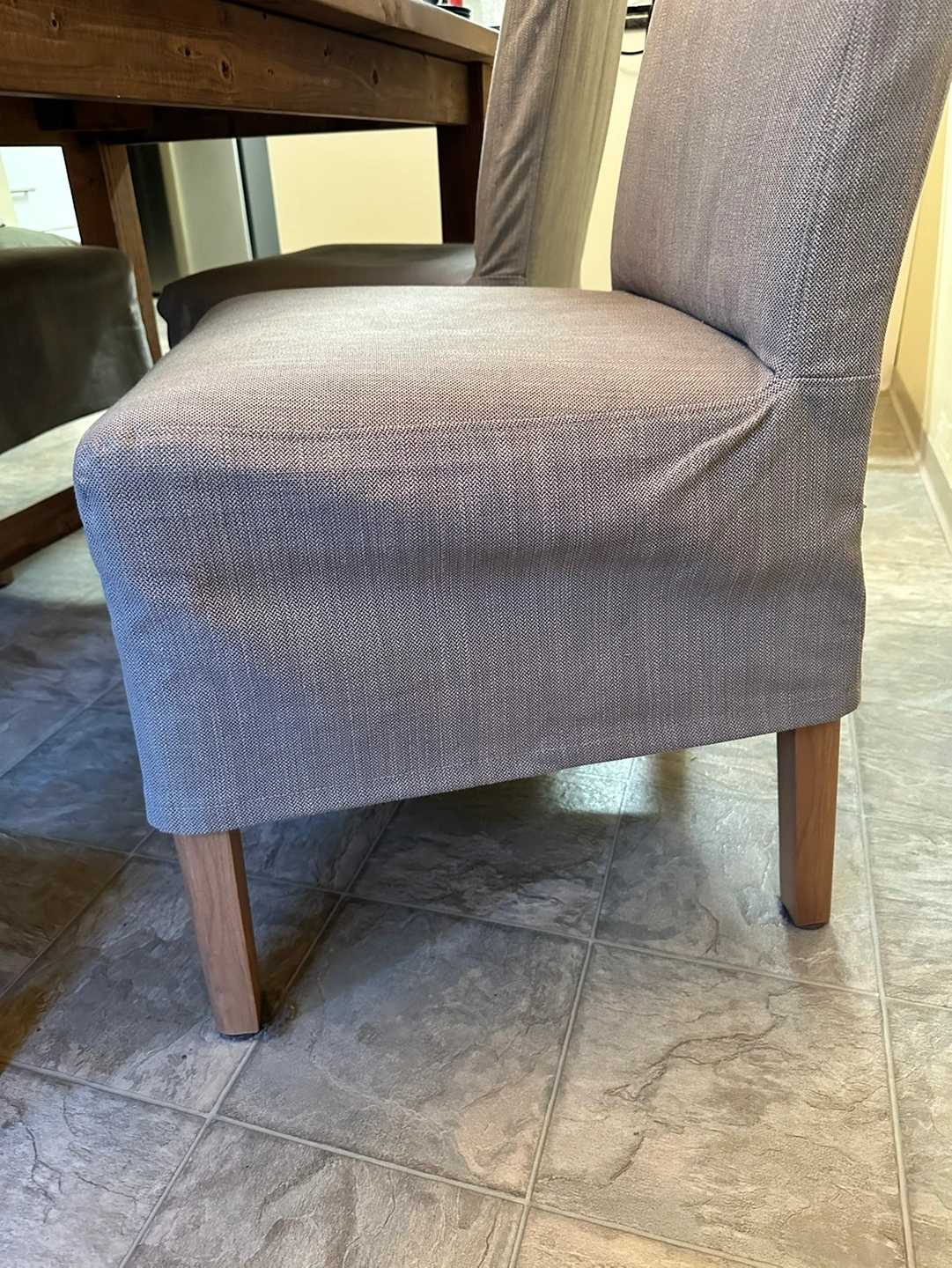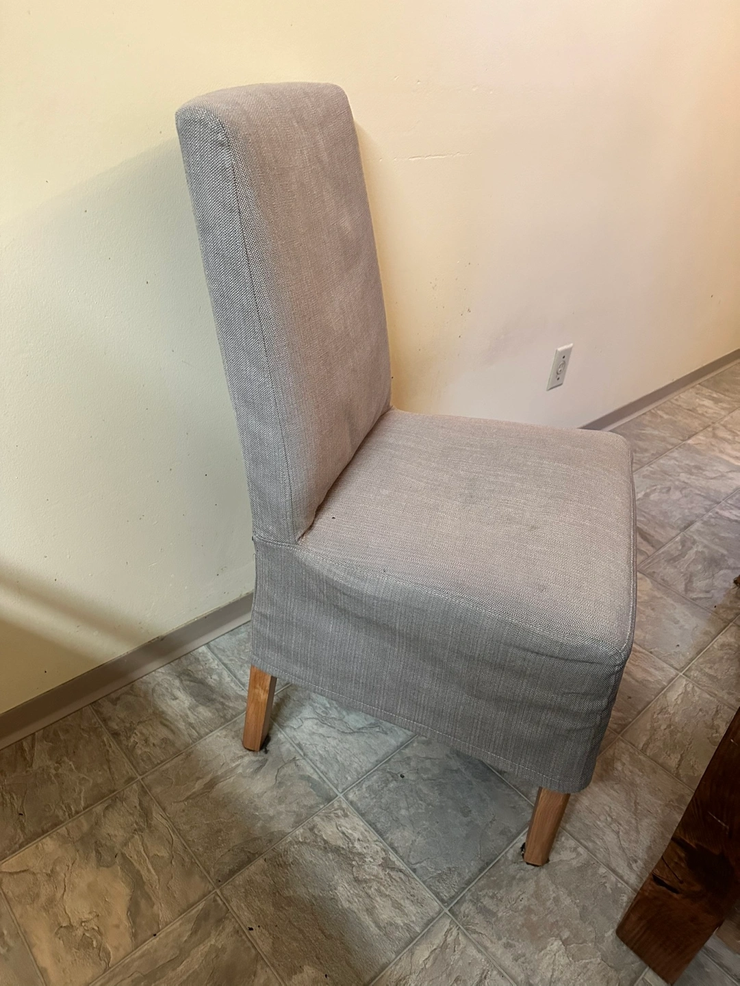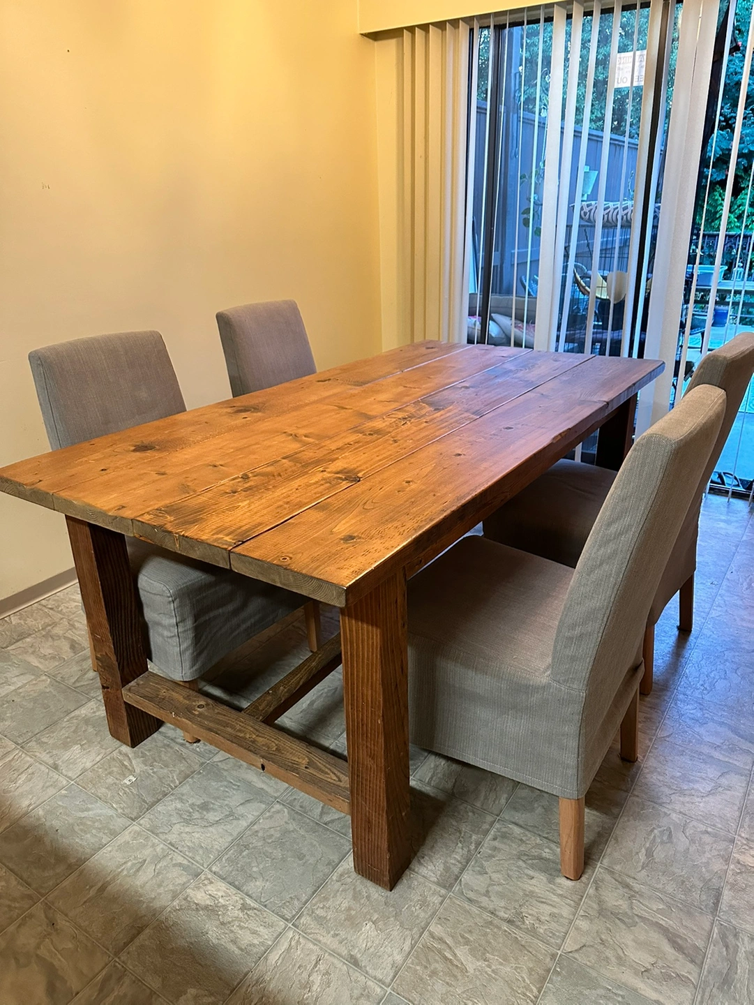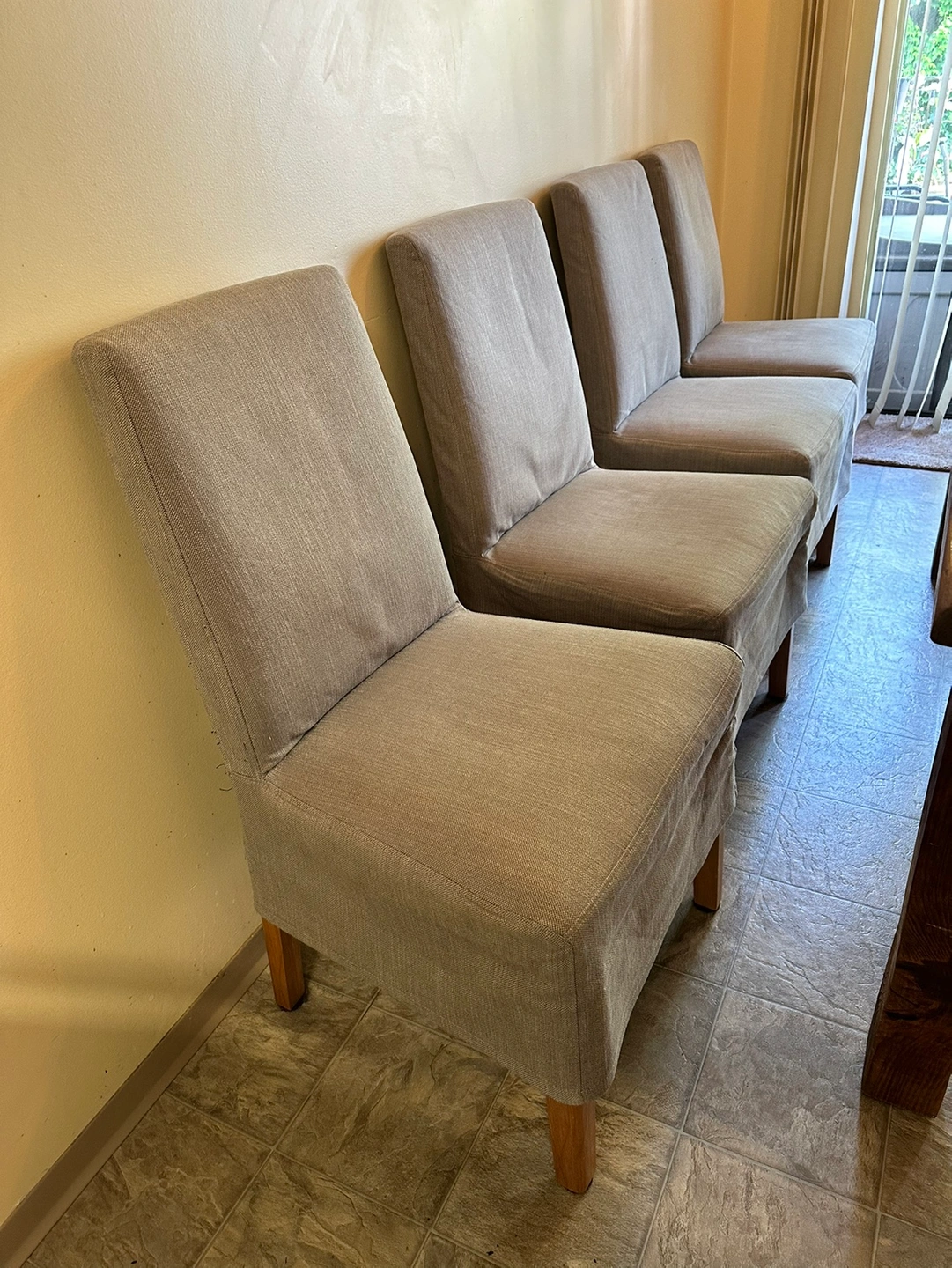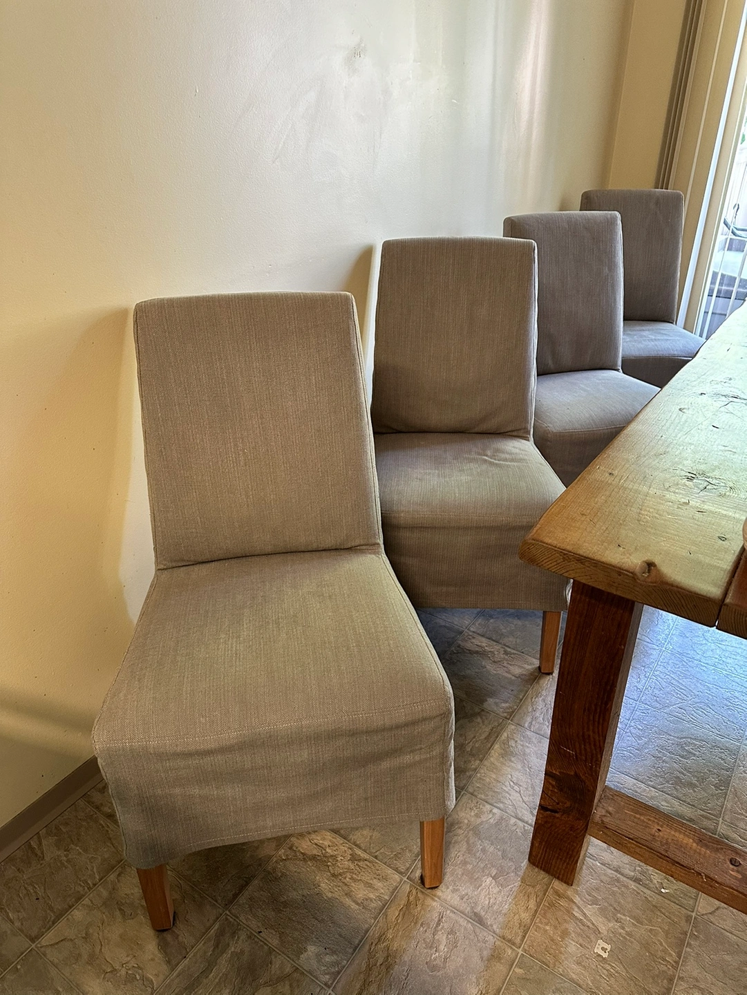 π‘ Please check out my other listings, you may want to bundle with other stuff Thank you. π 4 CHAIRS upholstered grey/beige cloth cover (Paid $145 each from ikea style Bergmund) Great condition. No tears or rips. Smoke free house. Washable cover, comfortable large seat aprox. 19"x17" with high back. TABLE NOT INCLUDED (It's now Reseved) $495 REDUCED to $450 Thick Rustic Real Solid wood dining table, simple design. Seats 4 to 6. Excellent condition. Sturdy construction. Will last forever. Designed & handmade by Natalie Martin owner of Timber and Co in North Vancouver. Bought it for $1200 Aprox.Size 72"x36"x31" height π΄ Pick Up from Burnaby. Canada Way & Royal Oak