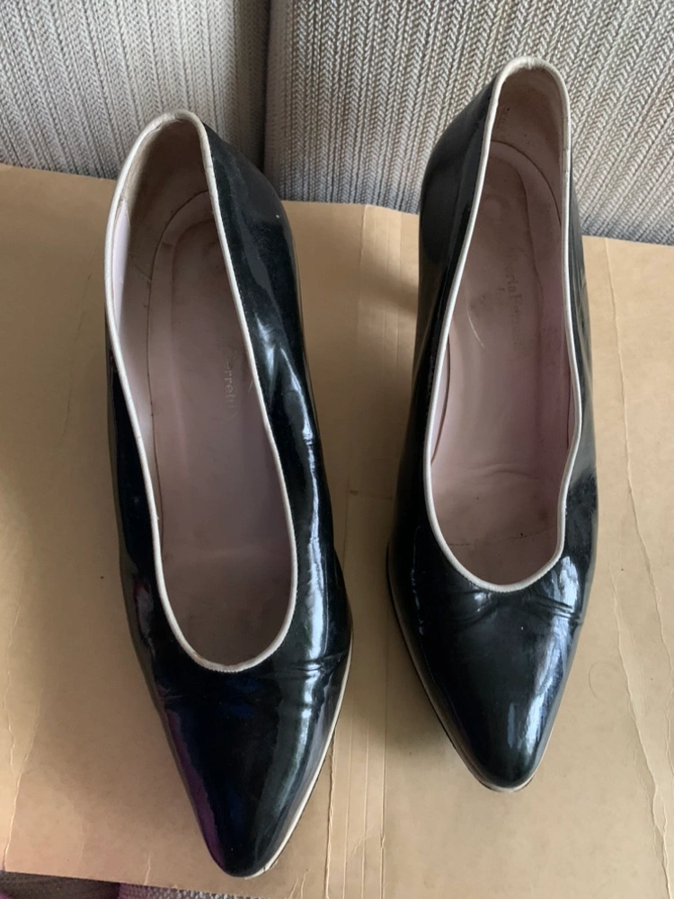 Black patent leather pumps with a white trim around the opening. Size 7 1/2 B. Made in Italy.