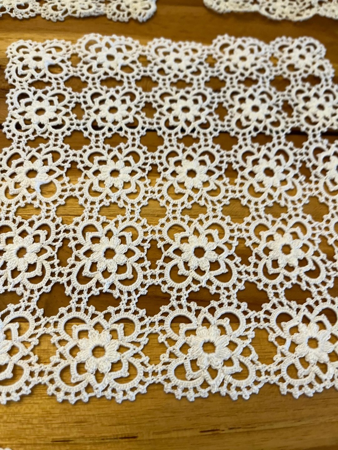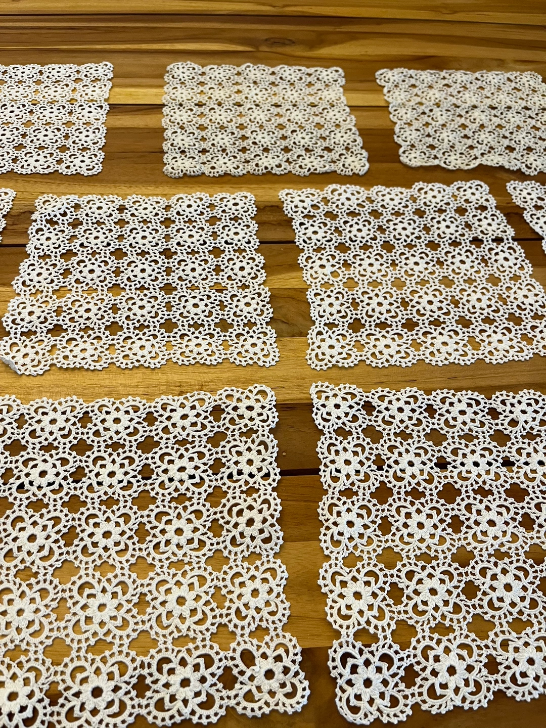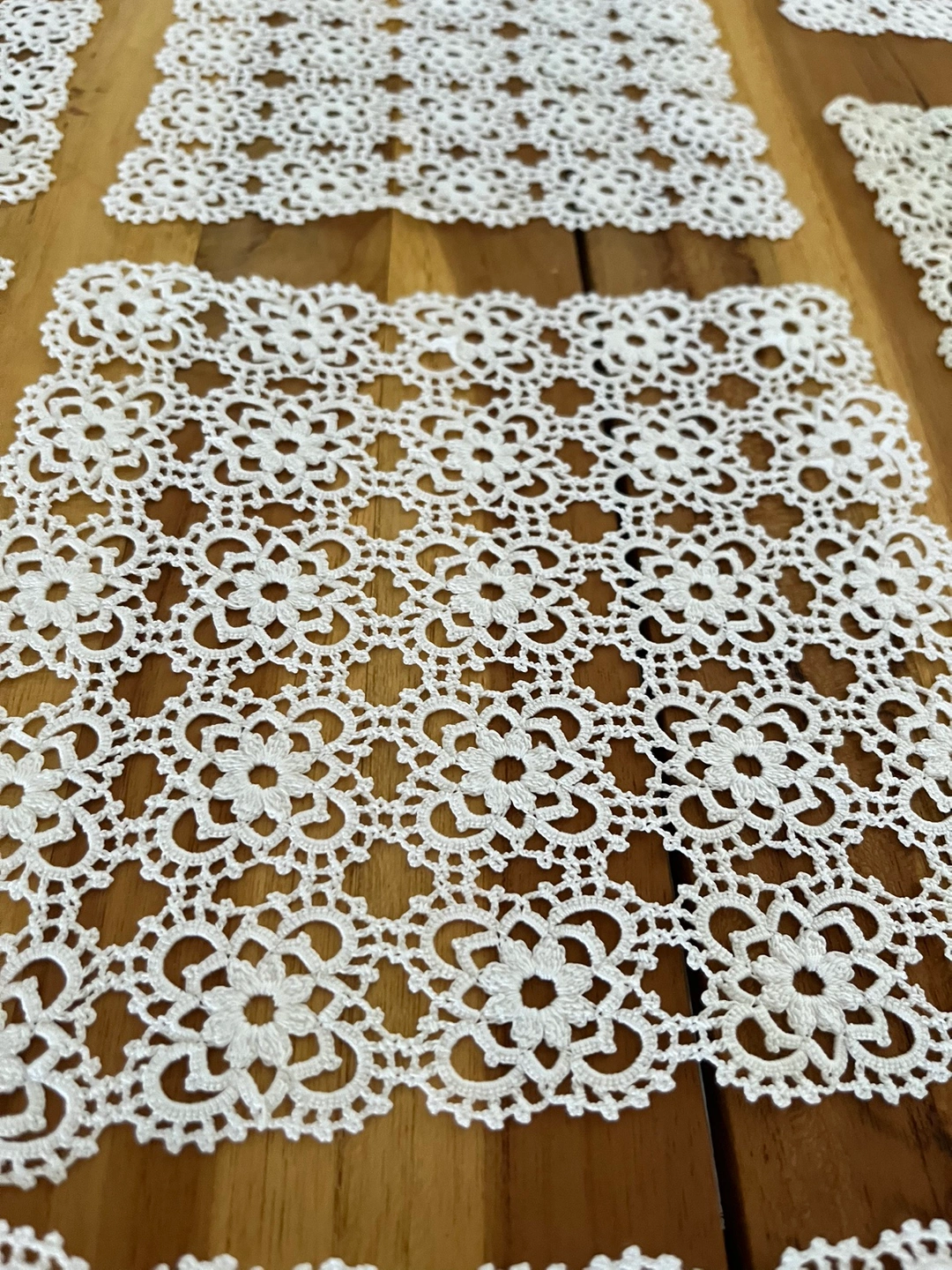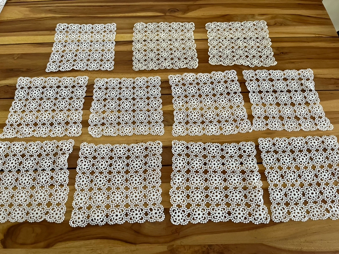 Handmade square lace doilies Size: 8cm x 8cm 11 identical pieces available Price: $30 each