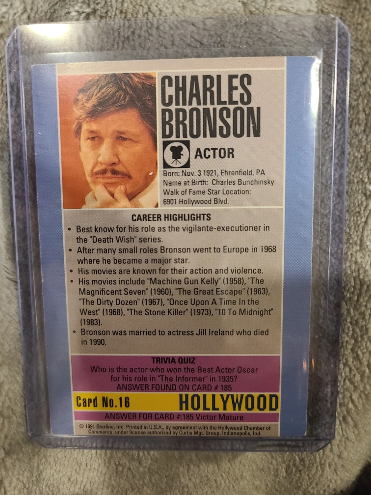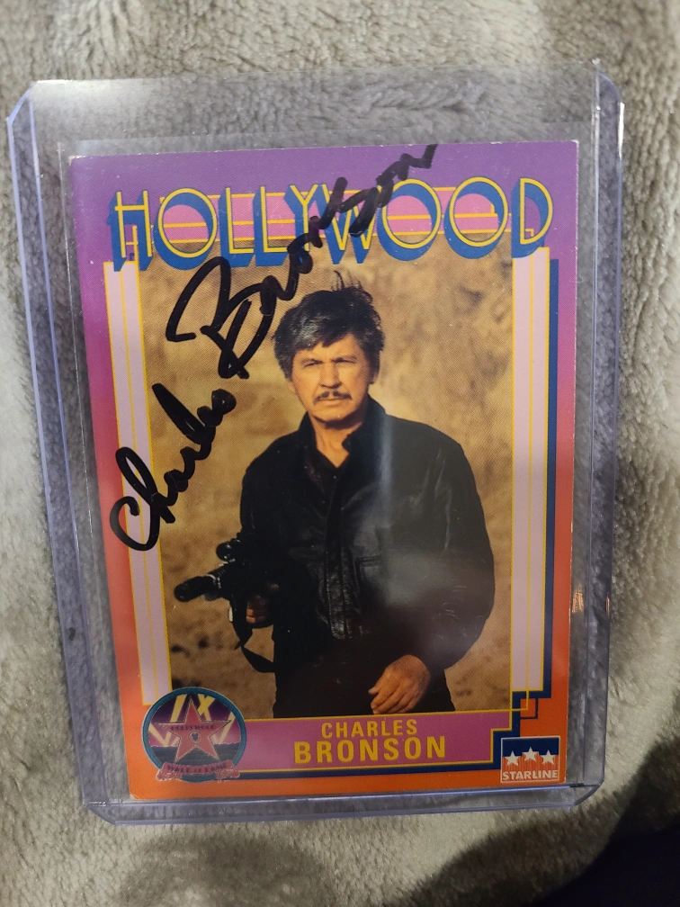 This is a signed trading card of actor Charles Bronson. The card is in a protective case. It is from the Hollywood Starline series. The back of the card features trivia about Charles Bronson.