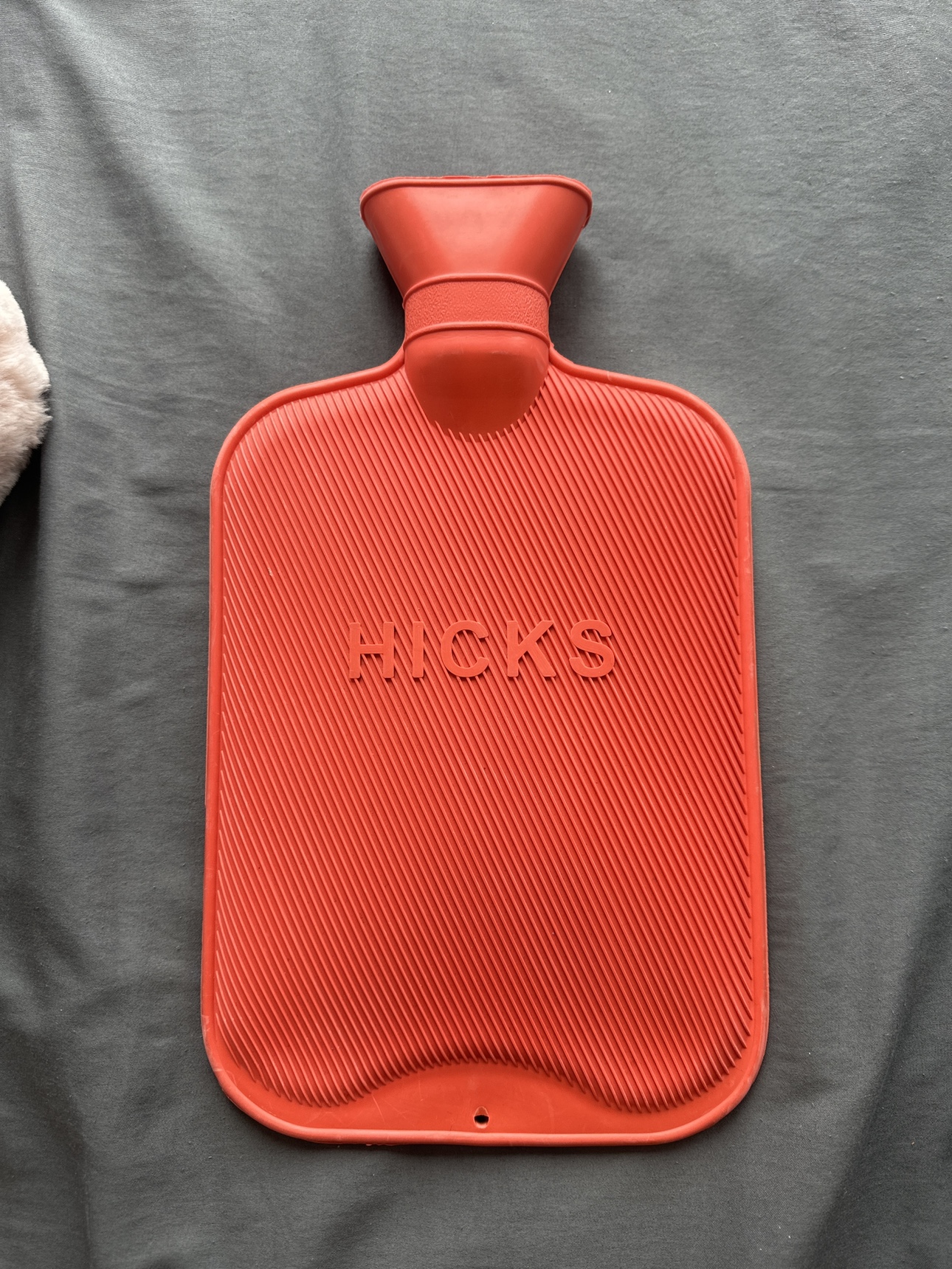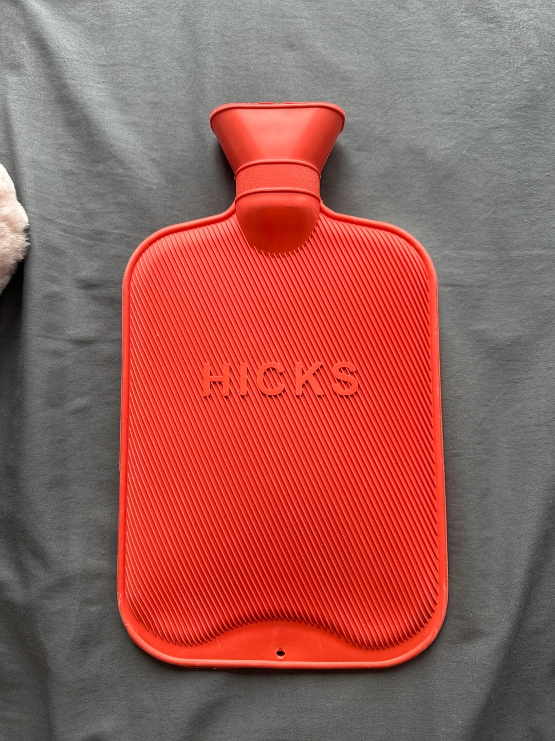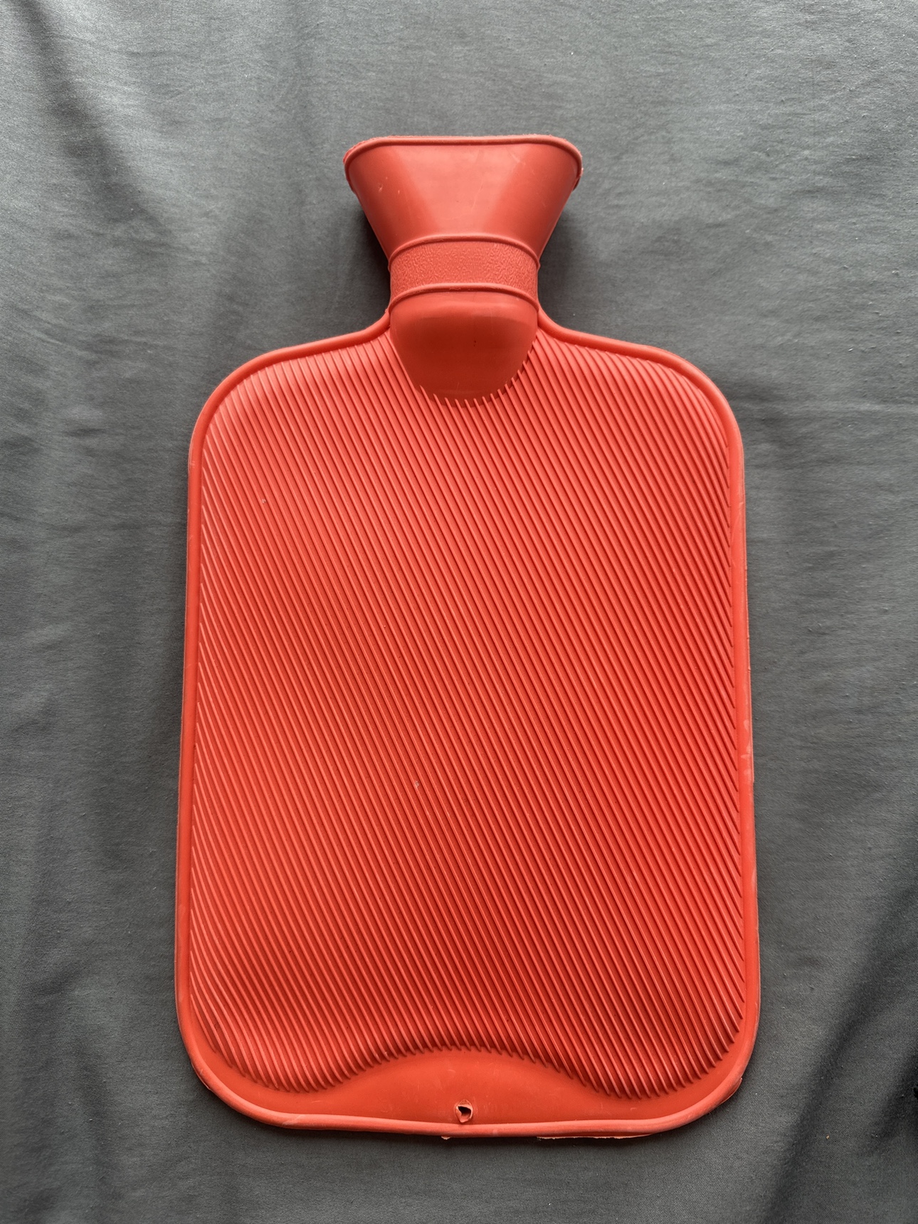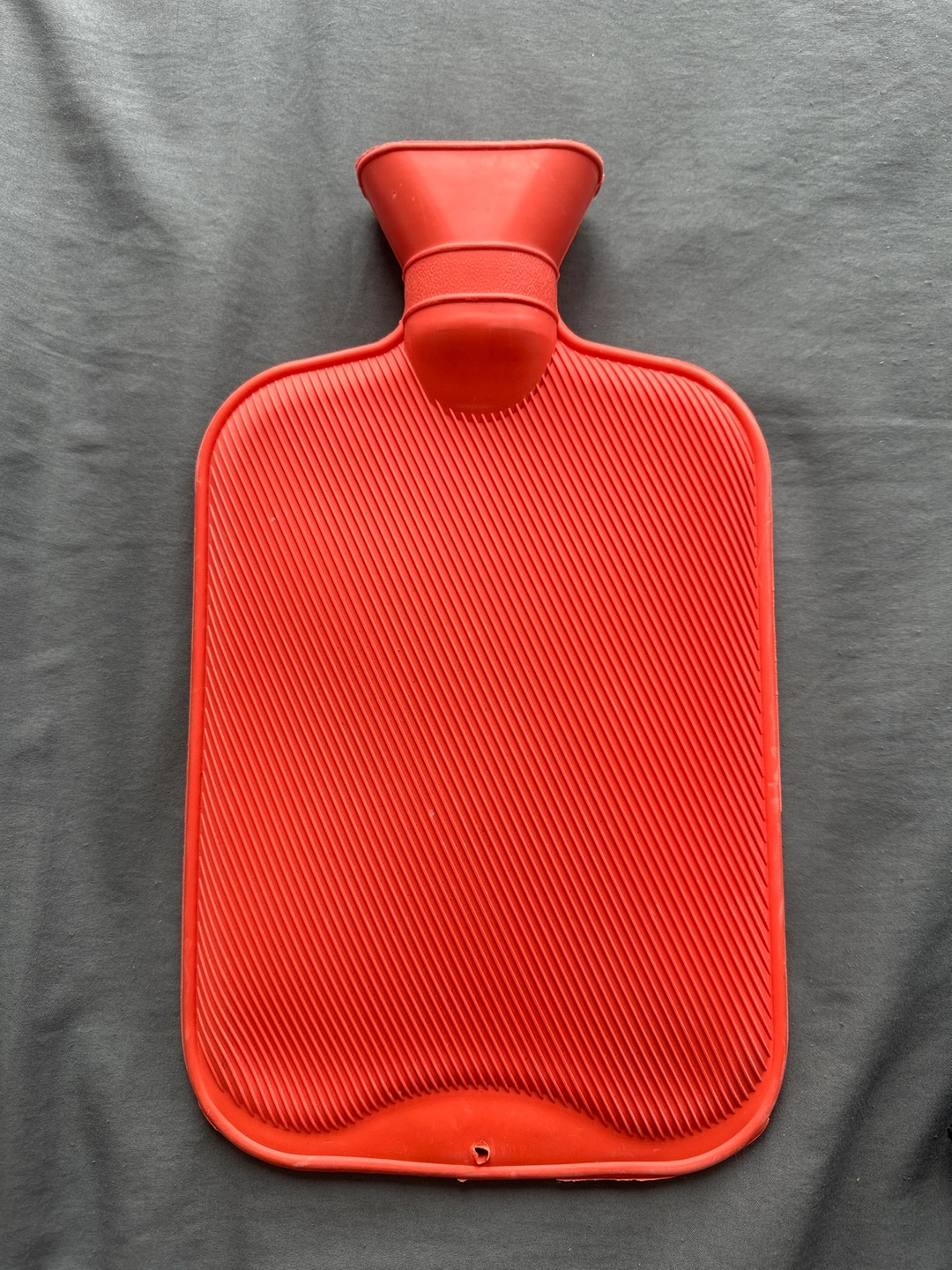 Red hot water bottle with a wide opening and a convenient carrying handle.