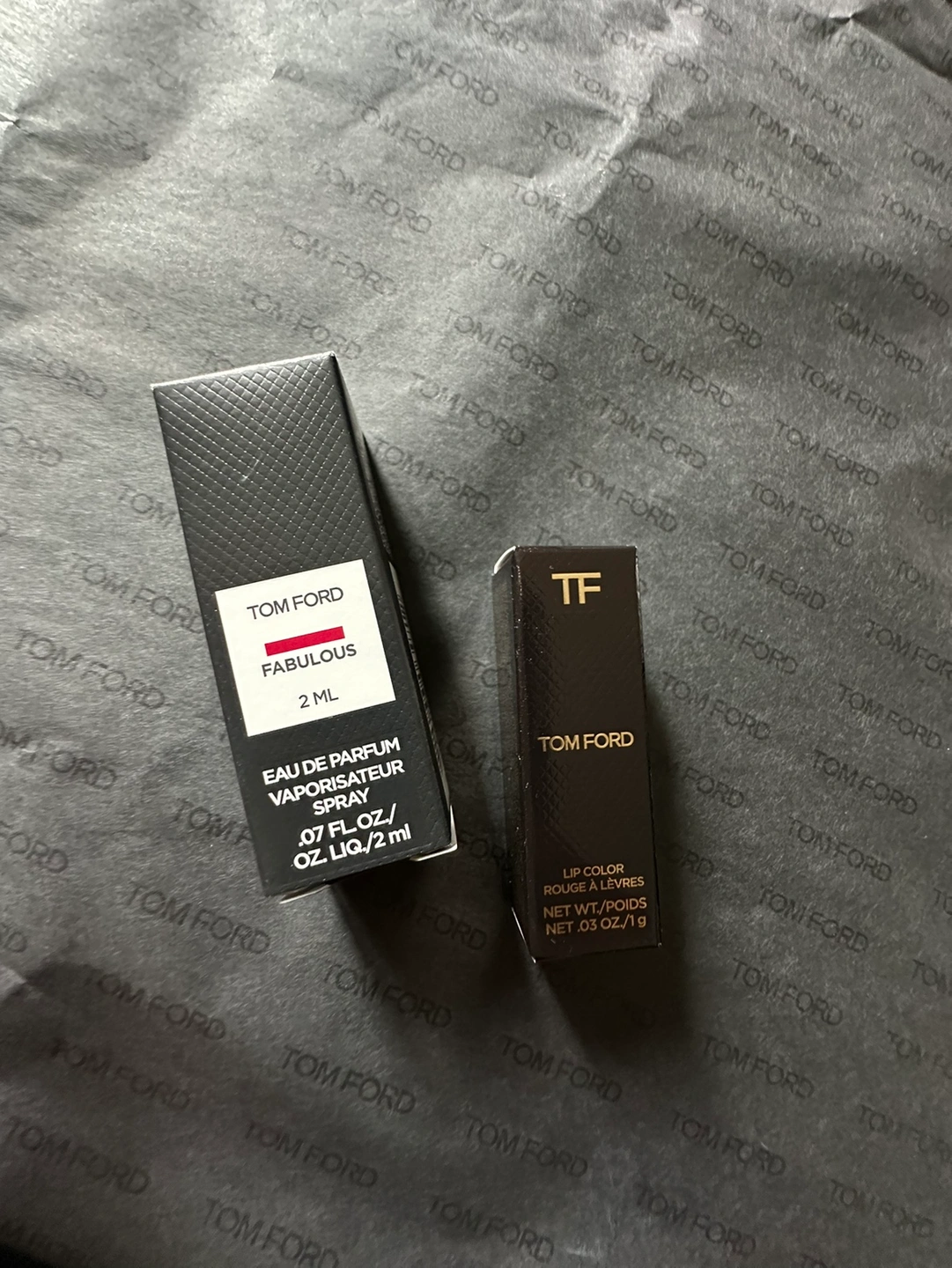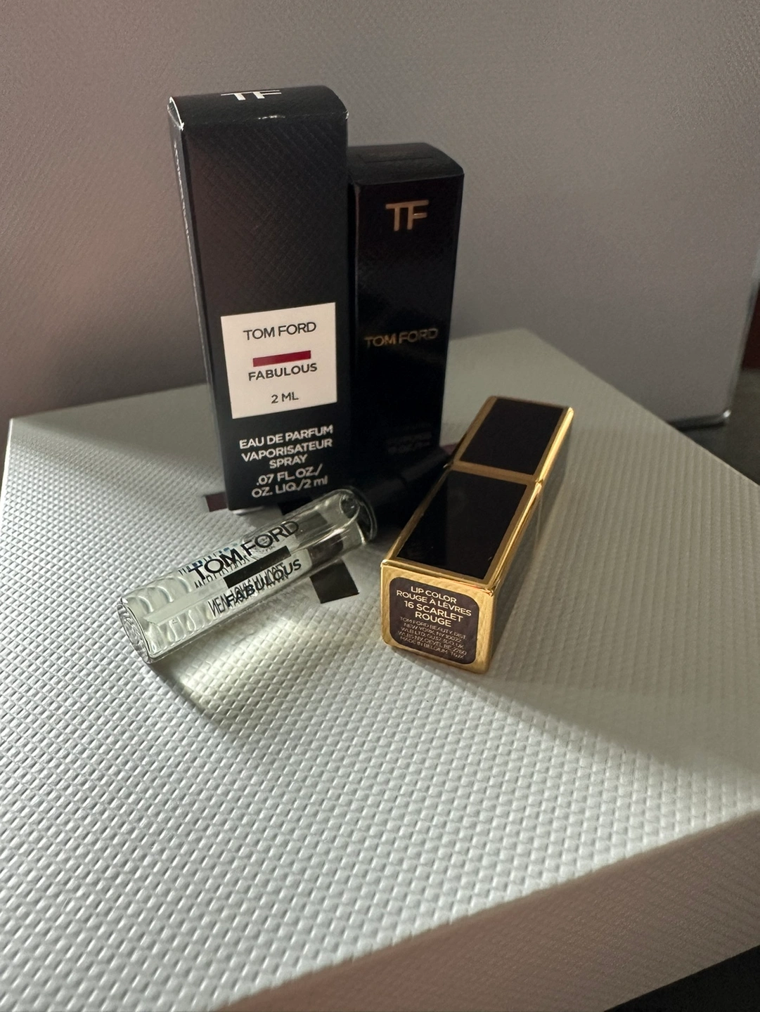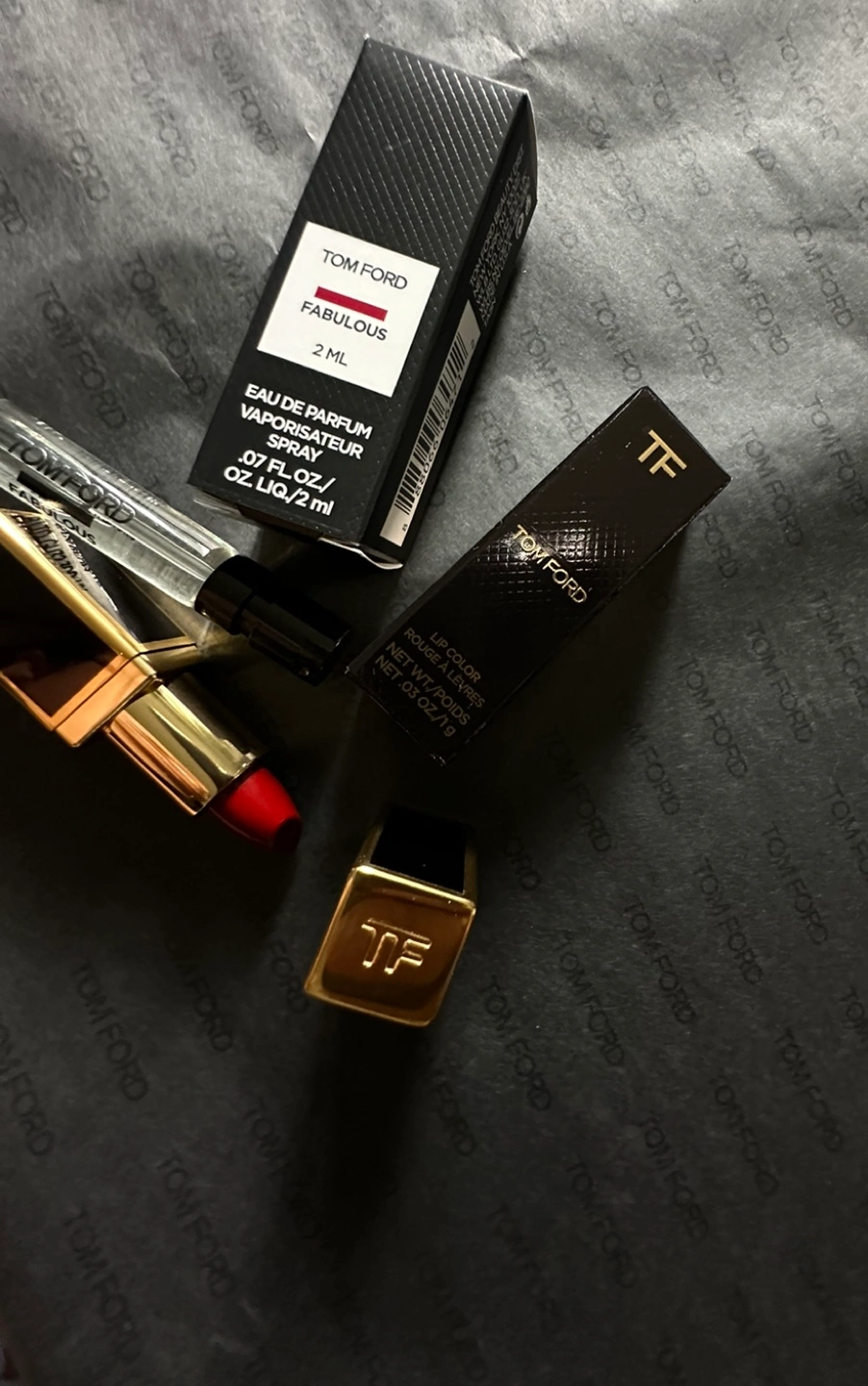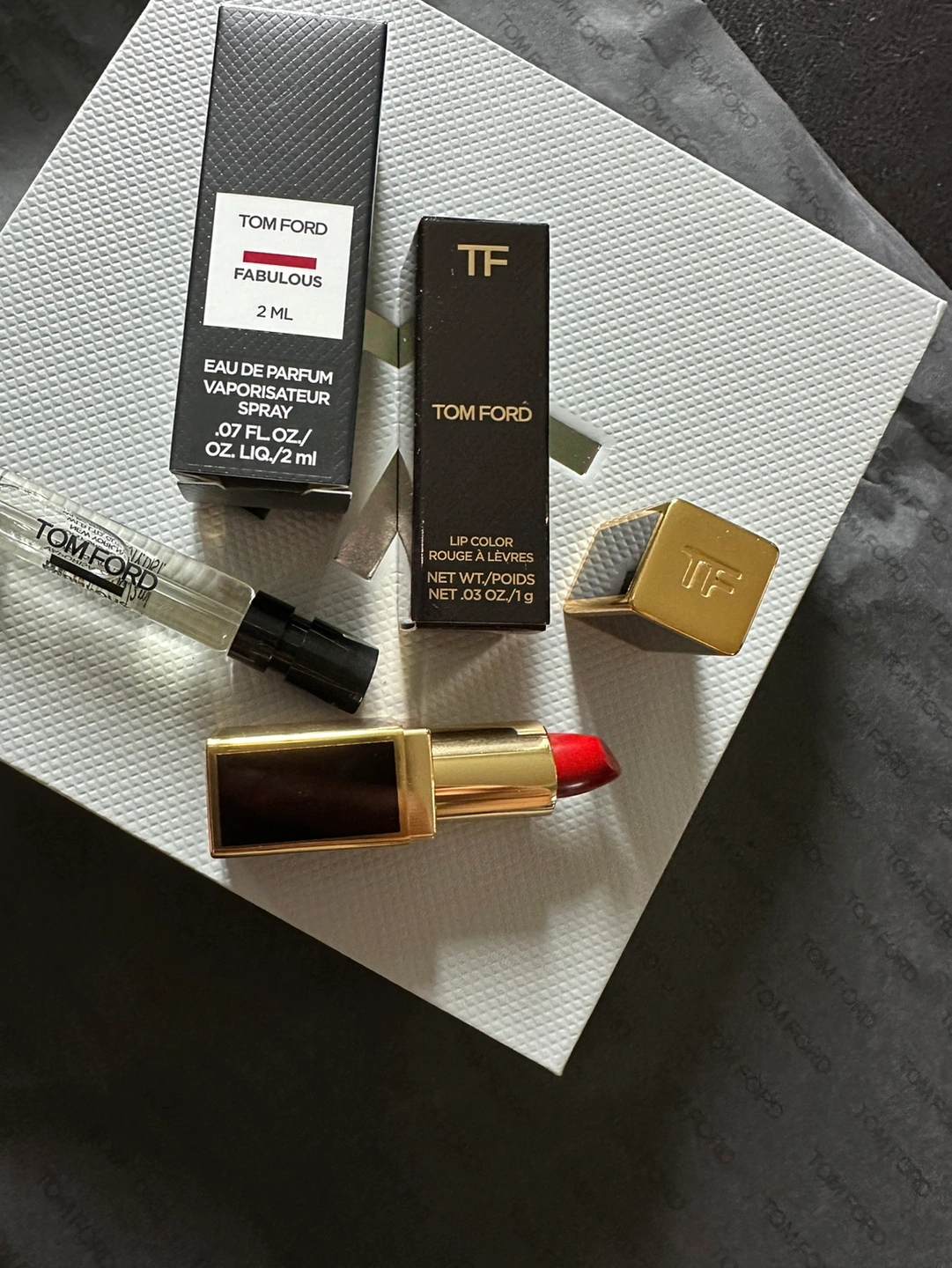 TOM FORD sample fragrance and mini 1g deluxe size lipstick in ‘Scarlet Rouge’ $15 SET PRICE good if you’re like me and like to carry mini size in your purse *DOES NOT COME with gift box. Only used to take photos